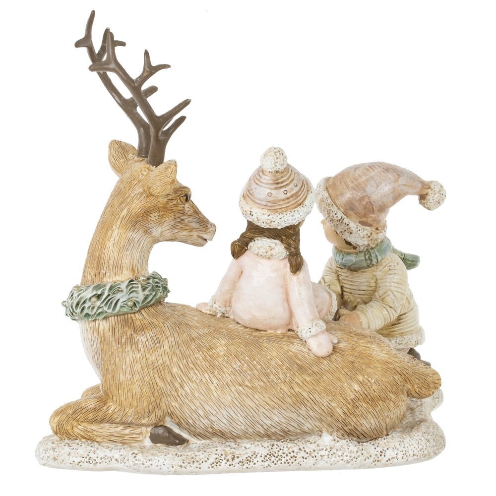 Декоративная фигурка "Олень и дети" из полистоуна наполнена теплом и радостью. Она изображает трогательную сцен, где мальчик и девочка играют с милым лесным оленем, который мирно лежит в спокойной позе. Девочка уютно устроилась на спине оленя, в то время как мальчик с заботой помогает ей надеть сапожок. Высокая детализация делает фигурку идеальным украшением интерьера к новогодним праздникам, добавляя в дом атмосферу уюта и волшебства.