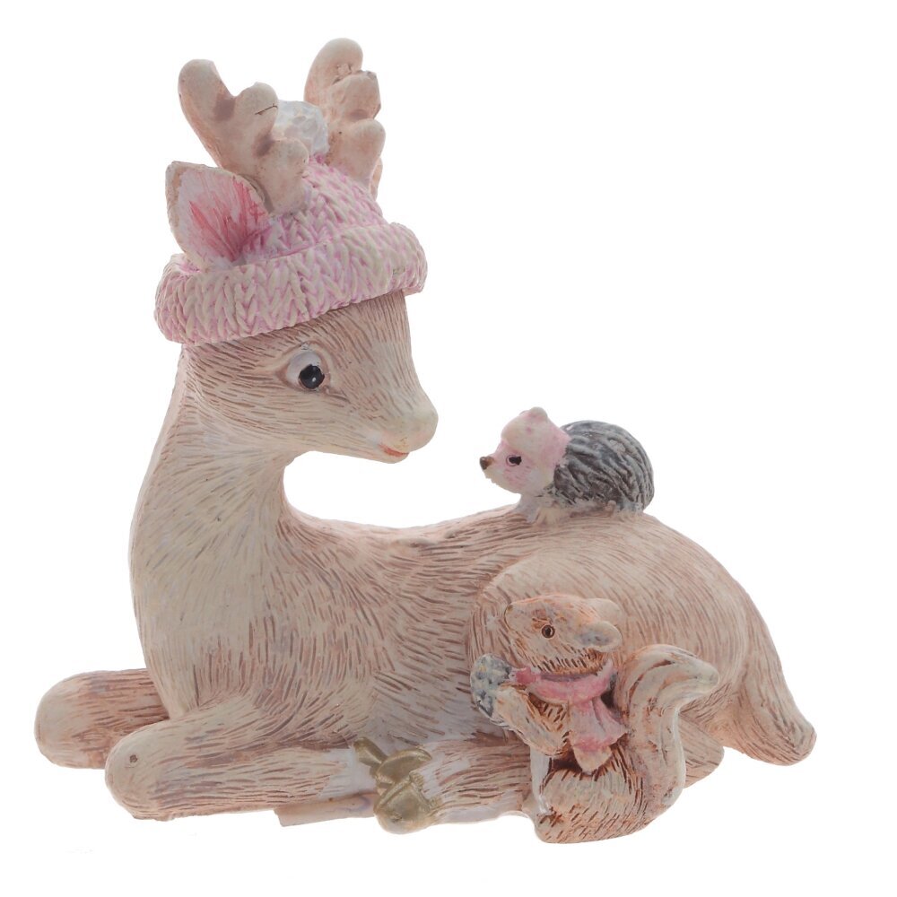 Декоративная фигурка "Олень" воплощает в себе атмосферу лесной сказки и дружбы. Этот милый олененок украшен вязанной шапочкой, что придает ему особый шарм. На его спине уютно расположился маленький ежик, а рядом белочка с шишкой. Каждый элемент фигурки тщательно проработан, передавая теплоту и уют зимнего леса. Такой сувенир станет не только оригинальным украшением интерьера, но и прекрасным символом дружбы и гармонии с природой в вашем доме.