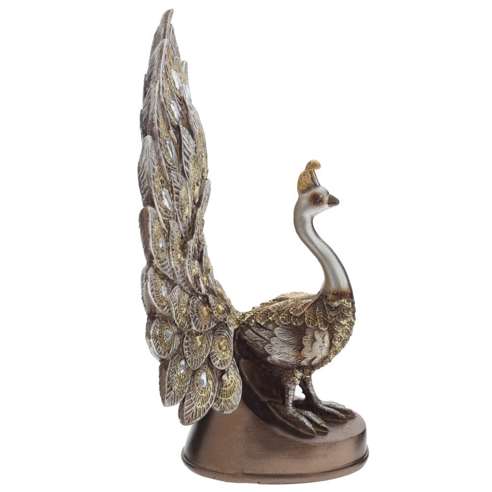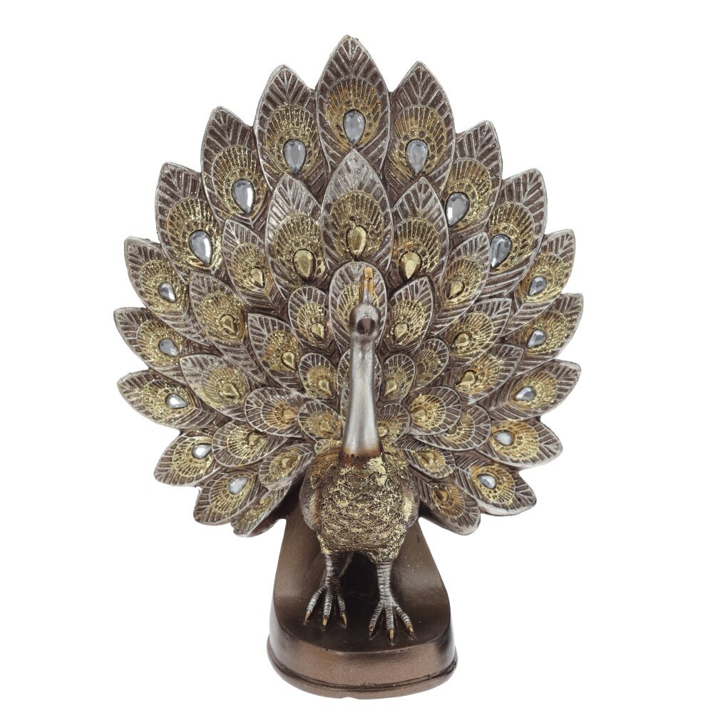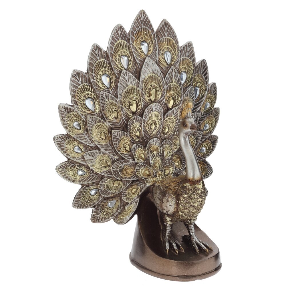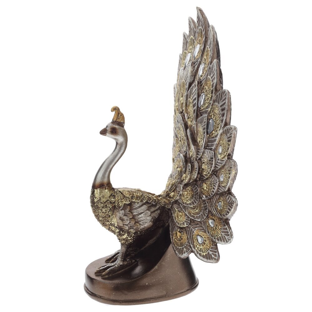 Элегантная декоративная фигурка «Павлин» станет ярким акцентом в интерьере гостиной, спальни или кабинета. Изделие выполнено из прочных полимерных материалов, устойчивых к выцветанию и мелким повреждениям. Роскошный хвост павлина раскрыт веером и детально проработан: рельефные перья с золотистым напылением дополнены вставками под кристаллы, которые красиво переливаются при искусственном и дневном освещении. Благородные бронзово?золотые оттенки придают фигуре статусный, немного винтажный вид и легко сочетаются как с классическим, так и с современным стилем оформления. Фигурка отлично подойдёт в качестве подарка на новоселье, юбилей или просто как изысканное украшение для дома, подоконника, каминной полки или рабочего стола.