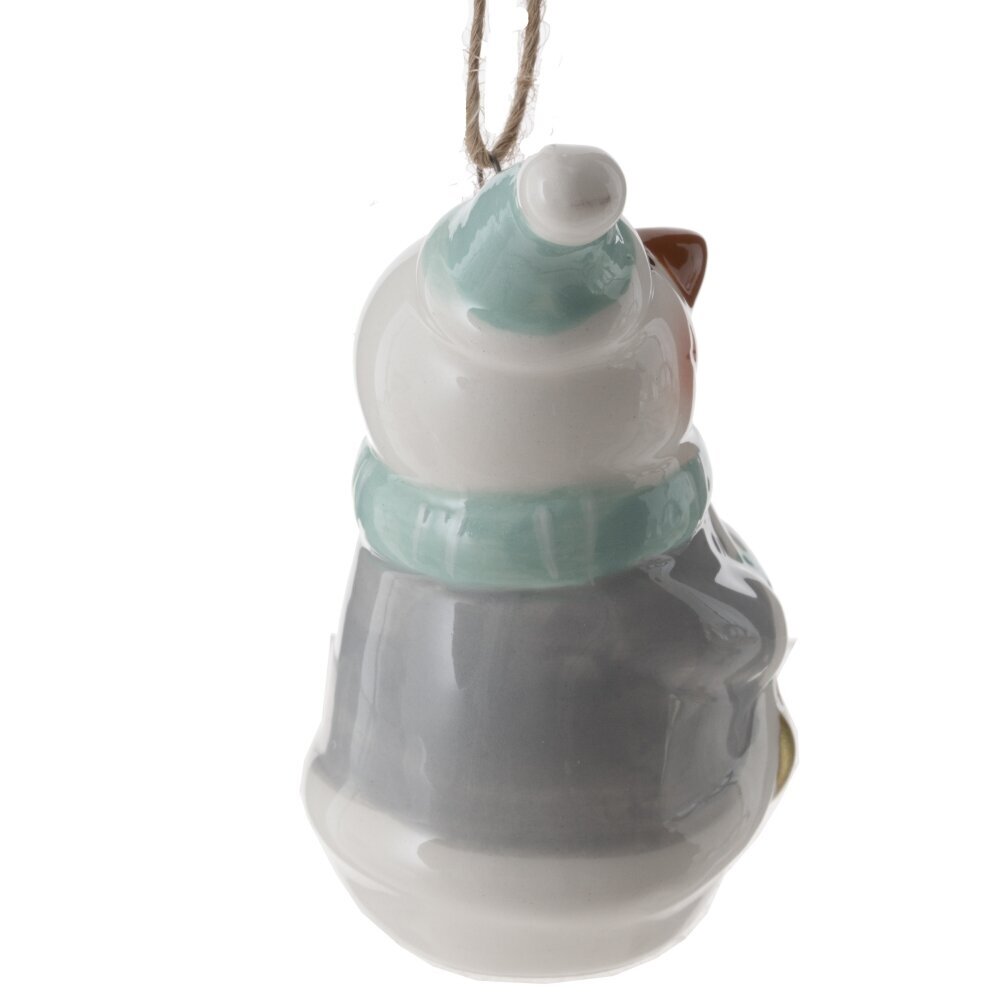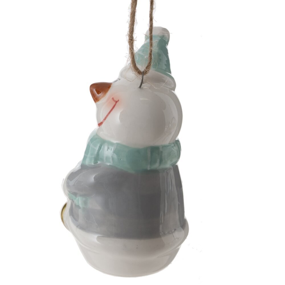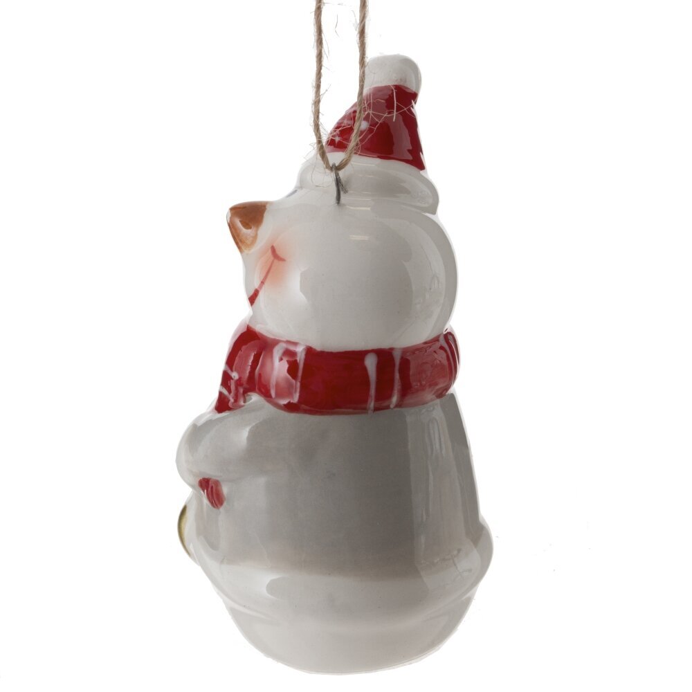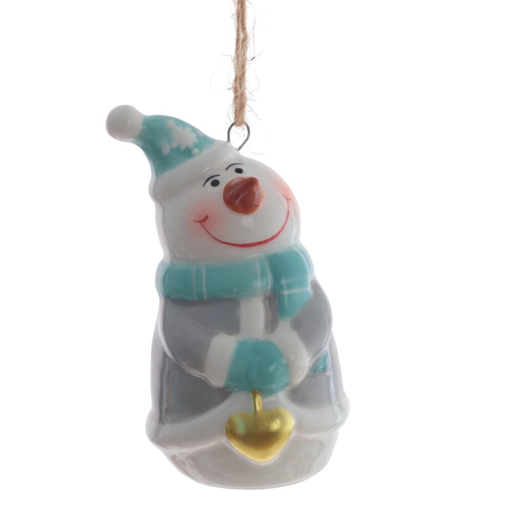 Подвесное новогоднее украшение “Снеговик”. Эта милая фигурка с воздушным дизайном станет прекрасным дополнением к вашему зимнему декору, придавая ему атмосферу сказки и уюта.Фигурка выполнена из керамики и покрыта глянцевой глазурью,которая придает блеск. Дизайн подвески создает ощущение легкости и нежности, что делает ее идеальным украшением для новогоднего праздника.