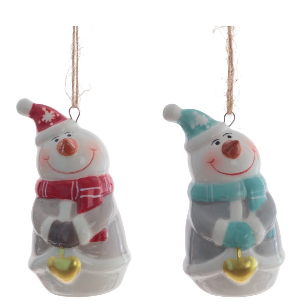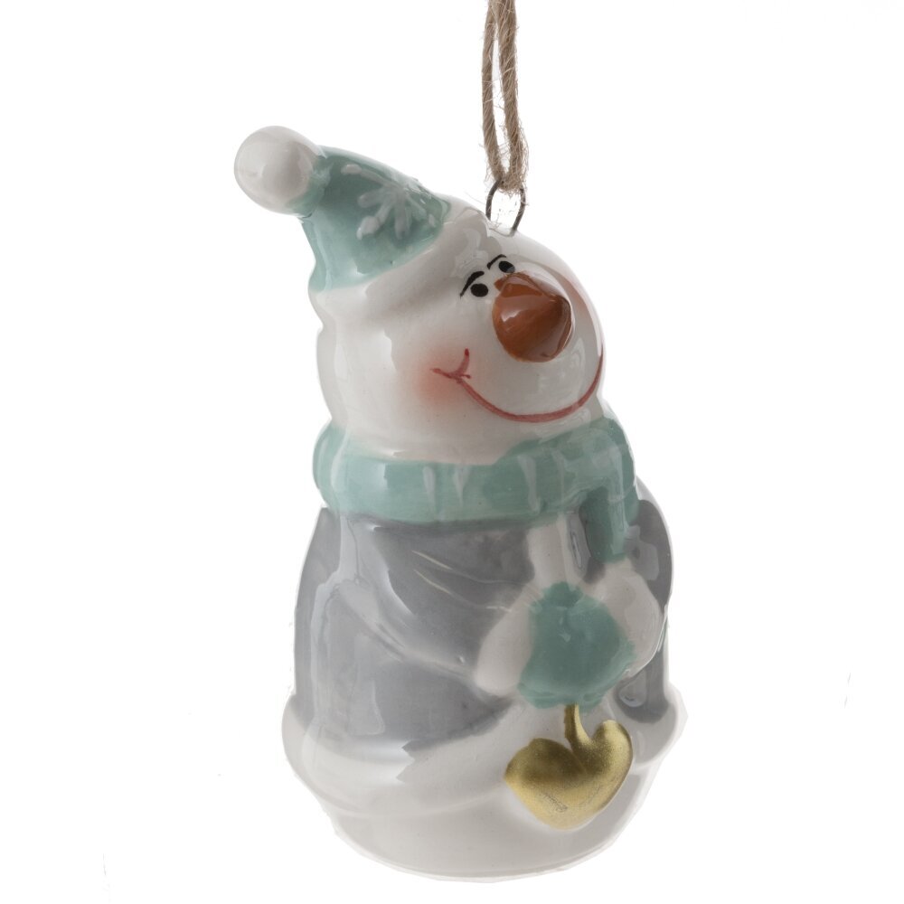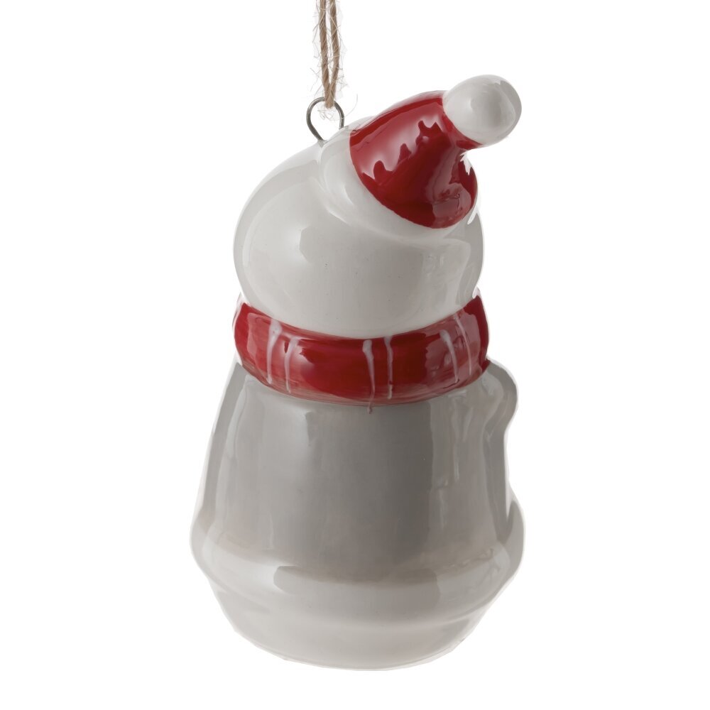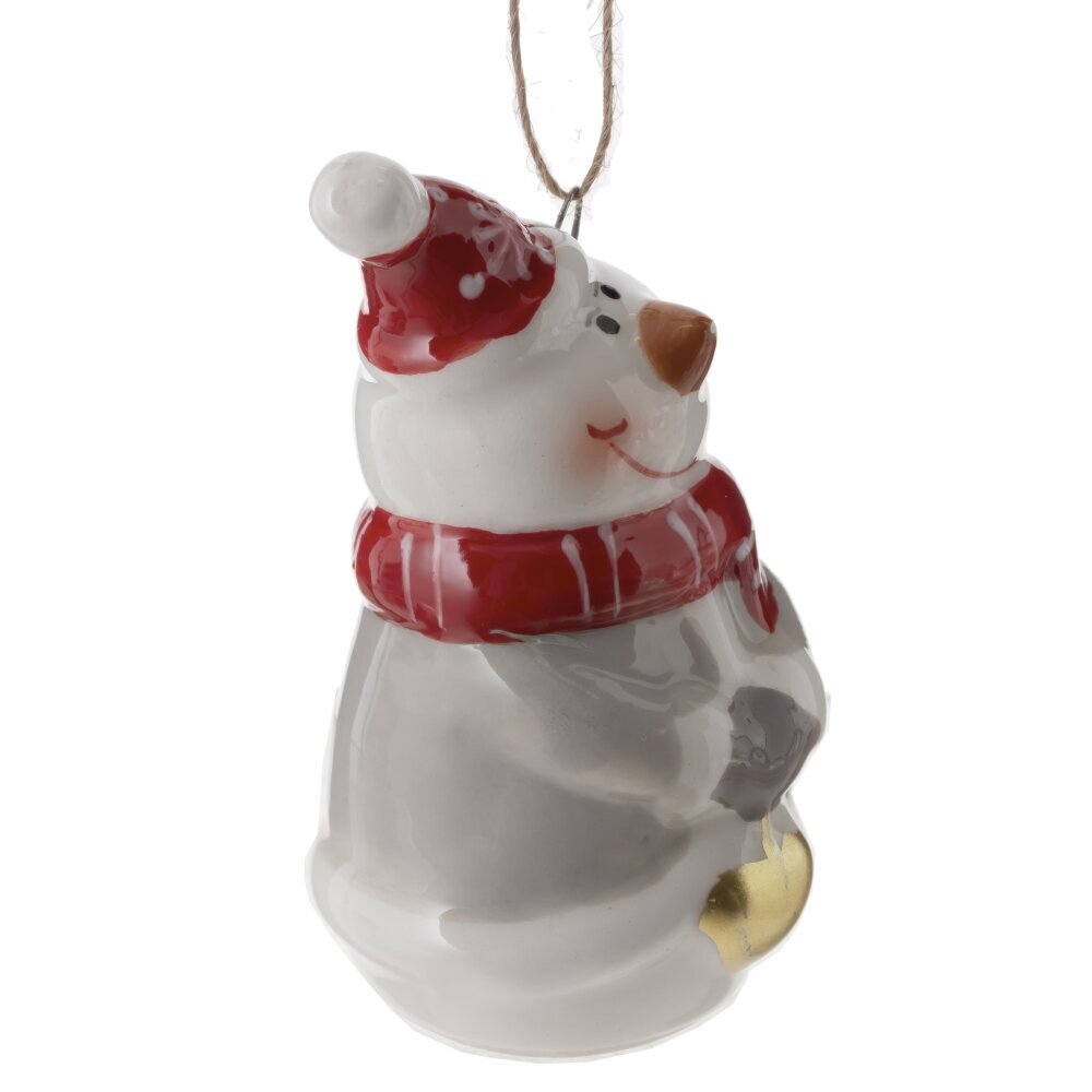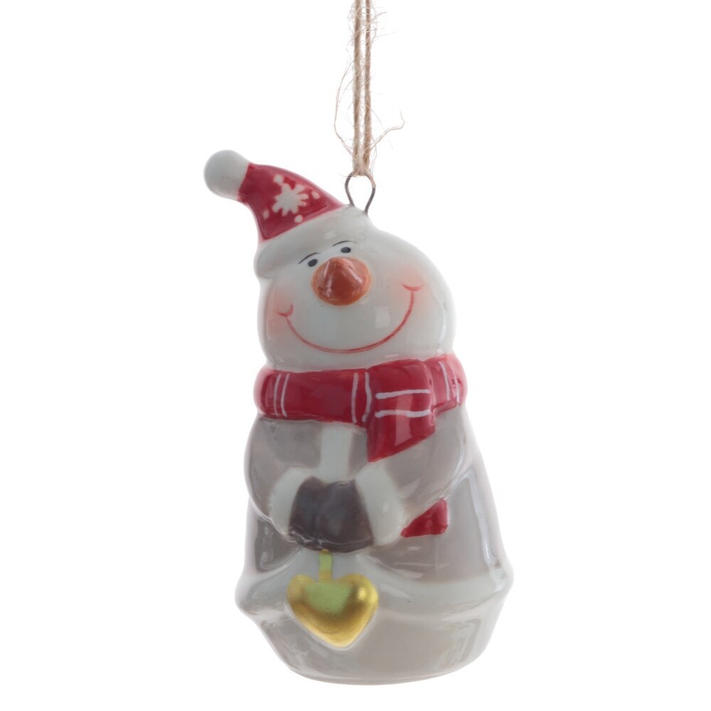 Подвесное новогоднее украшение “Снеговик”. Эта милая фигурка с воздушным дизайном станет прекрасным дополнением к вашему зимнему декору, придавая ему атмосферу сказки и уюта.Фигурка выполнена из керамики и покрыта глянцевой глазурью,которая придает блеск. Дизайн подвески создает ощущение легкости и нежности, что делает ее идеальным украшением для новогоднего праздника.