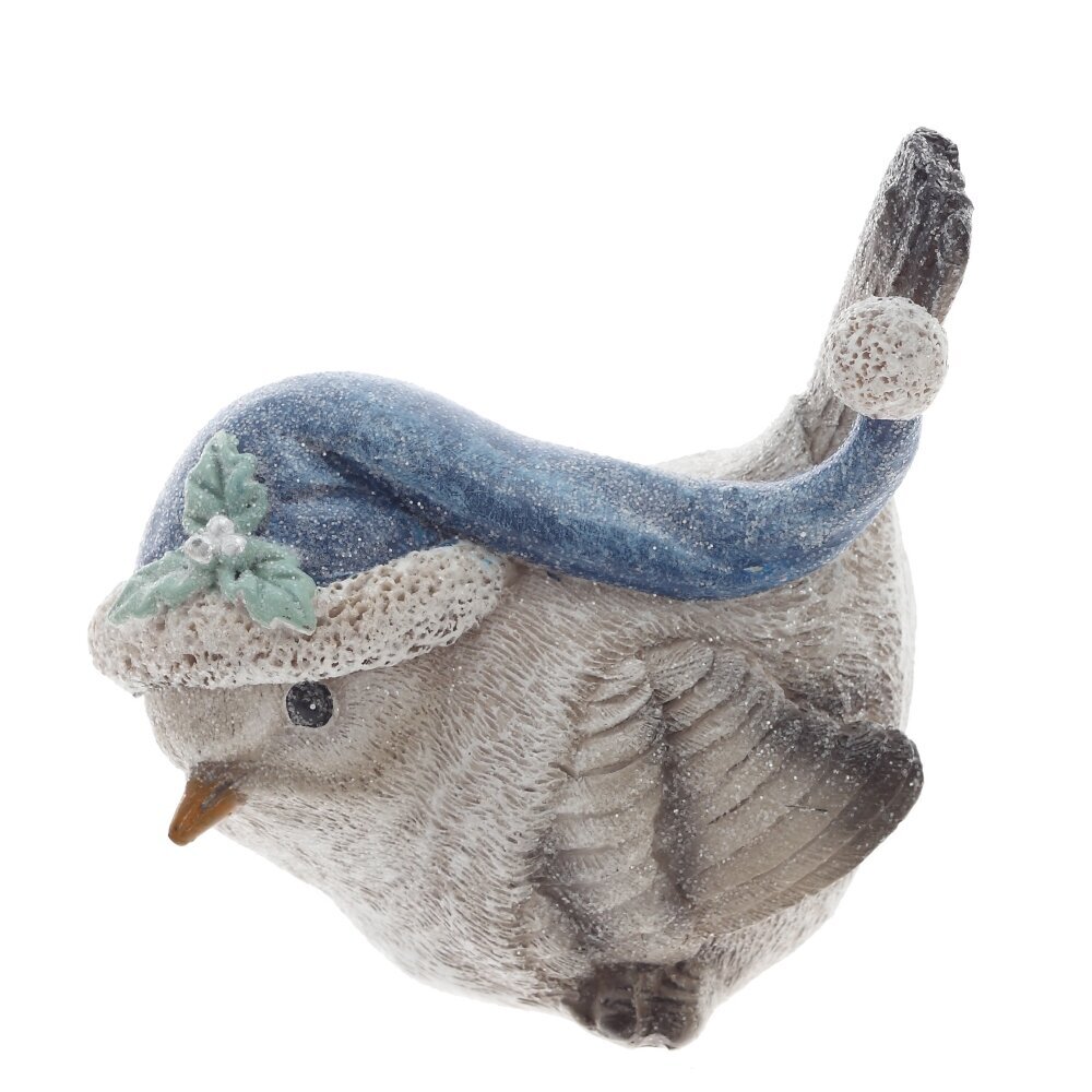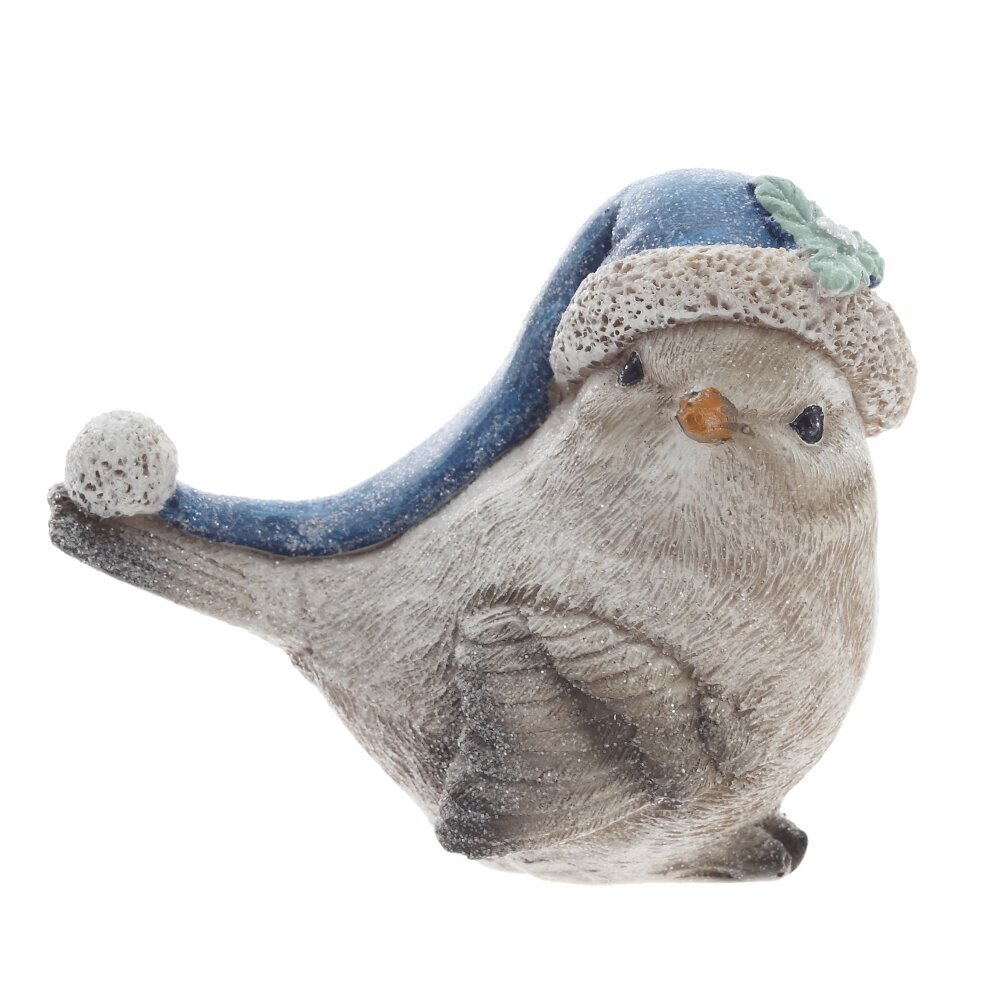 Декоративная фигурка из полимерных материалов в виде милой зимней птички. Серо-бежевый окрас с тщательно проработанным оперением дополнен длинной синей шапкой с белым помпоном; по краю — «меховой» кант с листочками и ягодками, создающими новогодний акцент. Поверхность будто припорошена инеем, что придает изделию легкое сияние. Фигурка компактная и устойчива, отлично смотрится на полке, подоконнике, каминной полке или в витрине, легко вписывается в классический и сканди-интерьер. Прекрасно дополняет зимние композиции с еловыми ветками, свечами и гирляндами, подходит в качестве небольшого подарка или атмосферного декора к праздникам. Представлено в двух вариантах.