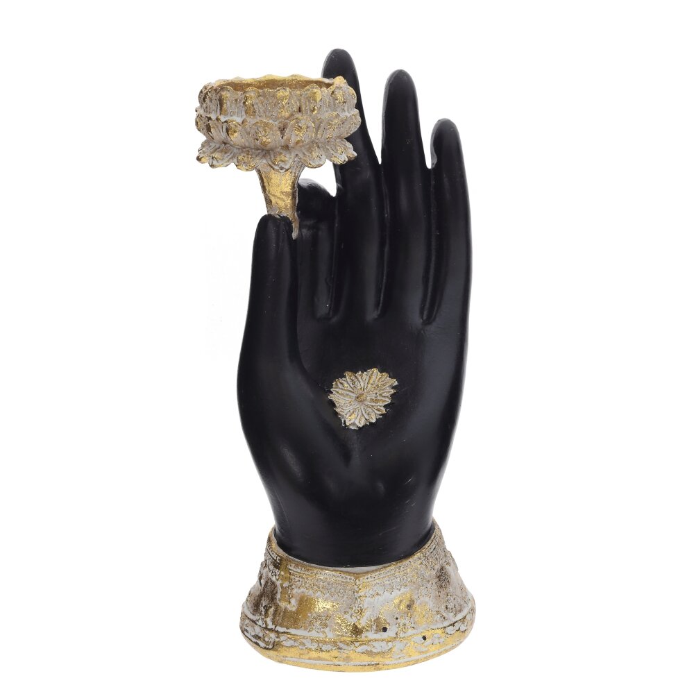 Декоративная фигурка «Рука» с подсвечником – изящный акцент для интерьера в современном или классическом стиле. Черная матовая ладонь из полимерных материалов грациозно приподнята и удерживает миниатюрный подсвечник с фактурным золотистым краем, украшенным рельефным орнаментом. Основание в виде манжеты с потертым золотом создает эффект старинной вещи и подчеркивает утончённость композиции. В подсвечник можно поместить небольшую свечу-таблетку, создавая мягкое, камерное освещение для гостиной, спальни или зоны релакса. Отлично смотрится как самостоятельный акцент на полке, каминной полке или прикроватной тумбе, а также в составе декоративных композиций.