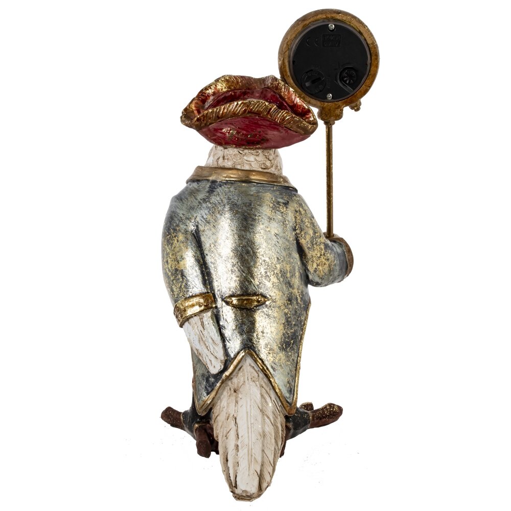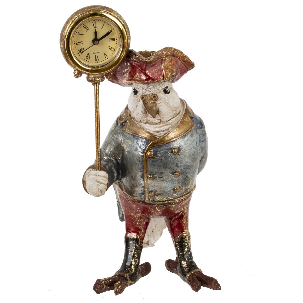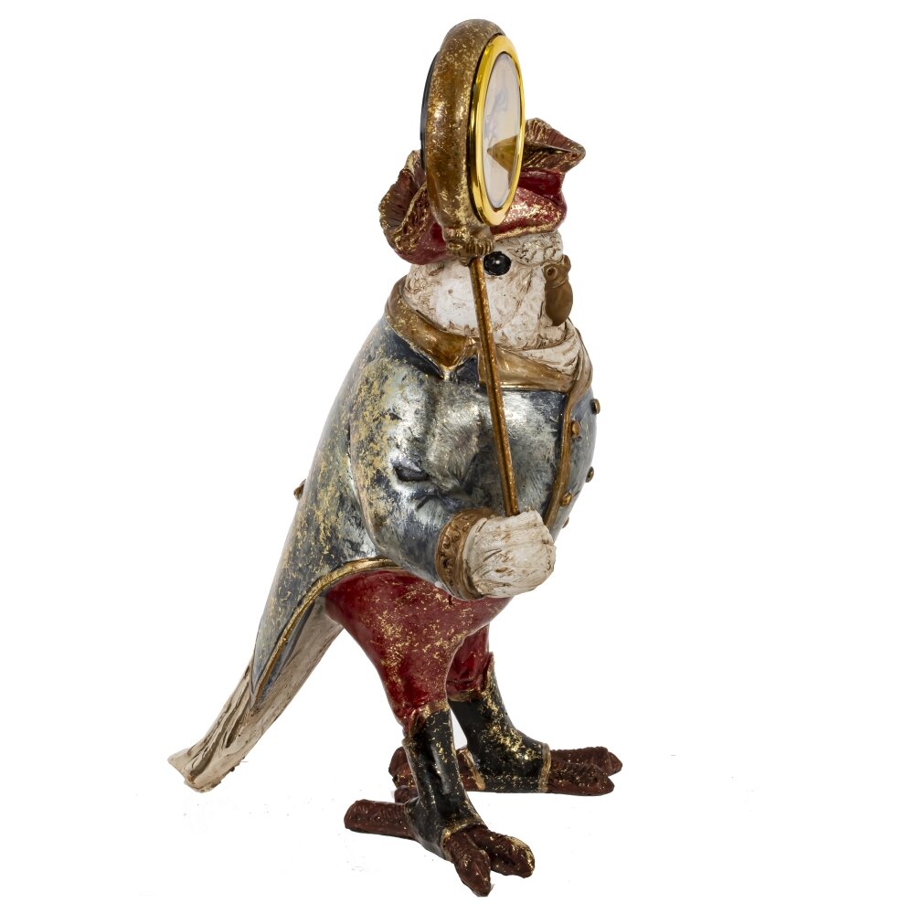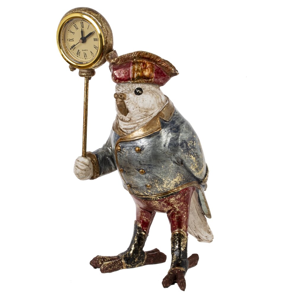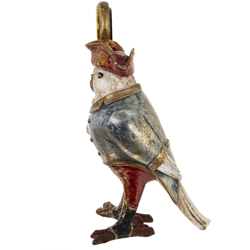 Декоративная статуэтка "Попугай" с часами выглядит экстравагантно и роскошно. Это изделие изготовлено из полистоуна с особым вниманием к деталям. Белый какаду в наполеоновской треуголке и мундире уверенно держит круглые золотые часы с диаметром циферблата 4см. Эти часы на плавном ходу, работают от одной батарейки типа LR44 (не прилагается).