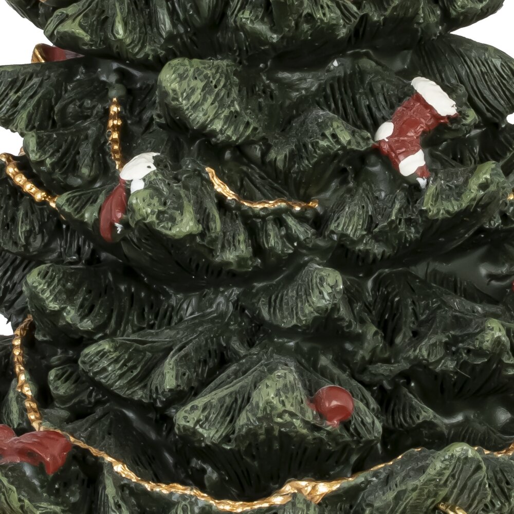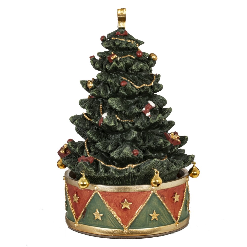Музыкальная декоративная елочка на подставке крутится вокруг своей оси, заводится механически с помощью рук, без ключа. Выполнена из полистоуна, украшена подарками и звенящими бубенчиками. При раскручивании проигрывается мелодия "We wish you a Marre Christmas".