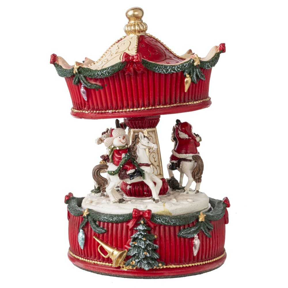 Карусель выполнена в ярких тонах, приковывающих к себе внимание. Резной купол украшен интересным орнаментом, на лошадках сидят веселые Дед Морозы с подарками. Фигурка декоративная с музыкой и функцией движения "Карусель", изготовлена из полимерных материалов. Работает от трех батареек LR44.