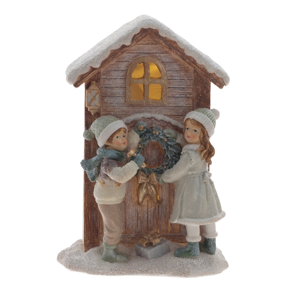 Декоративная фигурка с подсветкой "Дети и домик" — это восхитительное оформление для вашего праздничного интерьера. Она выполнена из полистоуна, что обеспечивает высокую детализацию и реалистичность изображения. На фигурке запечатлена трогательная сцена, где мальчик и девочка с радостью вешают рождественский венок на входную дверь домика. При помощи специального рычажка вы можете активировать подсветку, которая загорается в окошке двери, создавая волшебный световой эффект. Фигурка работает от двух батареек типа LR44, которые уже входят в комплект. Изделие прекрасно будет смотреться на полке, столе или в качестве акцента в новогодней композиции. Подарите себе и своим близким атмосферу настоящего праздника с этой красивой и уютной фигуркой!
