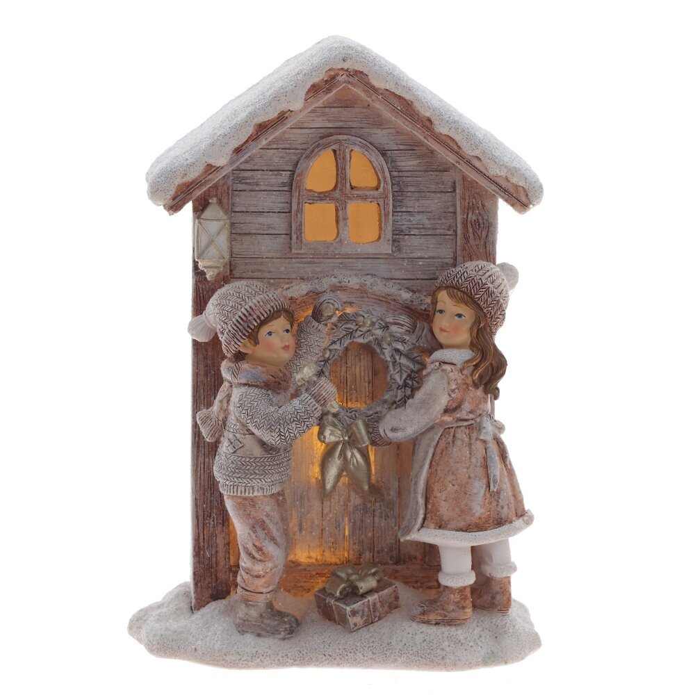 Декоративная фигурка с подсветкой "Дети и домик" — это восхитительное оформление для вашего праздничного интерьера. Она выполнена из полистоуна, что обеспечивает высокую детализацию и реалистичность изображения. На фигурке запечатлена трогательная сцена, где мальчик и девочка с радостью вешают рождественский венок на входную дверь домика. При помощи специального рычажка вы можете активировать подсветку, которая загорается в окошке двери, создавая волшебный световой эффект. Фигурка работает от двух батареек типа LR44, которые уже входят в комплект. Изделие прекрасно будет смотреться на полке, столе или в качестве акцента в новогодней композиции. Подарите себе и своим близким атмосферу настоящего праздника с этой красивой и уютной фигуркой!
