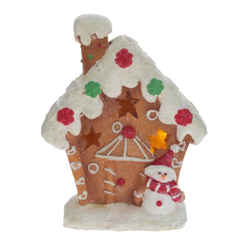 Декоративная фигурка "Домик" с подсветкой выполнена в стиле пряничного домика, украшенного заснеженной крышей с трубой. У двери стоит веселый снеговичек, добавляющий настроения. При включении подсветки через прорези в виде звездочек мерцает мягкий свет, создавая атмосферу уюта и волшебства. Фигурка работает от двух батареек типа LR44, которые входят в комплект. Снежные блестки и яркие леденцы придают изделию дополнительное очарование, делая домик прекрасным элементом декора для зимних праздников.
