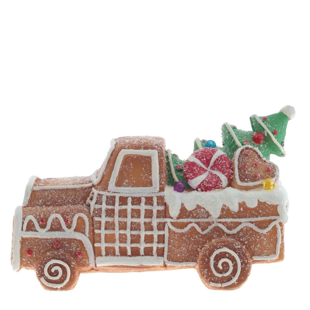 Уникальная декоративная фигурка "Машинка" с подсветкой изготовлена из специальной керамики с магниевым оксидом и представляет собой пряничный грузовичок. Белая "сахарная" глазурь украшает грузовик, в кузове которого находятся новогодние подарки и елочка, освещаемые разноцветными фонариками. Изделие украшено снежным глиттером, создавая праздничное настроение. Для подсветки требуются три батарейки типа ААА (не включены).