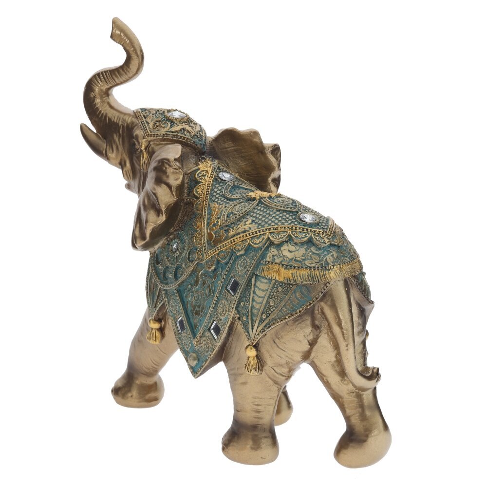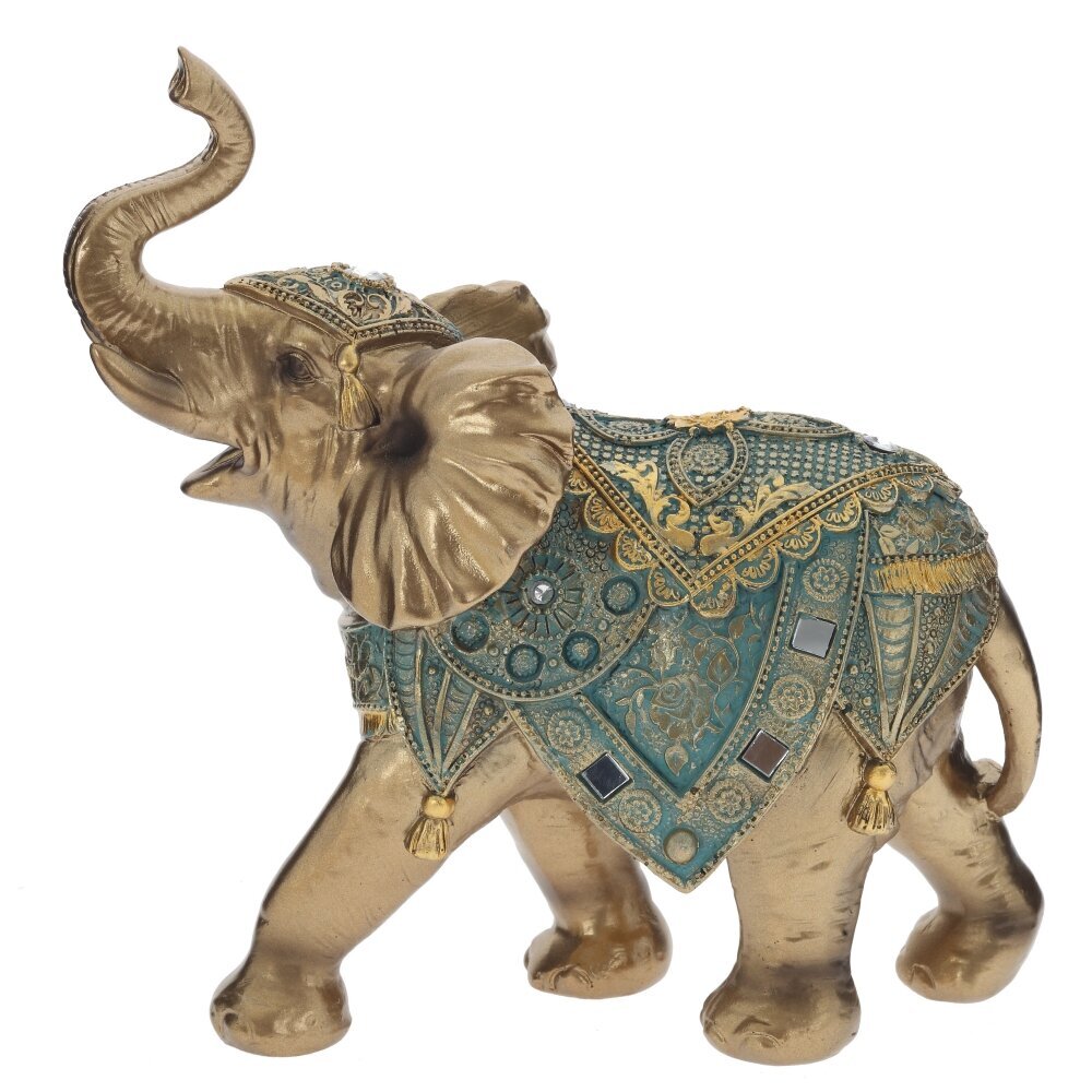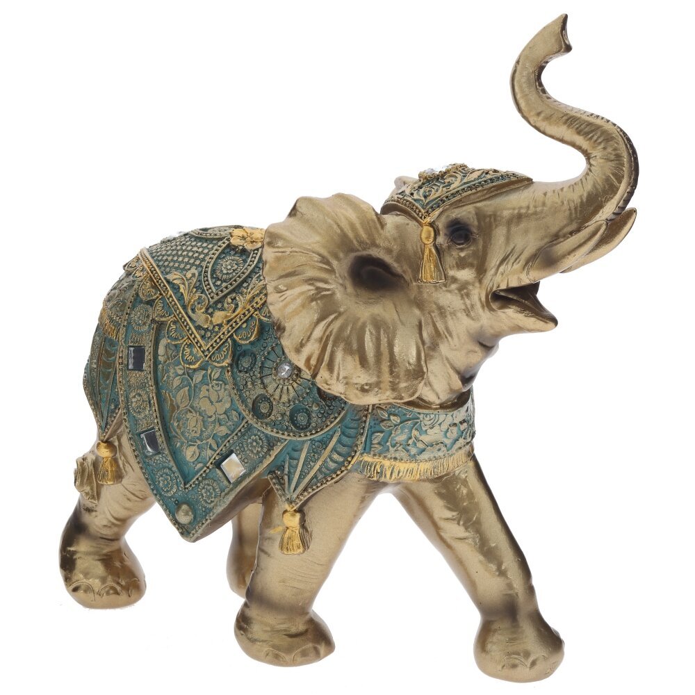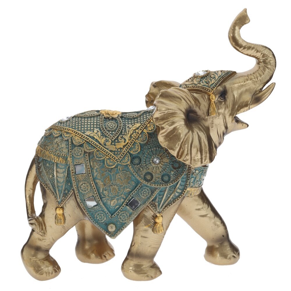 Декоративная фигурка «Слон» — изысканный акцент для интерьера в классическом или восточном стиле. Фигура выполнена из прочных полимерных материалов и окрашена под золото, благодаря чему выглядит как небольшая статуэтка из металла. Туловище слона украшено детализированным «покрывалом» благородного изумрудно?бирюзового цвета с рельефным орнаментом, золотистыми вставками и имитацией крошечных зеркал. Хобот, поднятый вверх, традиционно считается символом удачи, процветания и благополучия, поэтому такой слон станет не только стильным украшением, но и значимым талисманом дома или офиса. Фигурка гармонично смотрится на полке, каминной полке, в витрине или на рабочем столе, подойдёт в подарок ценителям необычного декора и любителям восточной тематики.