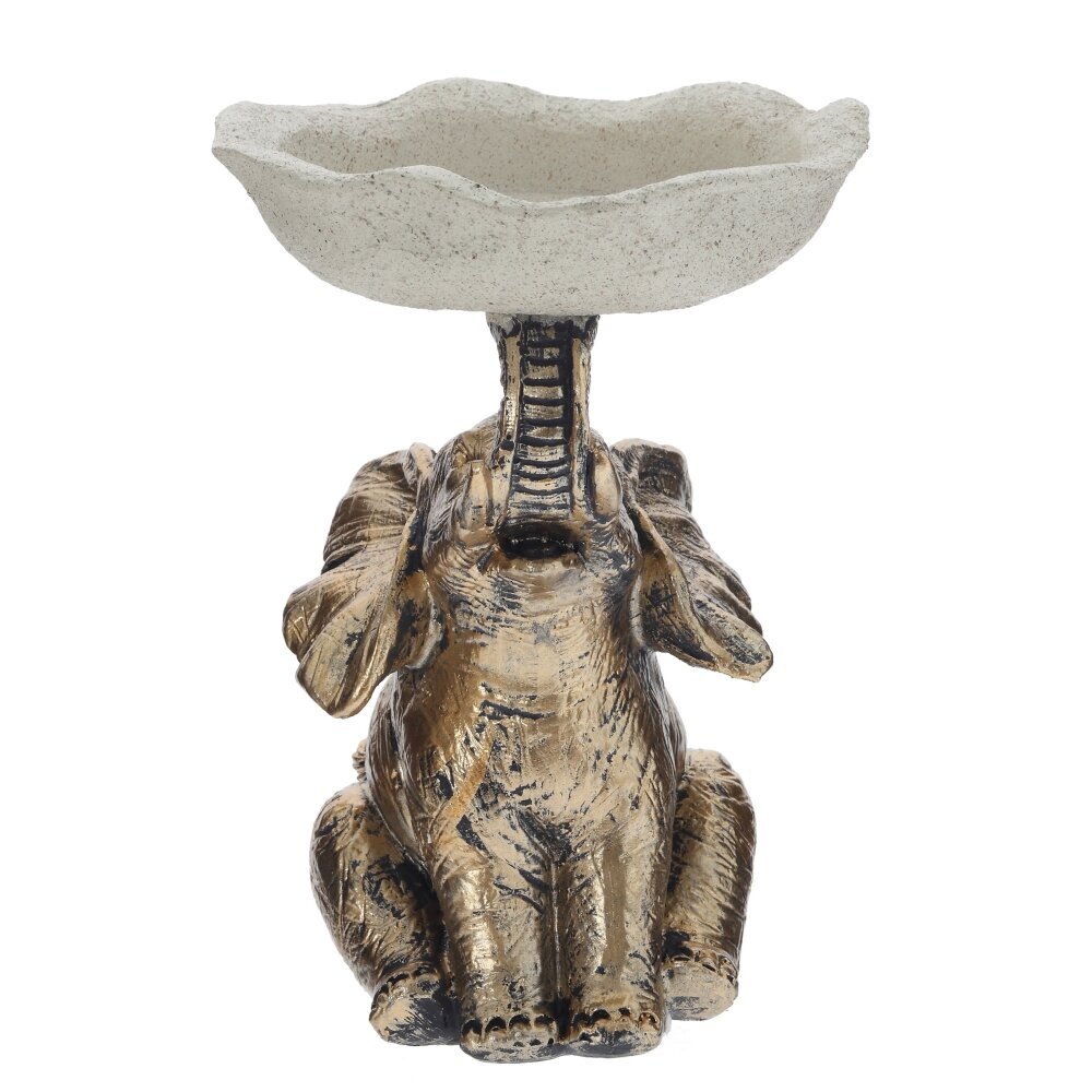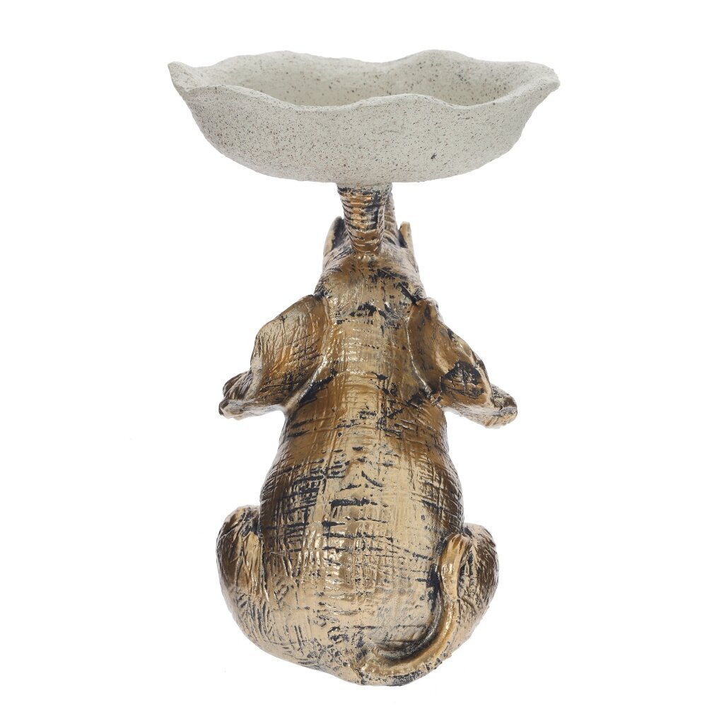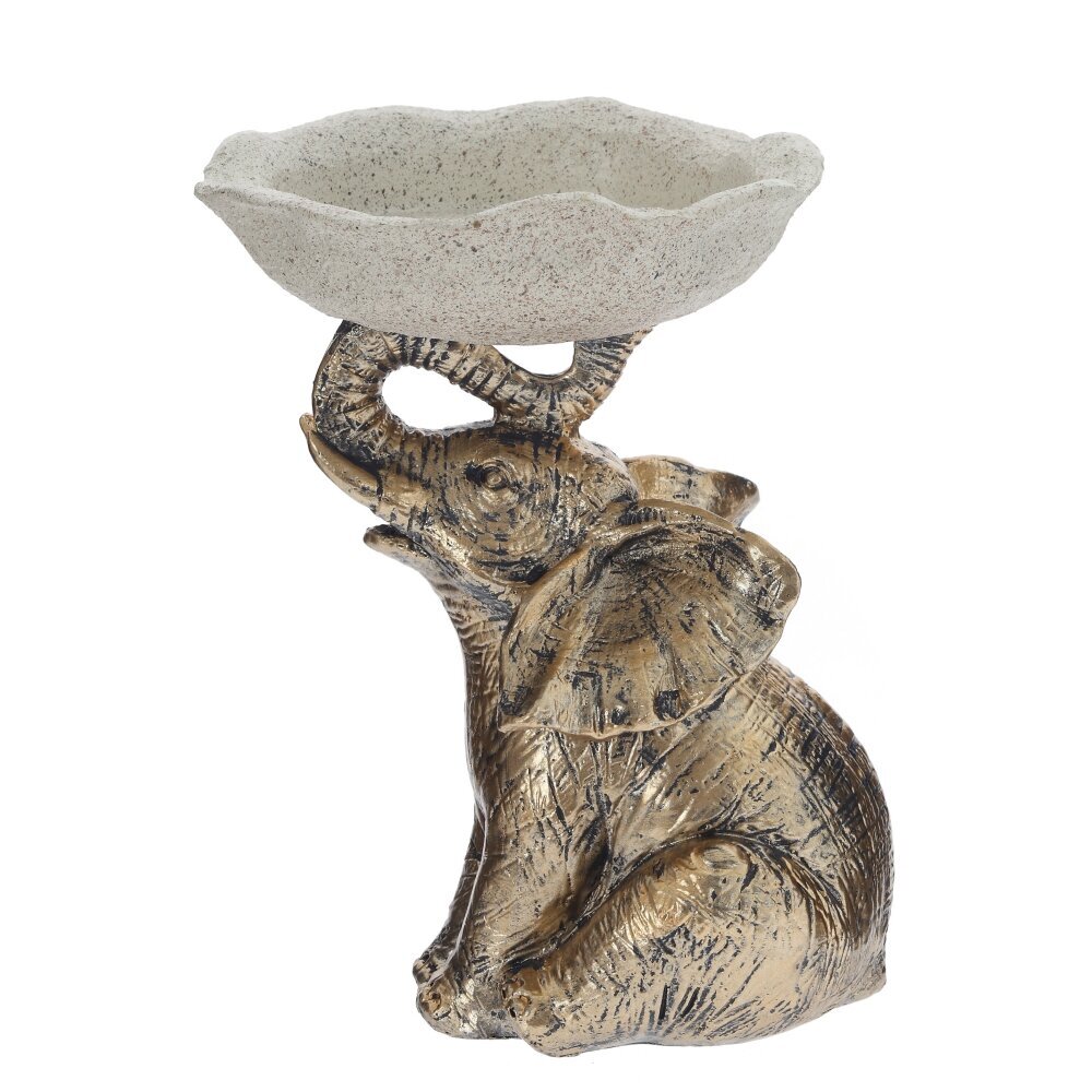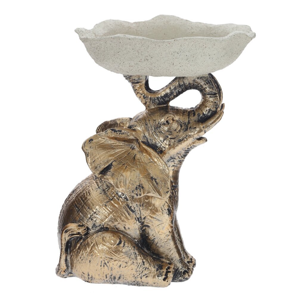Декоративная фигурка «Слон» с подставкой для мелочей станет эффектным акцентом в интерьере и практичным аксессуаром для повседневного использования. Фигурка выполнена из прочных полимерных материалов с благородным золотистым покрытием и искусственным старением, что придаёт изделию выразительную фактуру и делает его похожим на изящную статуэтку ручной работы. Слон сидит с приподнятым хоботом, символизирующим удачу и благополучие, а сверху удерживает округлую чашу-тарелочку нейтрального светлого оттенка. На подставку удобно складывать украшения, ключи, монеты, канцелярские мелочи или использовать её как основу для ароматических свечей и декоративного наполнителя. Компактный размер позволяет разместить фигурку на прикроватной тумбе, комоде, полке или рабочем столе. Идеальный вариант для подарка ценителям необычного декора.