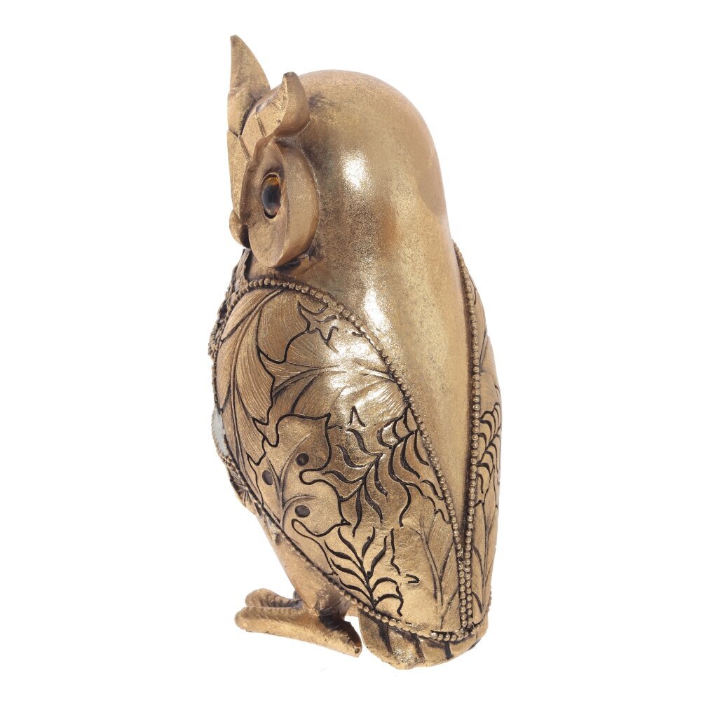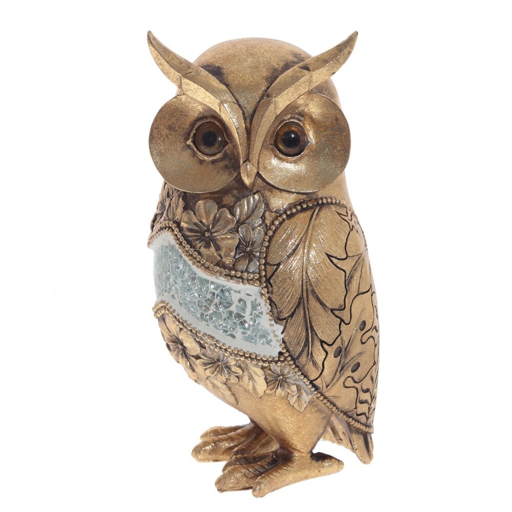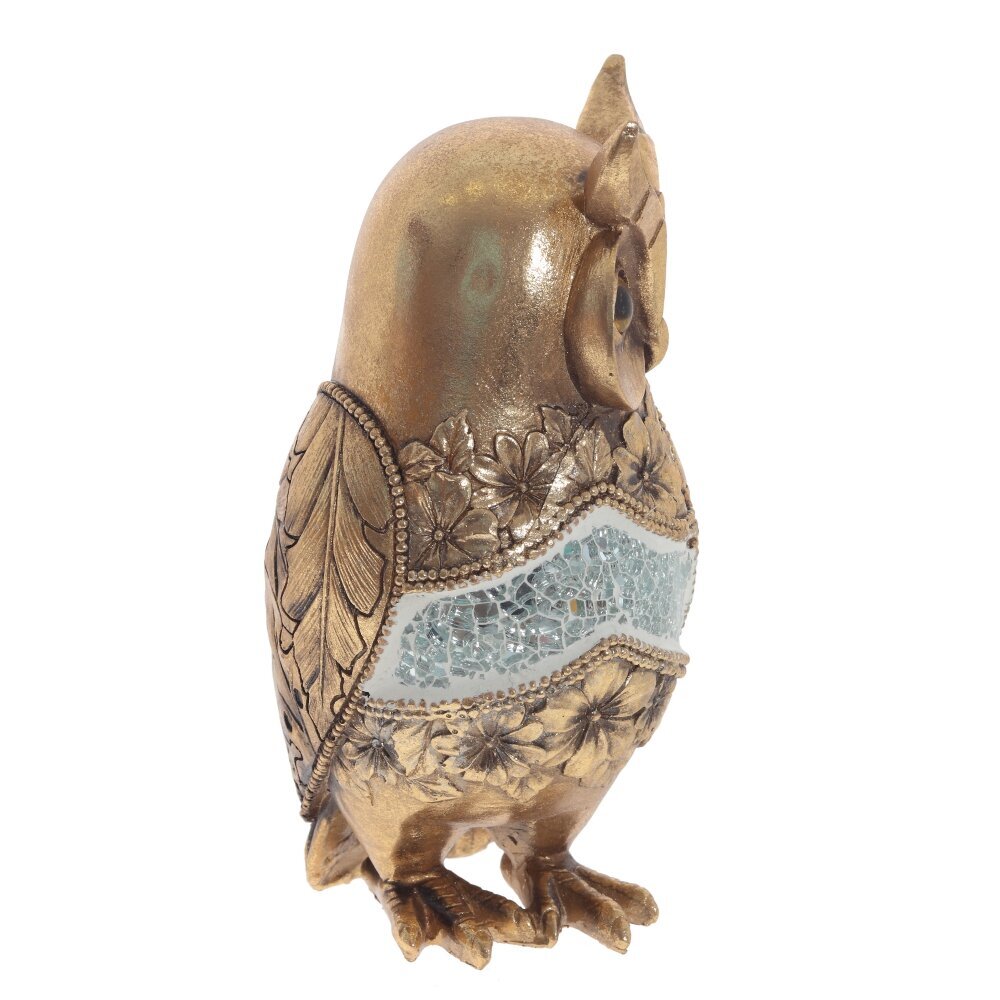 Декоративная фигурка "Сова" – это элегантный элемент интерьера, выполненный из полимерных материалов и украшенный стеклянными вставками. Фигурка имеет изысканный дизайн с детальной прорисовкой текстуры перьев, листьев и цветочных узоров. Золотистое покрытие придаёт изделию благородный и антикварный вид, а стеклянная мозаика на груди создаёт эффект утончённого блеска. Такая фигурка станет отличным украшением дома, придавая помещению уют и атмосферу загадочности. Подходит для подарка коллекционерам или людям, ценящим оригинальный декор.
