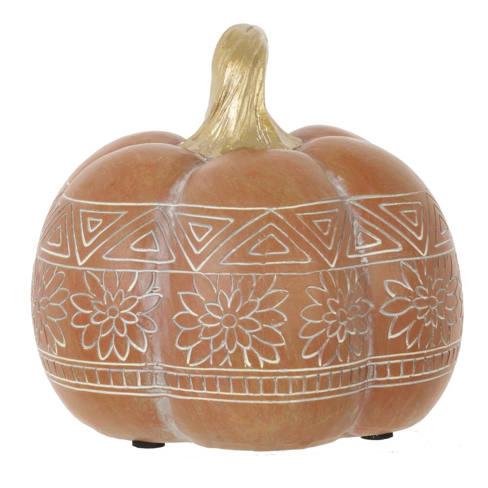 Декоративная фигурка в форме тыквы из качественных полимерных материалов станет ярким акцентом в любом интерьере. Матовая поверхность теплого терракотового оттенка дополнена изящной гравировкой: геометрический орнамент с треугольниками плавно переходит в полосу стилизованных цветов. Контрастный золотистый хвостик придаёт изделию нарядный, немного сказочный вид. Лёгкая, устойчивая и неприхотливая в уходе фигурка идеально подходит для оформления гостиной, кухни, каминной полки или праздничного стола в осеннем стиле, а также для создания уютной композиции с подсвечниками и вазами.