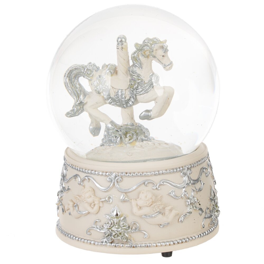 Декоративная фигурка в стеклянном шаре "Карусель" — нежное воплощение мечты, где символ Года Лошади предстает в очаровании детских воспоминаний! Внутри стеклянного шара диаметром 10 см, наполненного прозрачной водой и мерцающими блестками - изящная фигурка лошадки-карусели из полистоуна в кремовом цвете, украшенная серебряными вензелями и розочками — словно воздушный торт из сказки. Высокая детализация придает ей утонченную нежность: грациозные формы и серебряные акценты делают изделие произведением искусства. На дне подставки — заводной ключ, который, будучи повернутым, запускает приятную мелодию, наполняя пространство волшебным звучанием. Этот изысканный новогодний сувенир — идеальный подарок и украшение интерьера, наполняющий дом атмосферой радости, ностальгии и праздничного очарования.