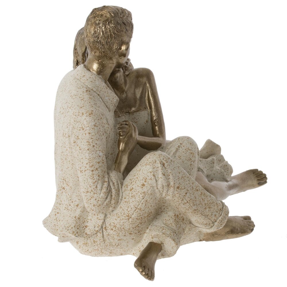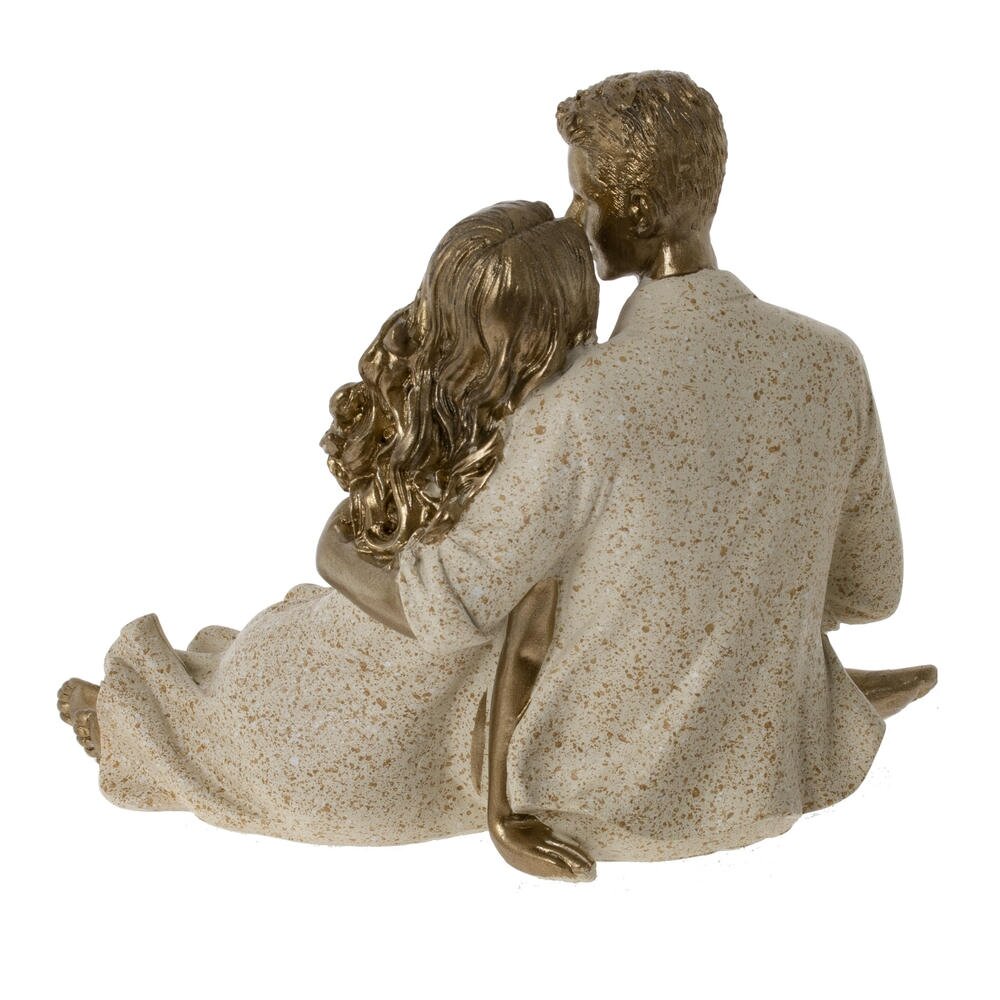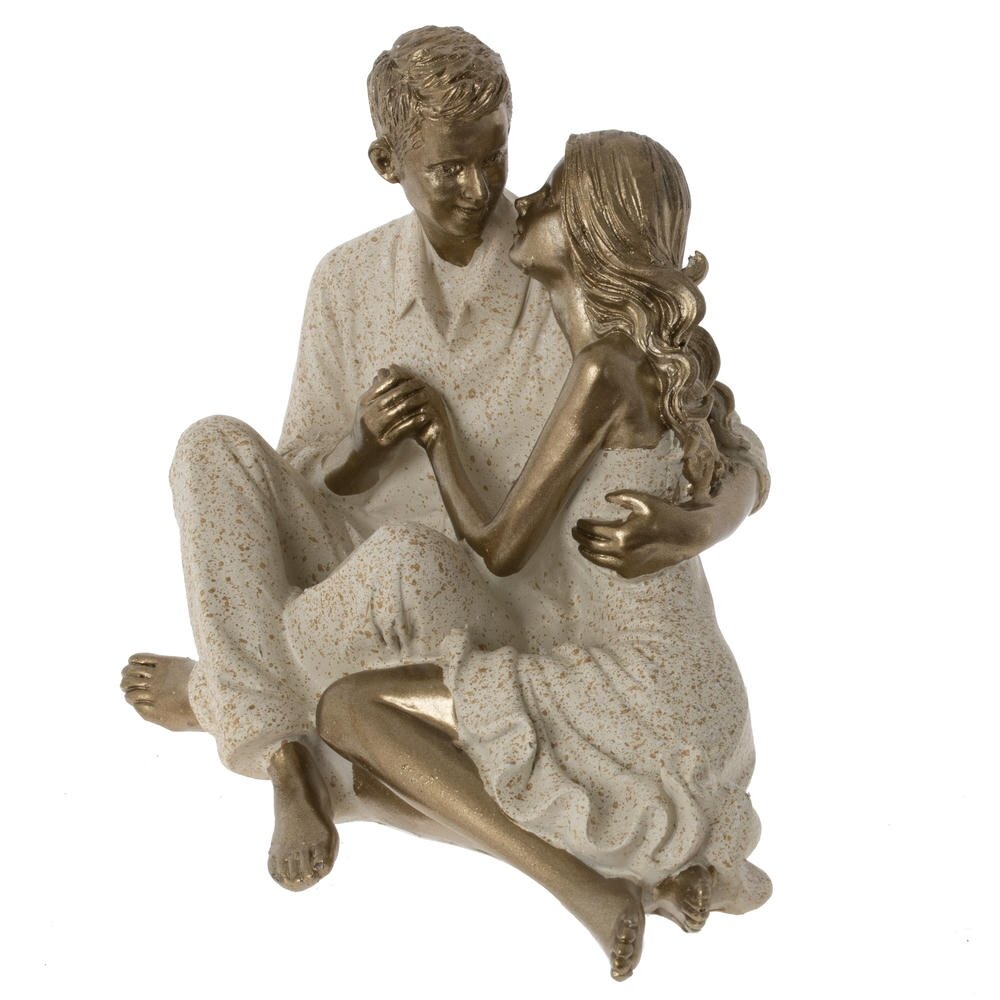 Декоративная фигурка, изображающая романтичную пару в нежных объятиях. Мужчина и женщина сидят рядом, держась за руки и глядя друг на друга, что создаёт атмосферу любви и гармонии. Золотистое покрытие кожи и волос эффектно сочетается с матовой светлой одеждой с лёгкими крапинками, придавая изделию изысканный, благородный вид. Такая статуэтка станет выразительным акцентом в интерьере спальни, гостиной или романтического уголка, подчеркнёт чувство стиля хозяев и послужит символичным подарком на свадьбу, годовщину или День святого Валентина. Лёгкий, прочный материал удобен в уходе и долговечен, сохраняя привлекательный вид на долгие годы.