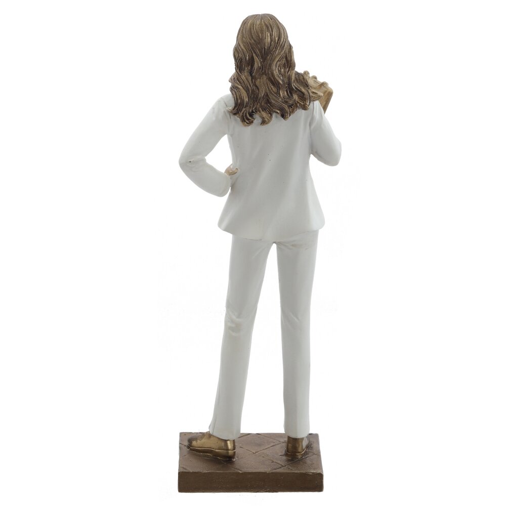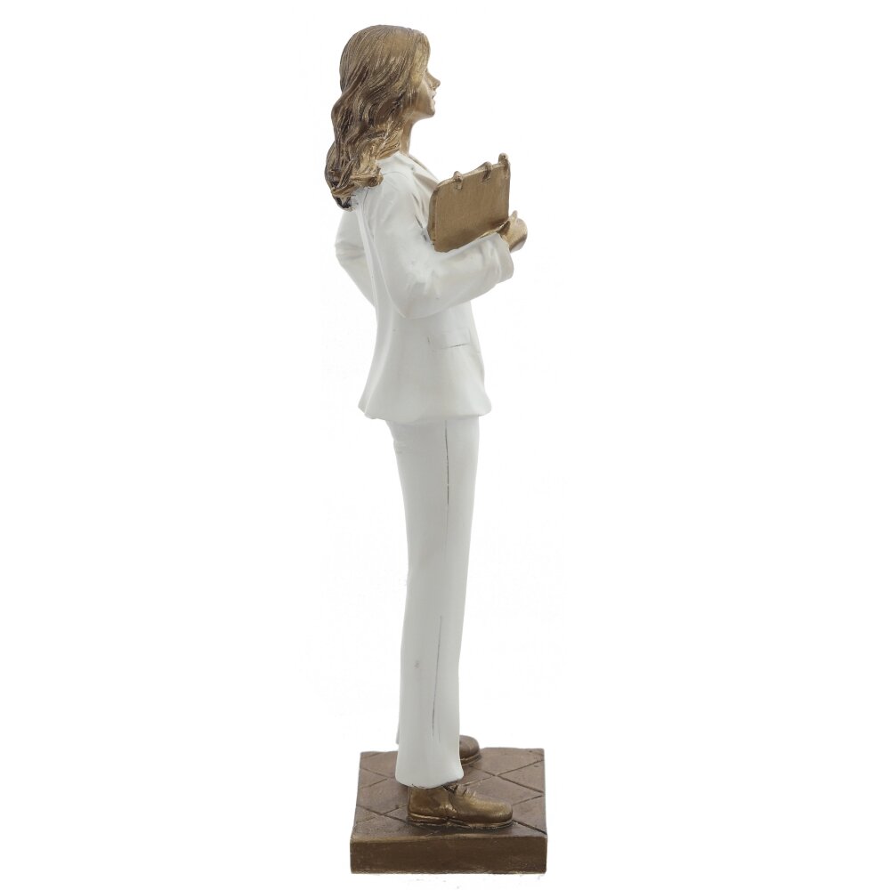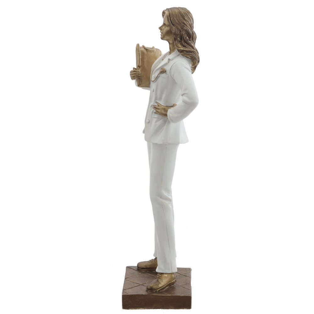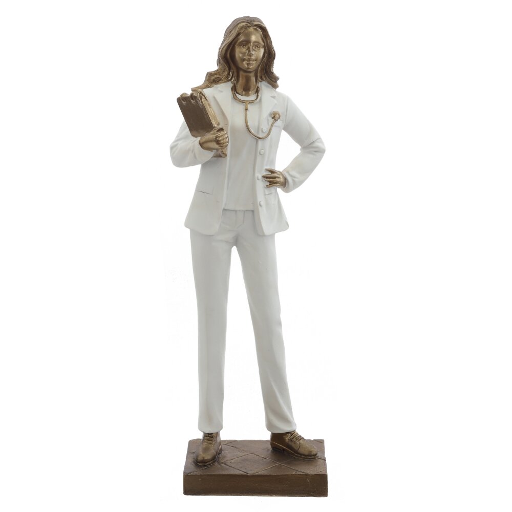 Стильная декоративная фигурка в виде женщины-врача станет выразительным акцентом в интерьере и прекрасным подарком человеку медицинской профессии. Статуэтка изображает уверенную в себе девушку в элегантном белом костюме, с планшетом для записей в одной руке и стетоскопом на шее. Лицо, волосы, руки и обувь выполнены под благородную бронзу, что выгодно контрастирует с белым нарядом и придаёт образу статусный, солидный вид. Фигурка установлена на устойчивом прямоугольном основании, хорошо смотрится на рабочем столе, полке или в витрине. Подойдёт для оформления кабинета врача, медицинского центра, учебного класса, а также для домашнего интерьера в современном или классическом стиле.