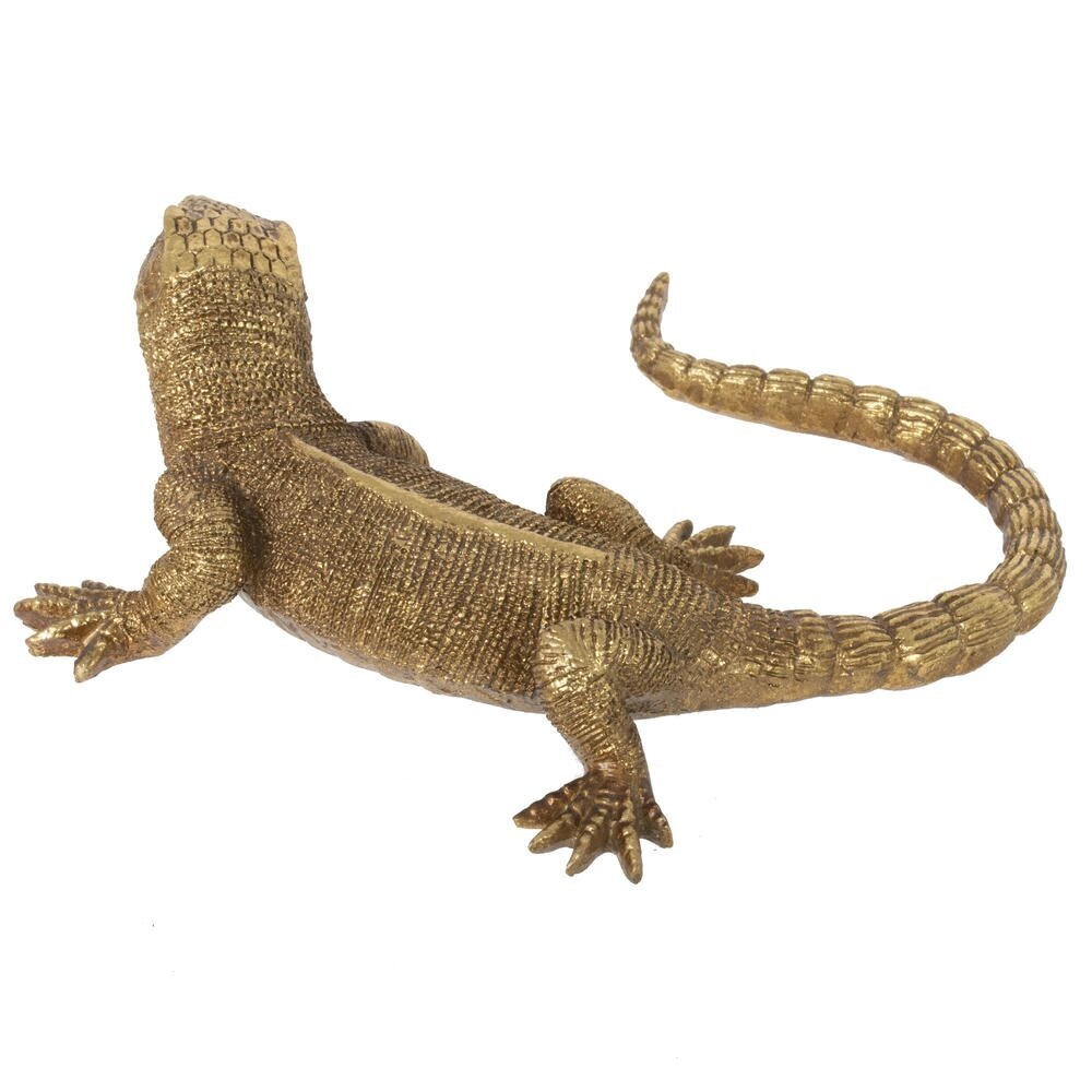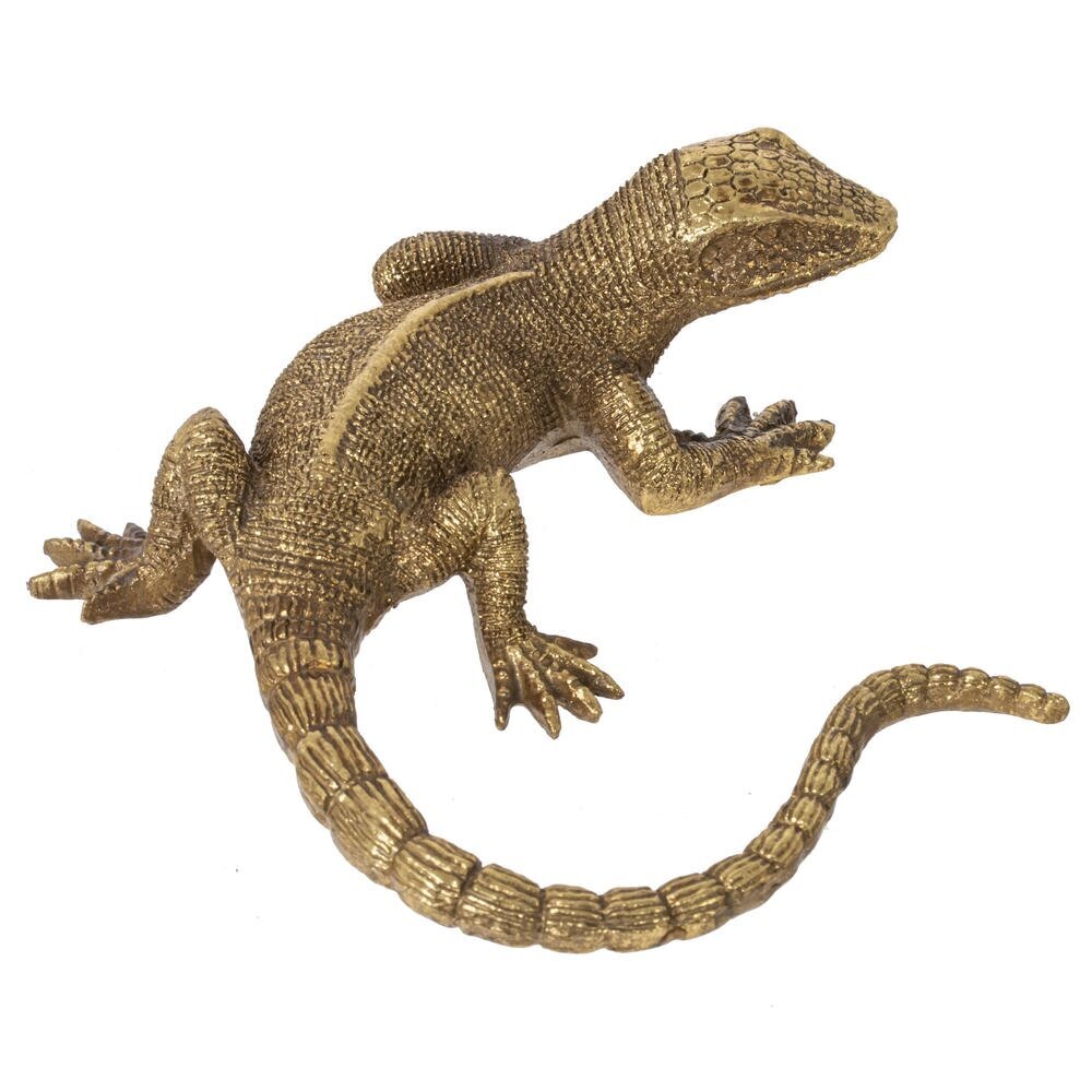 Декоративная фигурка ящерицы – эффектный акцент для современного интерьера. Выполнена из прочных полимерных материалов с золотистым покрытием, детально передающим фактуру кожи, чешуек и изгибов тела. Изящно изогнутый хвост и реалистичные лапки создают ощущение движения, привлекая внимание и добавляя пространству динамики. Такая статуэтка гармонично впишется в гостиную, кабинет или спальню, подчеркнёт стиль лофт, модерн, арт-деко и этно. Лёгкая и устойчивая, она подходит для размещения на полке, комоде, журнальном столике или рабочем столе. Станет необычным подарком ценителям оригинального декора и любителям животных.