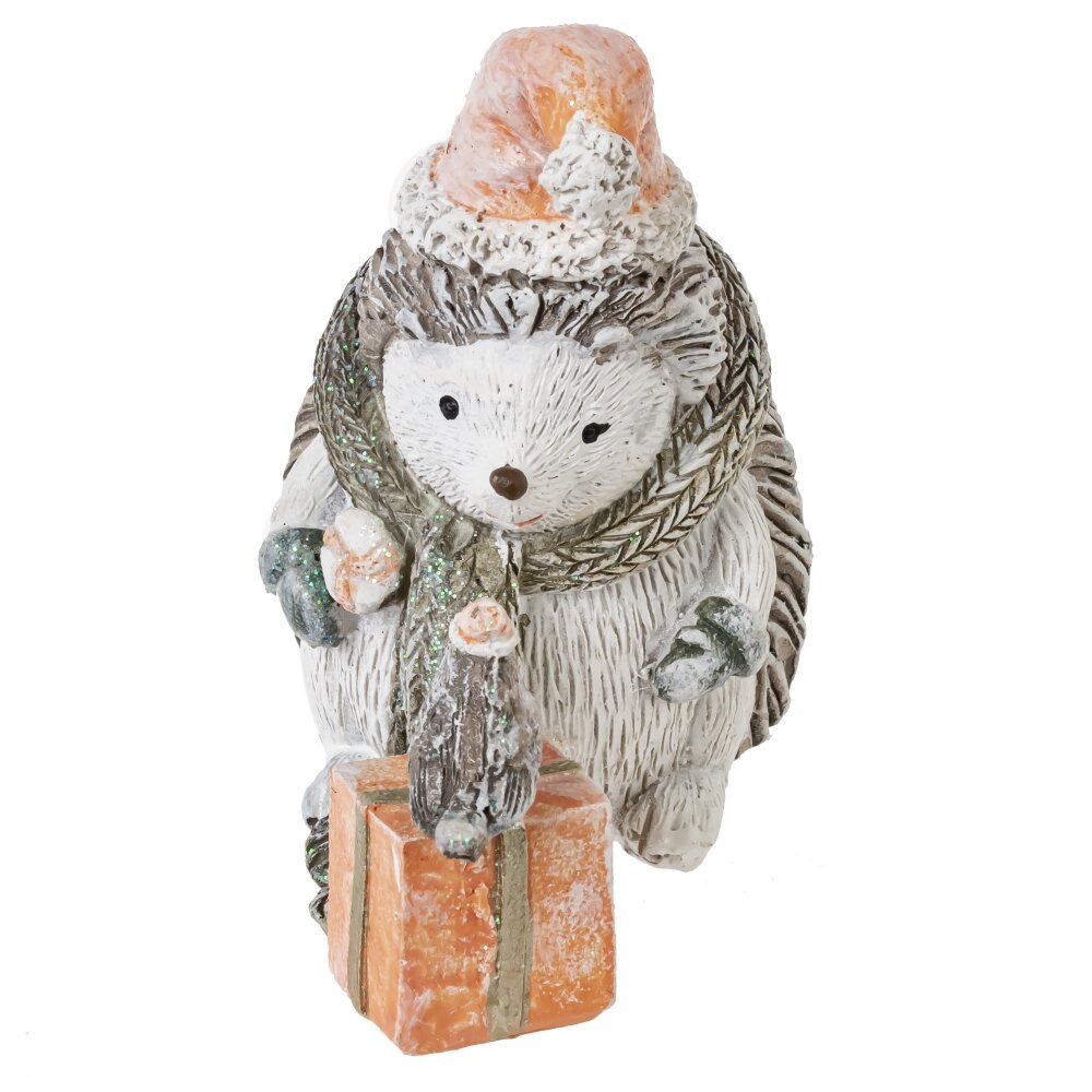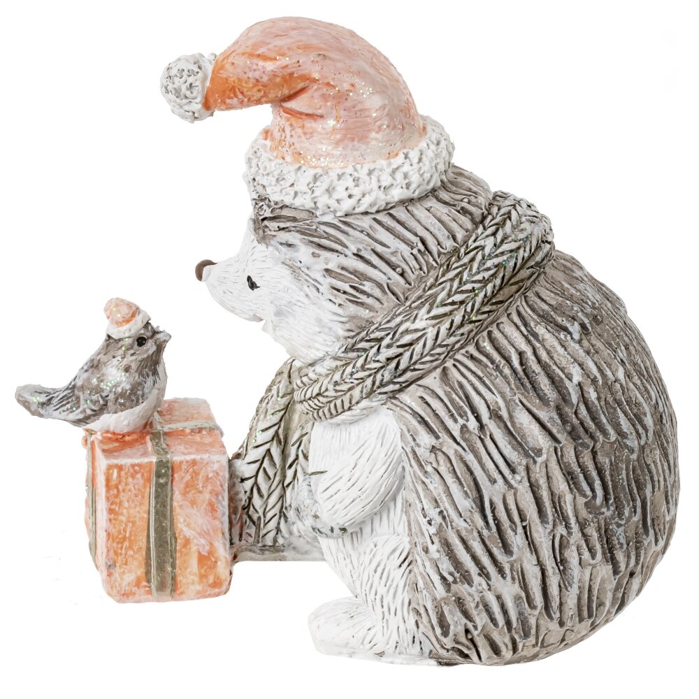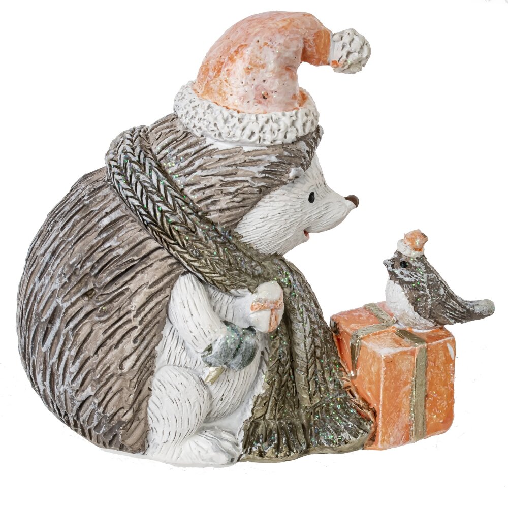 Декоративная фигурка "Ёжик" — это изысканное изделие из полистоуна, которое привнесет атмосферу праздника в ваш дом. В композиции изображен милый ежик в колпаке и шарфе, который с теплотой смотрит на маленькую птичку, уютно устроившуюся на новогоднем подарке. Внимание к деталям, мягкие пастельные тона и художественная проработка делают эту фигурку идеальным сувениром или подарком для близких. Она станет прекрасным источником приятных эмоций и напомнит о волшебстве зимних праздников.
