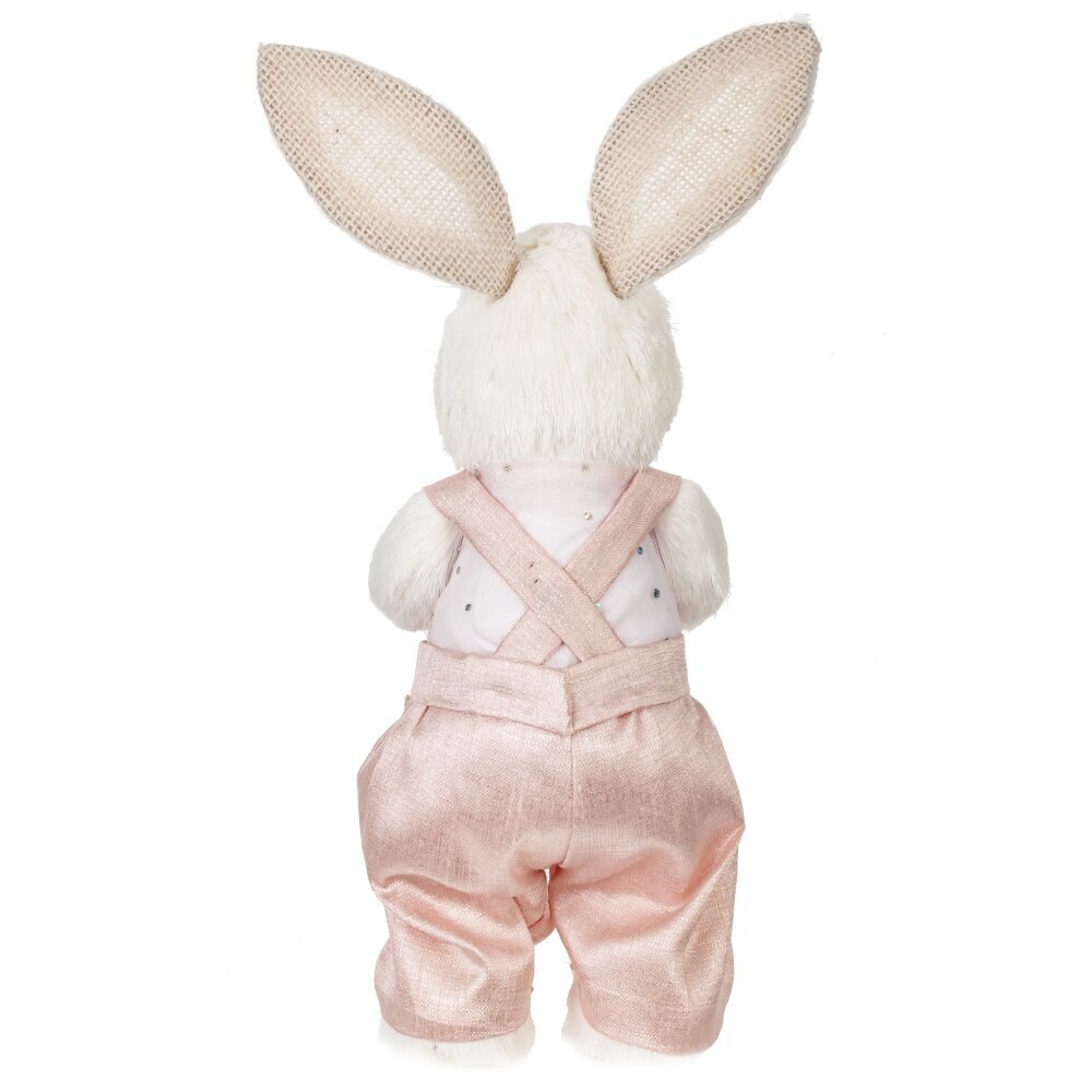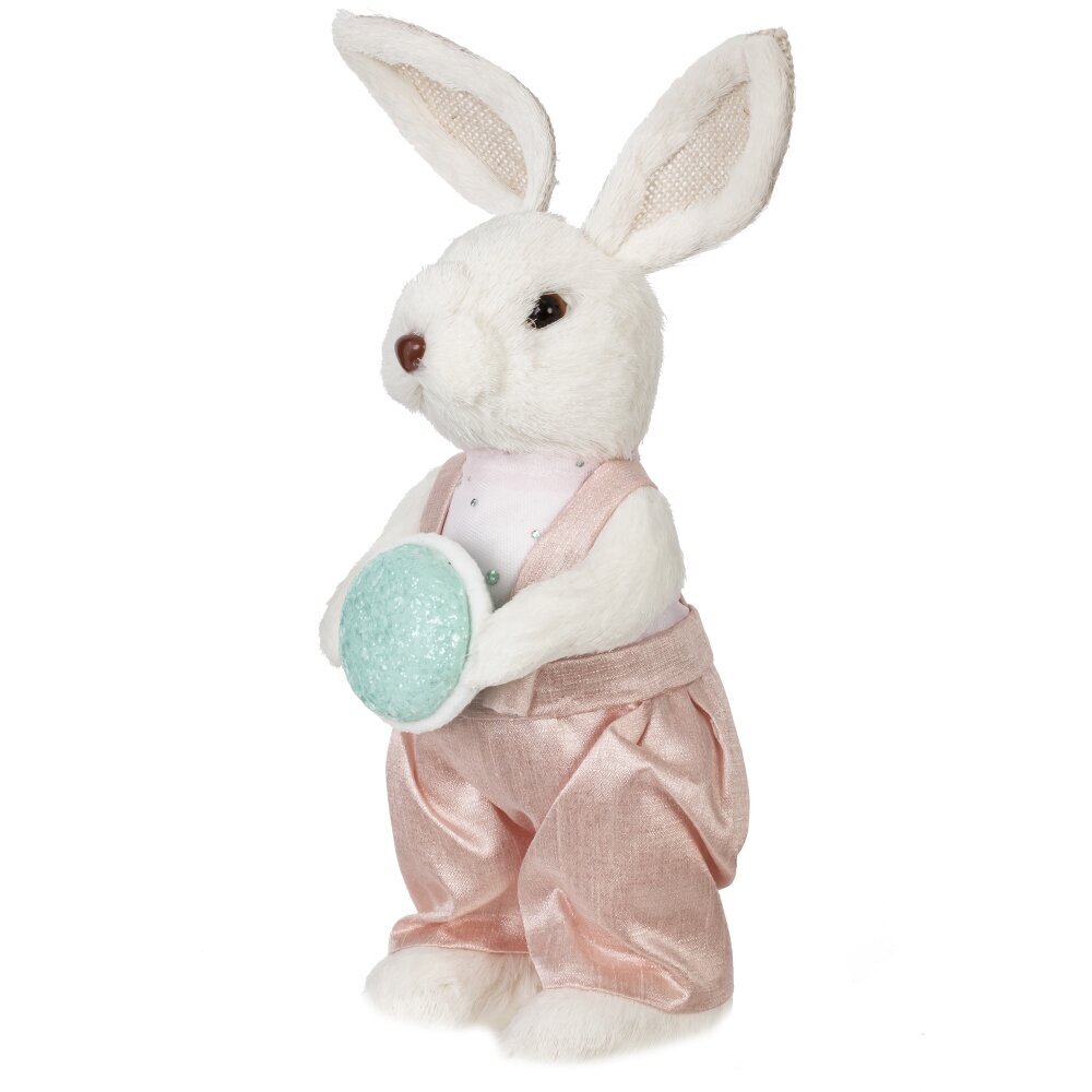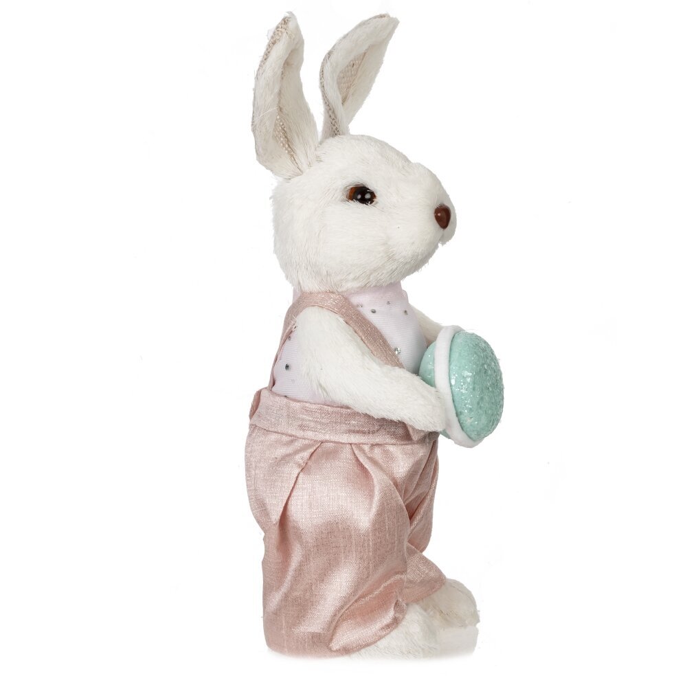 Этот очаровательный пасхальный заяц выполнен из сочетания полимерных, текстильных и натуральных материалов. Длинные ушки украшены вставками из легкой сетчатой ткани, добавляющей утончённости образу. Мордочка зайца аккуратно оформлена: пластиковые глазки придают ему живой взгляд, а носик изготовлен из прочного полимерного материала. Заяц одет в стильные розовые брюки-комбинезон, сшитые из блестящего текстильного материала, а также нежную светлую рубашку с мелкими декоративными элементами. В передних лапках он бережно держит круглую пироженку мятного оттенка. Эта фигурка станет прекрасным украшением пасхального интерьера или милым подарком для любителей праздничных декораций. Благодаря использованию натуральных и искусственных материалов, игрушка сохраняет свою привлекательность, оставаясь приятной на ощупь и эстетически привлекательной.
