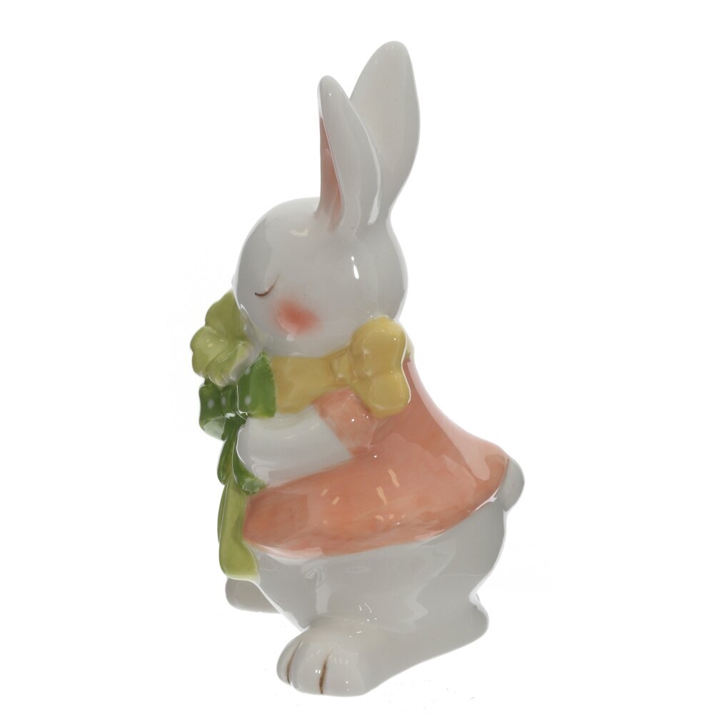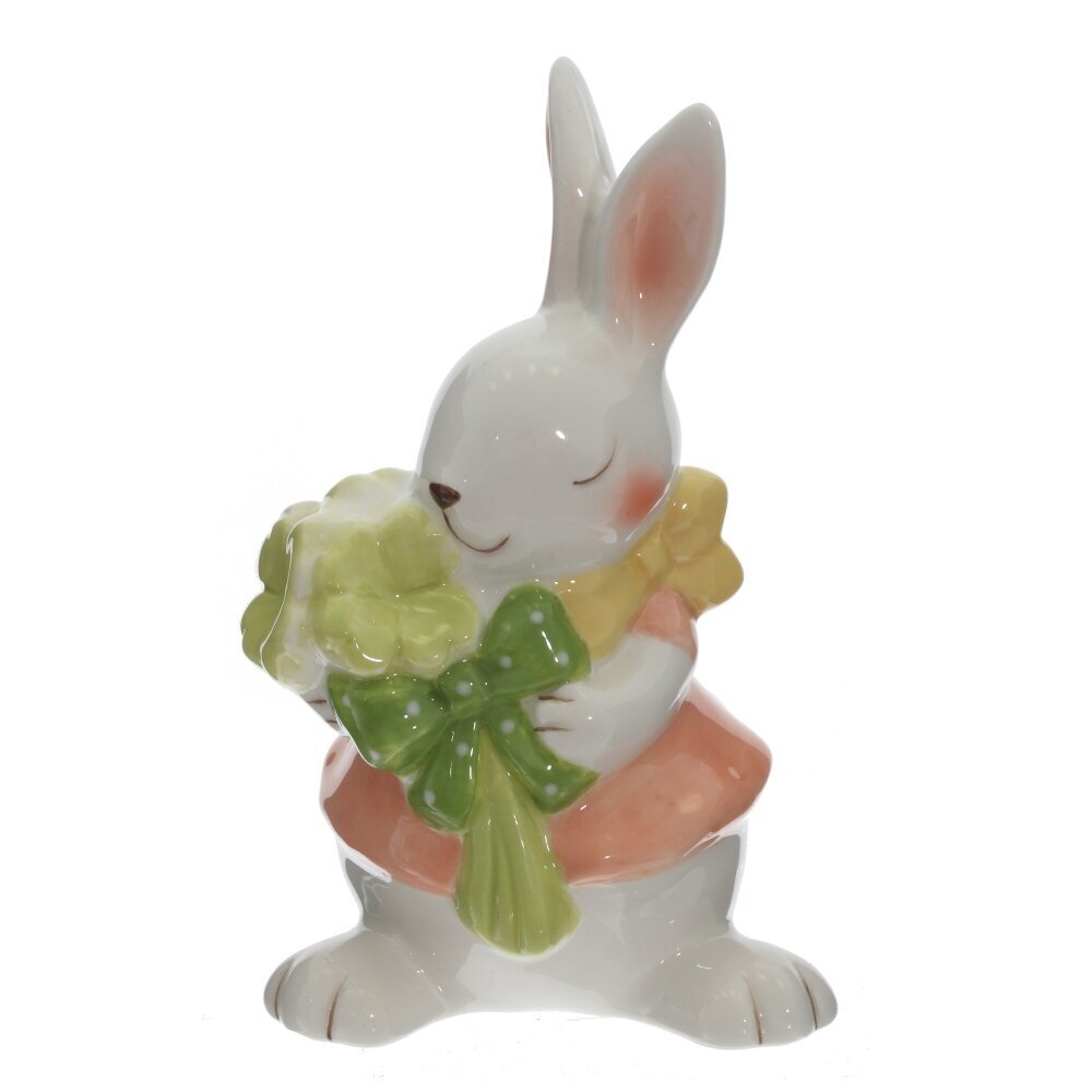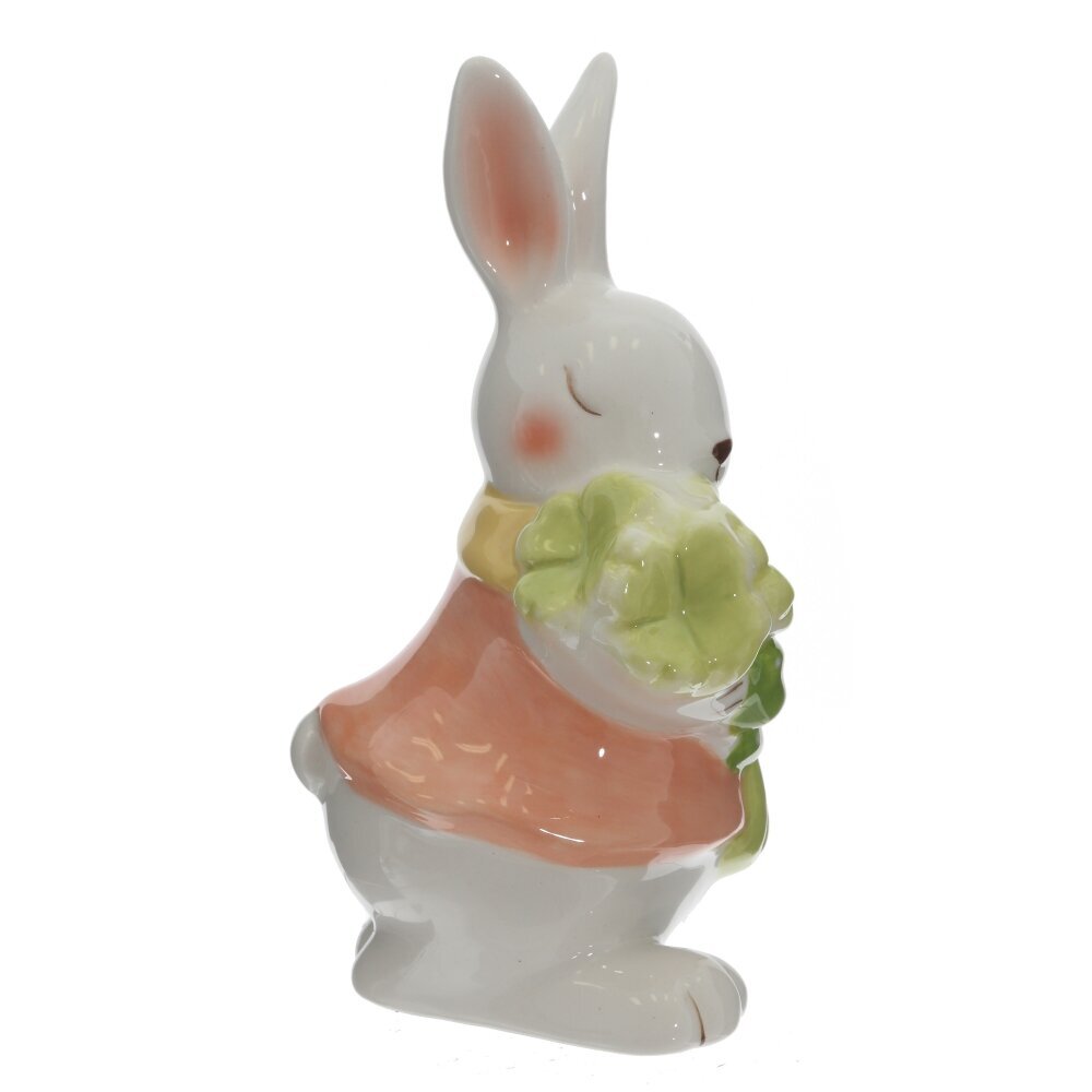 Декоративная фигурка «Заяц» из керамики – трогательное пасхальное украшение для дома. Милый зайчонок с закрытыми глазками бережно держит в лапках букет зелёных листьев, а нежное персиковое платье подчёркивает весеннее настроение. Гладкая глянцевая поверхность красиво переливается при свете и легко очищается от пыли. Фигурка идеально подойдёт для сервировки пасхального стола, оформления полки, каминной зоны или детской комнаты, создавая атмосферу уюта, тепла и ожидания праздника. Отличный выбор для подарка родным и друзьям на светлый праздник Пасхи.