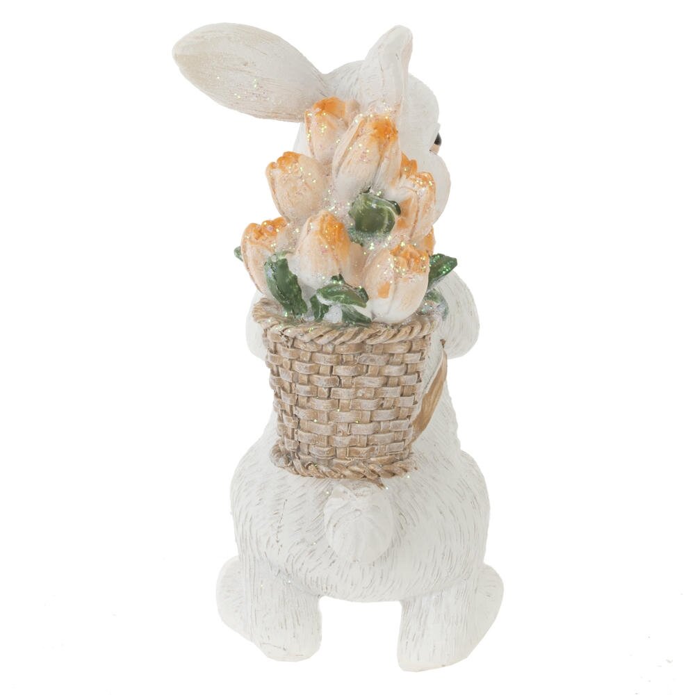 Декоративная фигурка "Заяц с корзиной" — это изысканный элемент праздничного декора, который идеально впишется в атмосферу Пасхи. Изготовленная из высококачественных полимерных материалов, она сочетает в себе долговечность и привлекательный внешний вид. Фигурка изображает милого зайца с большими выразительными глазами и мягкими формами, что придает ей особую уютную атмосферу. Заяц держит в лапках яркий тюльпан, символизирующий весну и возрождение, а за спиной у него расположена корзина, полная цветных тюльпанов, которые радуют глаз своим разнообразием. Каждый цветочек выполнен с вниманием к деталям, что делает композицию еще более живой и яркой. Эта фигурка станет прекрасным акцентом для вашего интерьера, будь то стол, полка или подоконник, и создаст атмосферу праздника и радости.