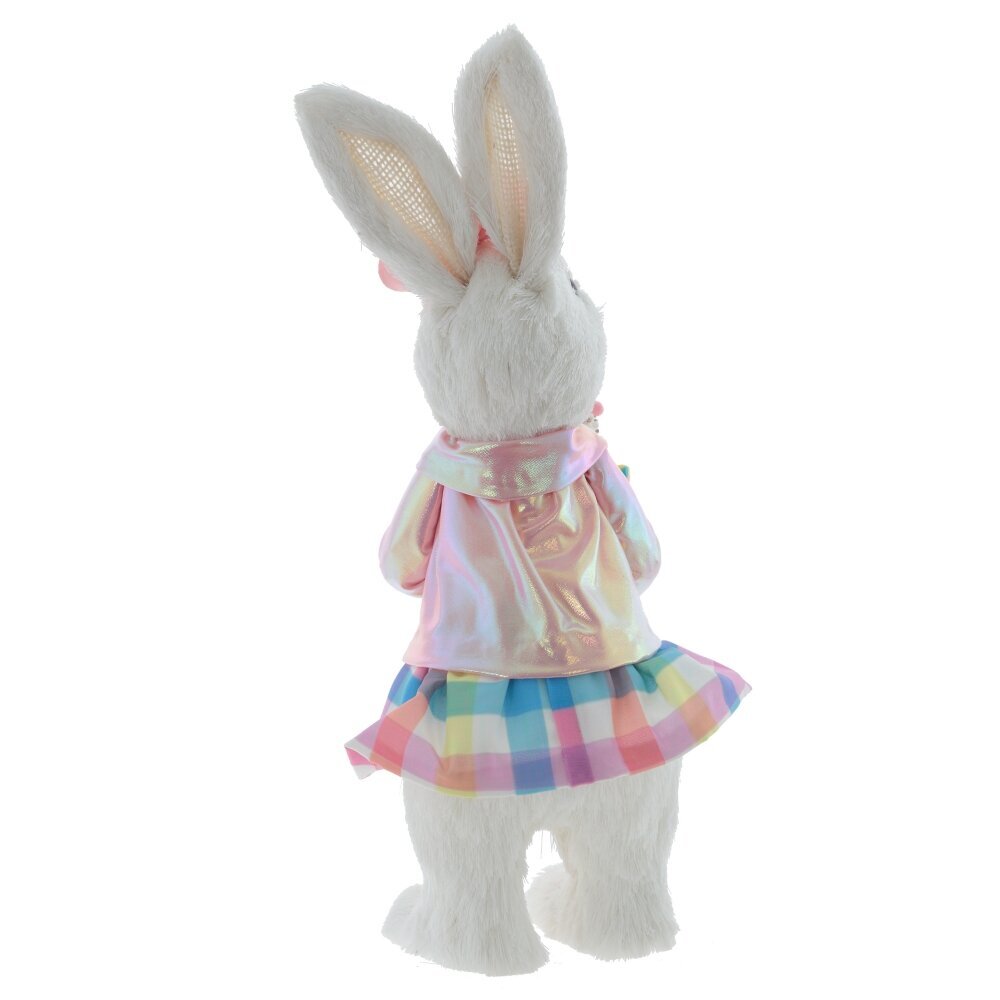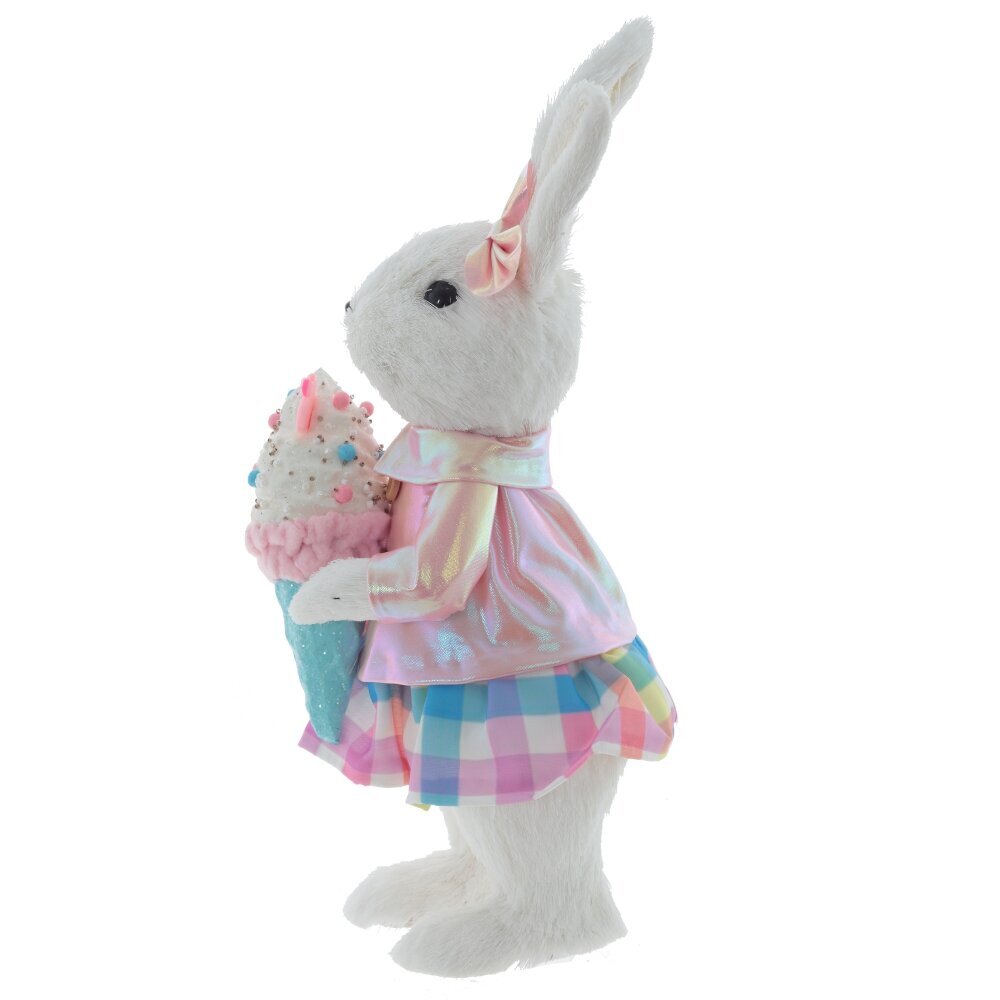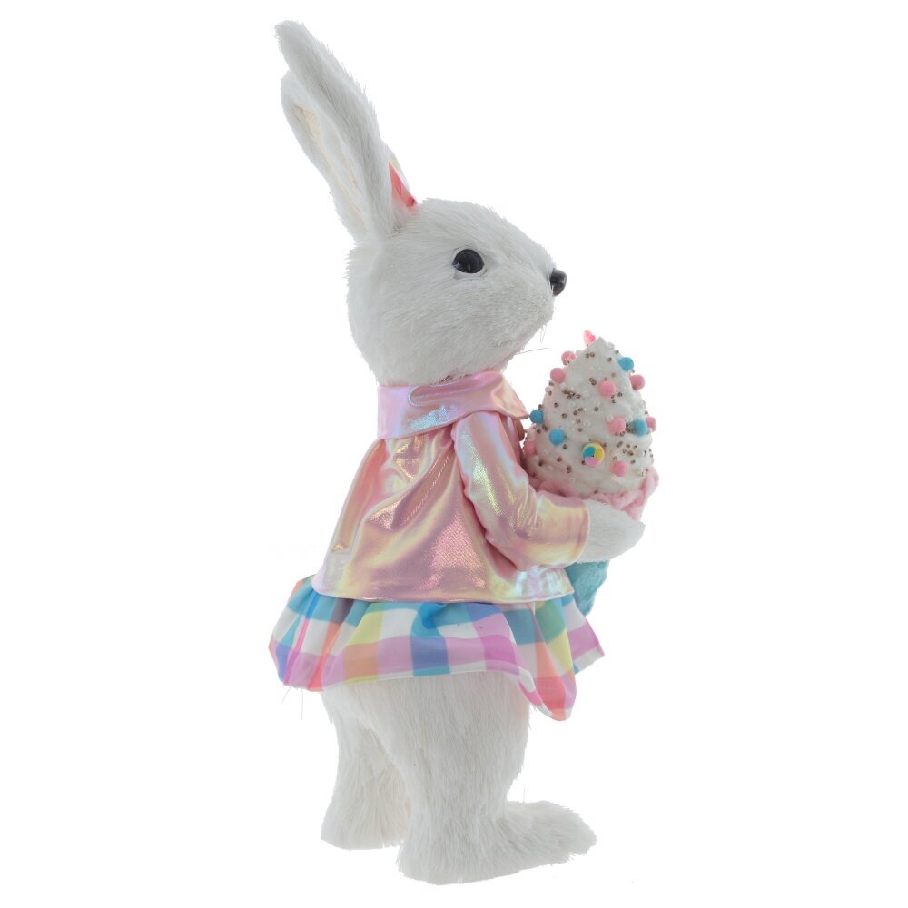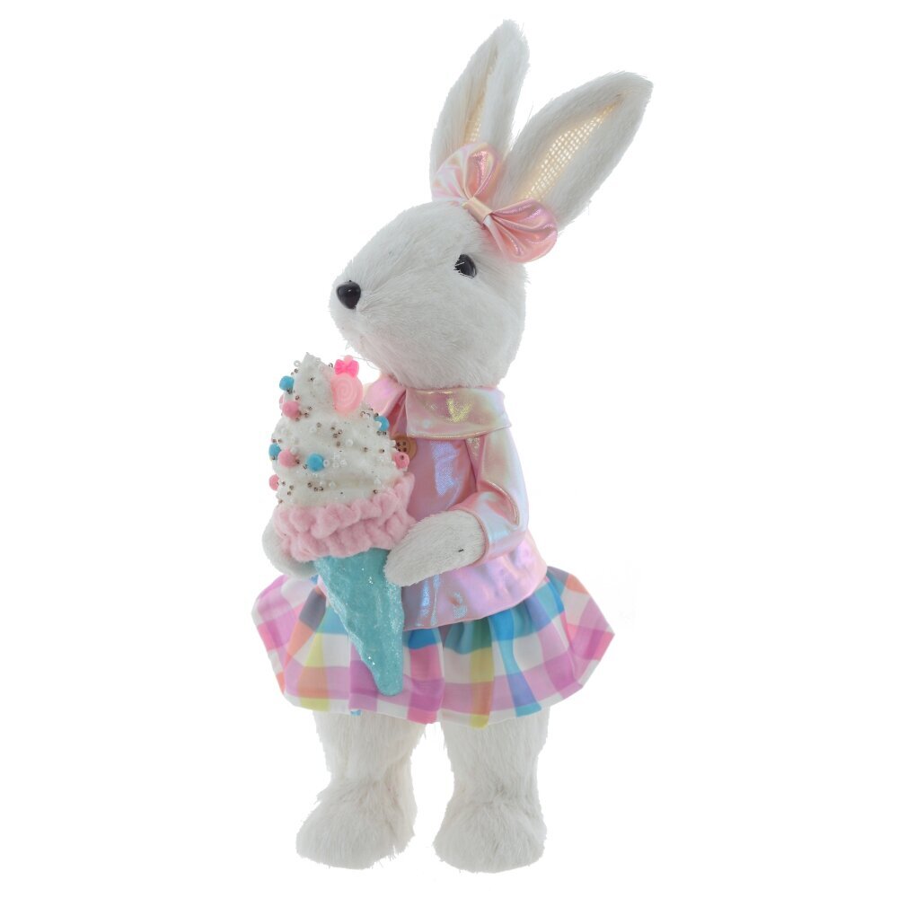Эта очаровательная пасхальная зайка выполнена из полимерных и текстильных материалов, сочетая в себе нежность и утонченность. Ее мягкое белоснежное тельце покрыто приятным на ощупь текстилем, создающим эффект пушистой шерстки. Ушки дополнены вставками из полупрозрачной ткани, придающими им легкость и воздушность. На голове зайки красуется изящный бантик из розового атласного материала, гармонирующий с ее праздничным нарядом. Зайка одета в блестящее перламутровое пальтишко с просторным воротником, которое переливается разными оттенками в зависимости от освещения. Пышная юбка выполнена из легкой ткани в клетку, объединяющую пастельные розовые, голубые, желтые и белые оттенки. Этот наряд делает зайку особенно нарядной и праздничной. В лапках она бережно держит аппетитное декоративное мороженое – вафельный рожок с белоснежной "сливочной" шапочкой, украшенной маленькими бусинками и нежными цветочными элементами. Глазки зайки выполнены с особым вниманием к деталям, придавая ее выражению мягкость и доброту. Такой декор будет идеально смотреться в пасхальной композиции, украшая интерьер дома и создавая атмосферу весеннего праздника.