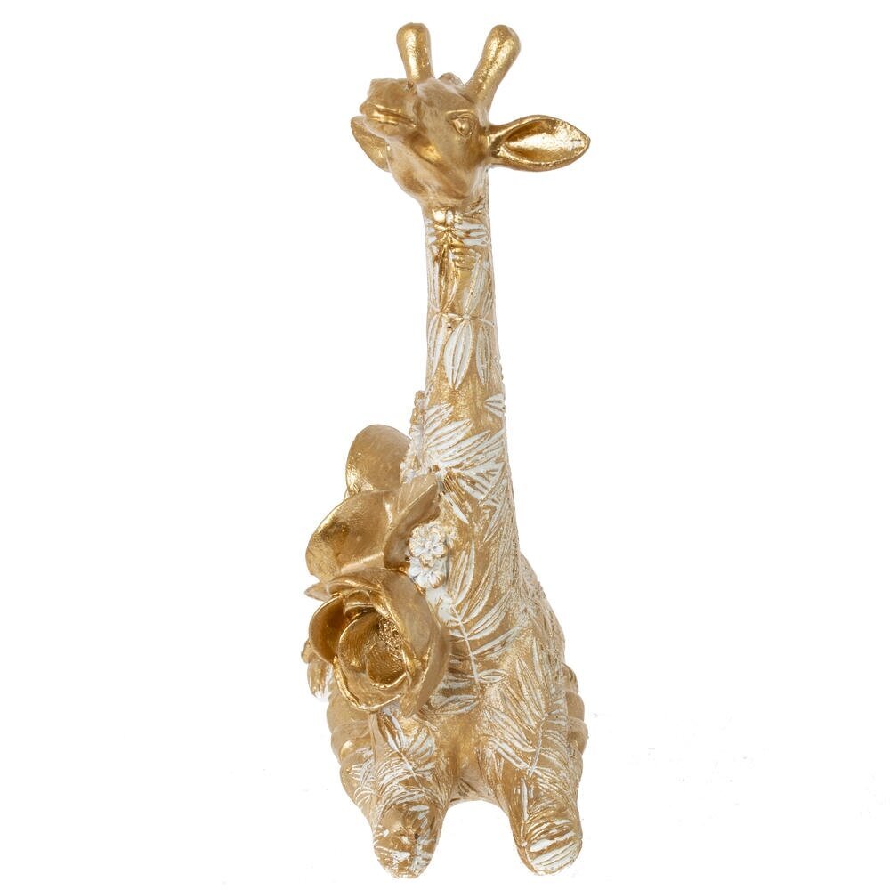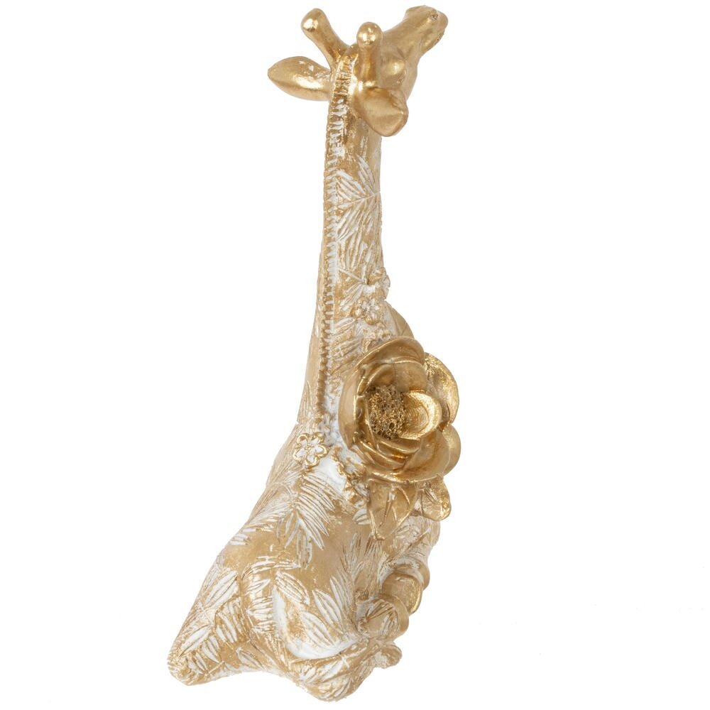 Декоративная фигурка «Жираф» — изящный акцент для вашего интерьера. Выполнена из прочных полимерных материалов и окрашена в благородный золотой цвет с легким белым патинированием, подчеркивающим рельеф растительного орнамента. Жираф изображён в спокойной позе, украшен объемными цветами и листьями, которые придают композиции романтичный и утончённый вид. Такая фигурка станет эффектным украшением полки, каминной полки или прикроватной тумбы, гармонично дополнив классический, современный или гламурный стиль помещения. Отличный вариант для подарка ценителям оригинального декора и любителям животных.