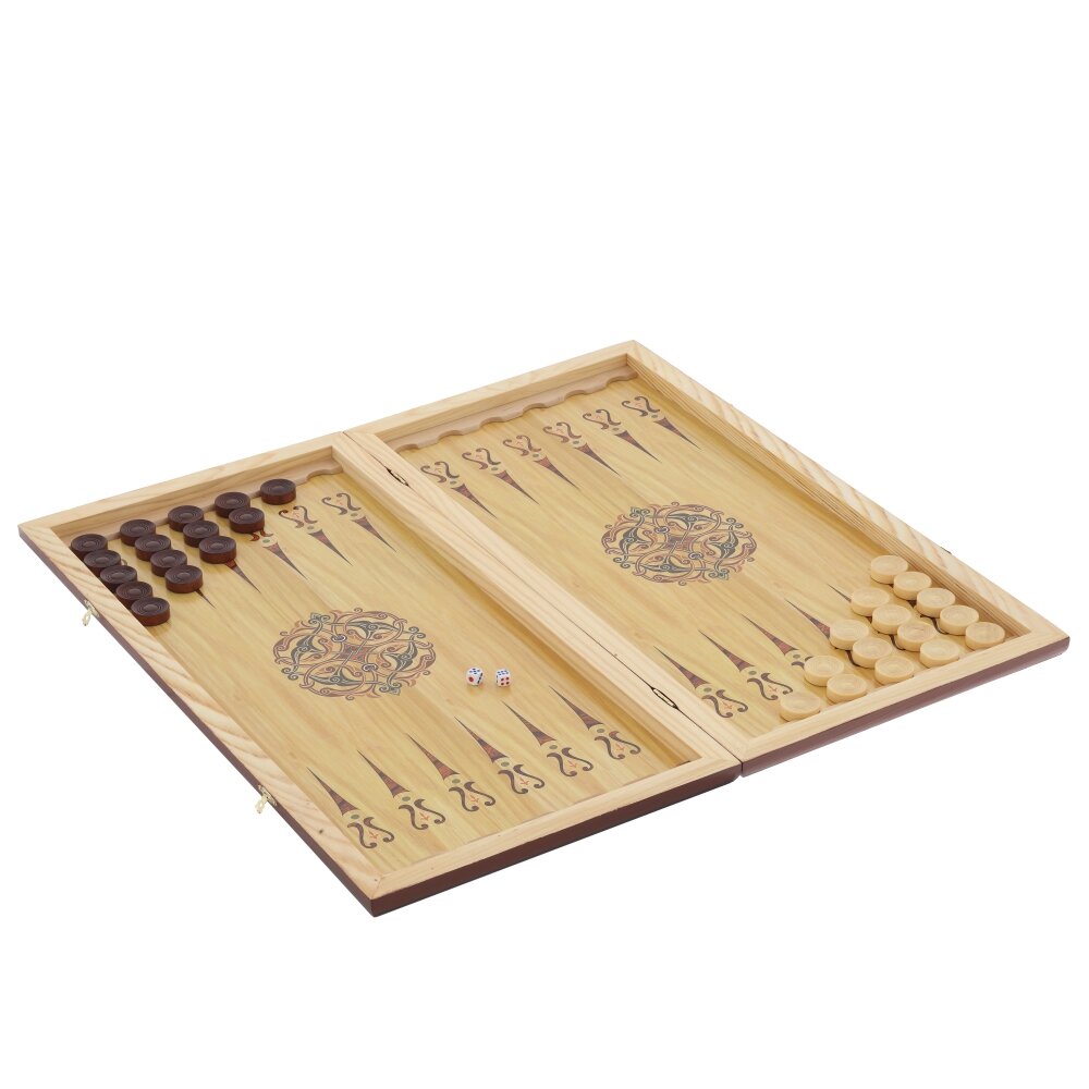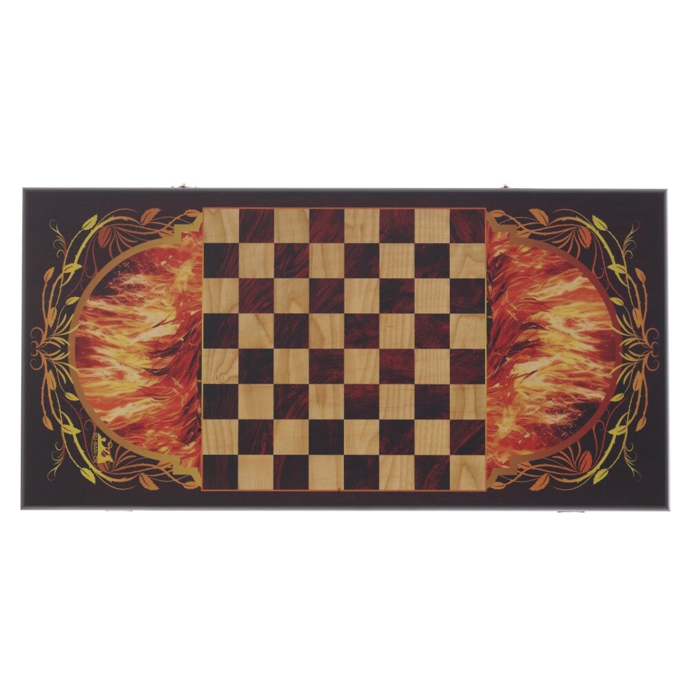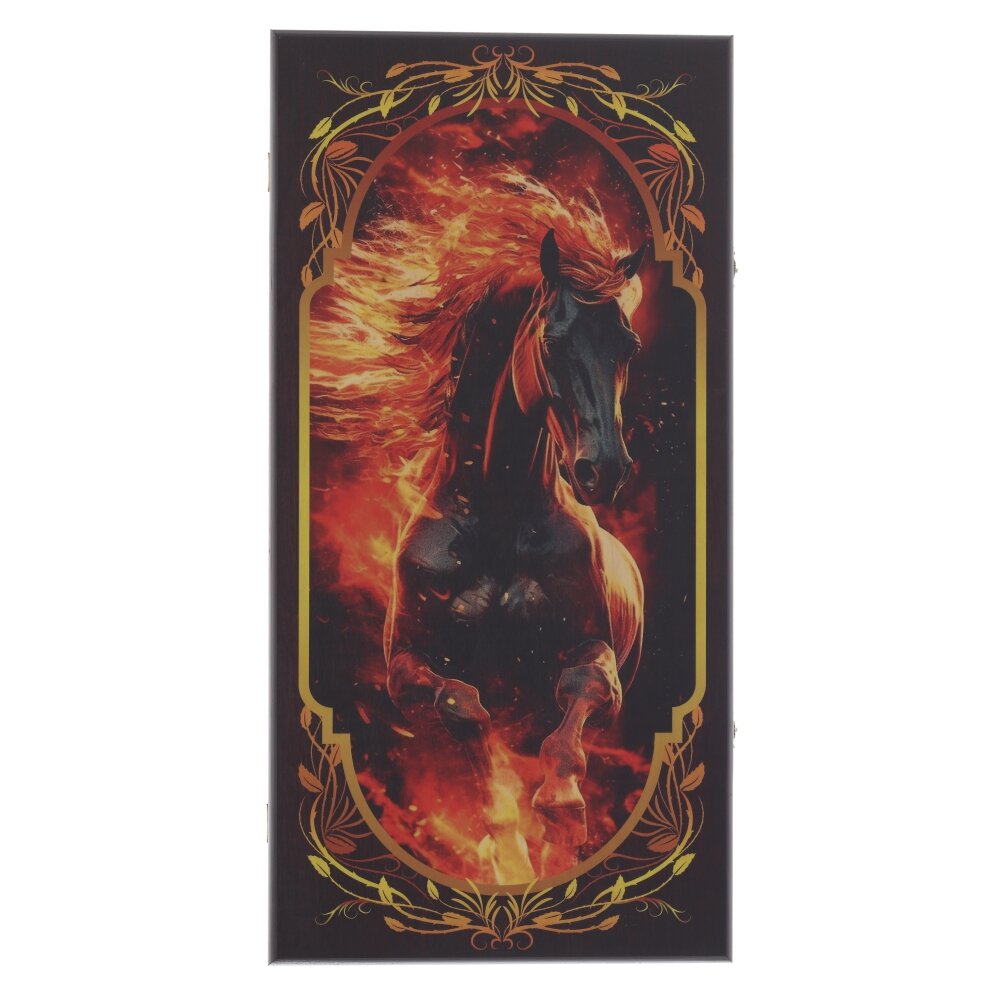 Настольная игра 2 в 1 «Огненная лошадь» — элегантный деревянный набор с двусторонним игровым полем для шашек и нард. Крышка украшена выразительным изображением пылающей лошади в декоративной рамке, что делает комплект эффектным подарком и стильной деталью интерьера. Размеры 60?30?4 см обеспечивают удобство игры и хранения, а прочный деревянный корпус приятно лежит в руках и устойчив к износу. Надежные фиксаторы помогают безопасно переносить набор. Снаружи — классическая разметка для шашек, внутри — поле для нард; все элементы аккуратно подогнаны. Подходит для домашних вечеров, офиса и путешествий, развивает внимание и стратегическое мышление, объединяет игроков разных возрастов.