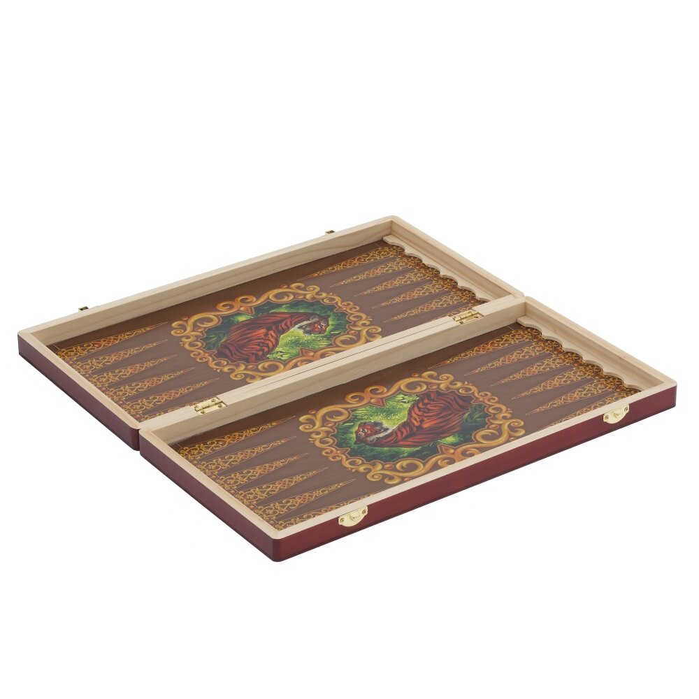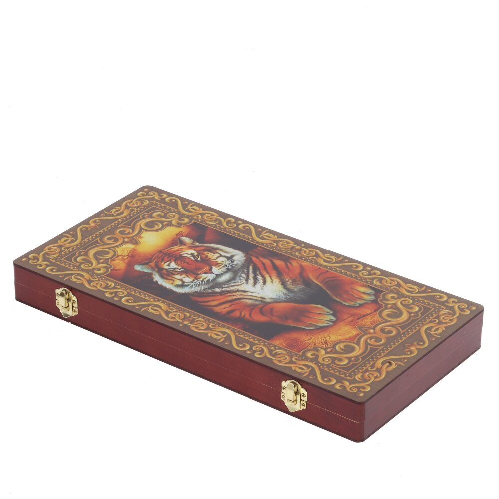 Настольная игра «Нарды» в деревянном исполнении — стильный и практичный вариант для ценителей классики. Игровое поле выполнено с надежными металлическими замками и петлями. Внутренняя сторона украшена ярким рисунком тигра и декоративным орнаментом, что придаёт игре особый восточный колорит. В комплект входят две группы деревянных фишек контрастных цветов и классические игральные кости. Поверхность поля гладкая, удобная для быстрого перемещения фишек. Такая игра подойдёт для домашних вечеров, поездок и станет эффектным подарком для друзей и коллег, любящих интеллектуальные настольные игры.