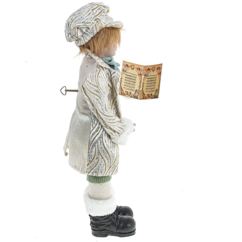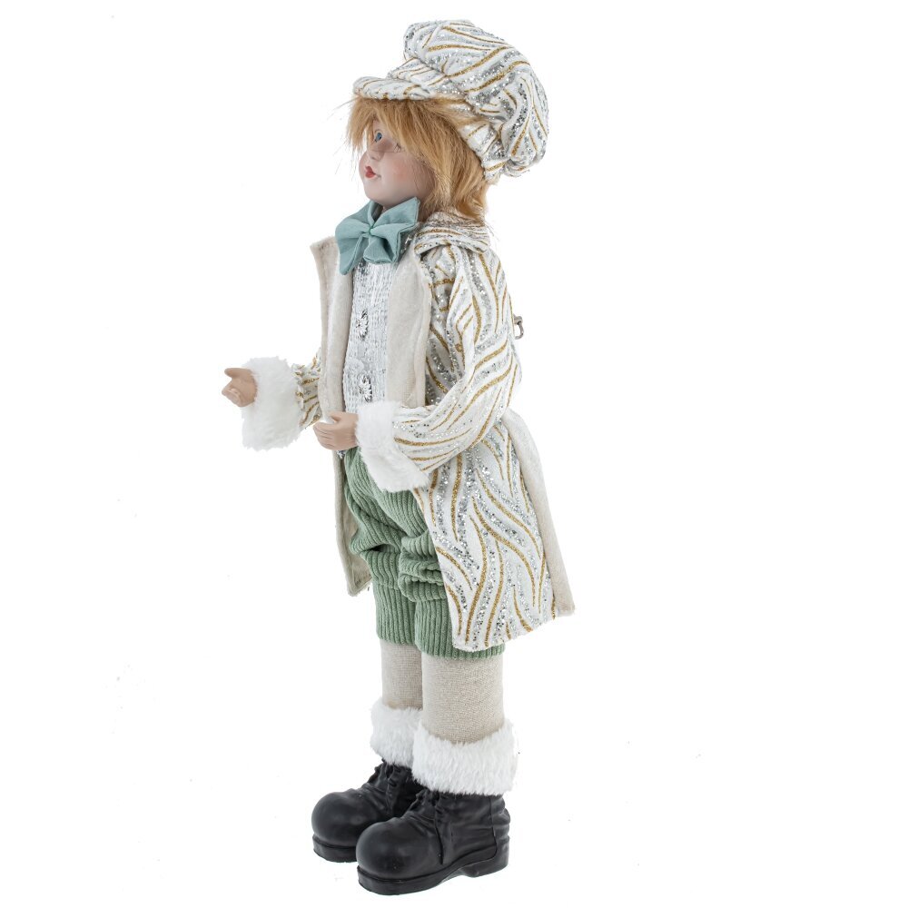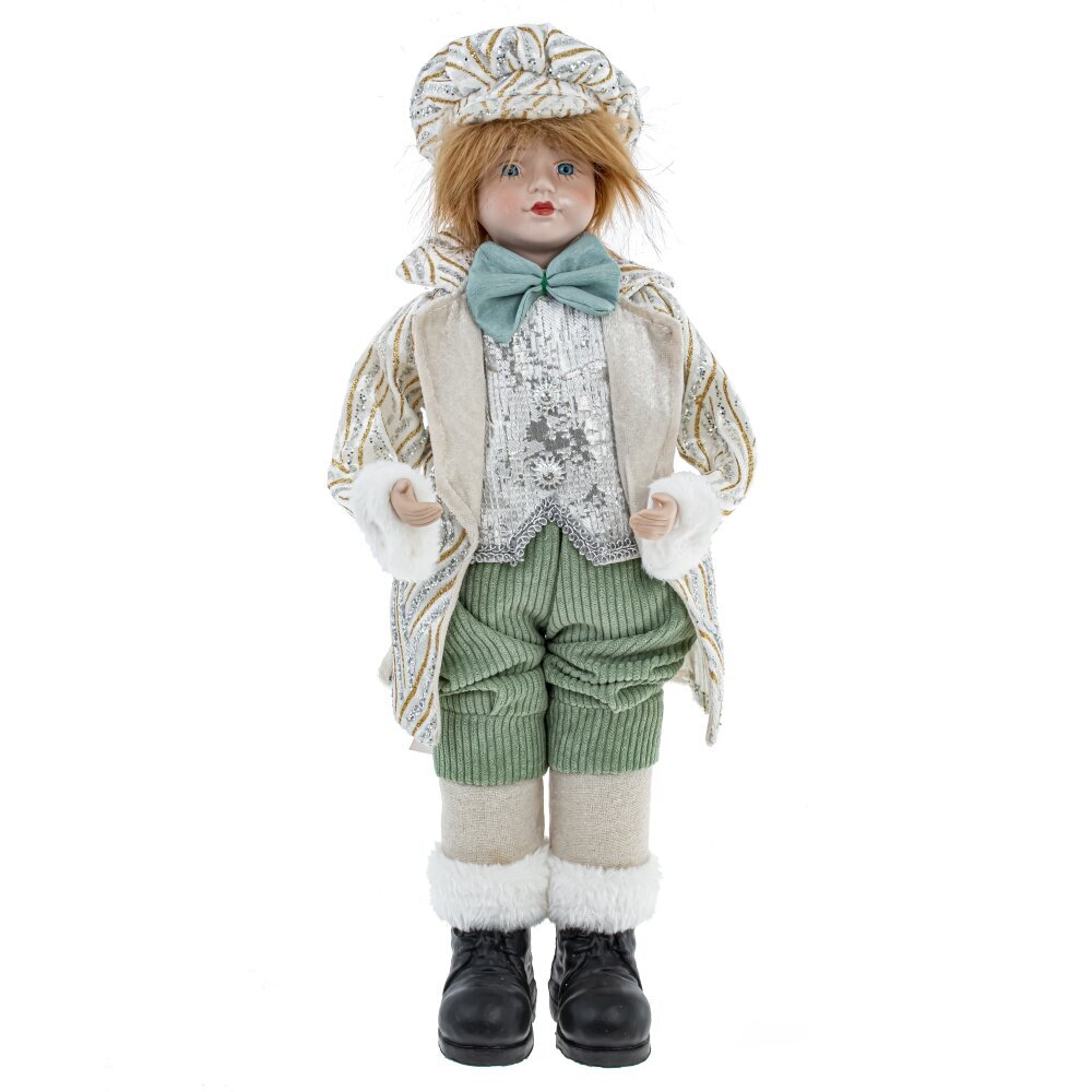 Интерьерная новогодняя игрушка "Мальчик" привносит в праздничную обстановку неповторимую атмосферу волшебства. Ее высота в 45 см делает ее заметным акцентом декора. Голова изящно выполненая из фарфора, добавляет игрушке выразительности. Кисти рук и ботиночки сделаны из полимерных материалов. Примечательно, что рукам данной игрушки можно придавать различные позы. Длинная челка из под берета, создает неповторимый образ, а праздничный камзол в светло-бежевом оттенке в сочетании с зелеными велюровыми кюлотами, серебряным жилетом и бабочкой подчеркивают стиль и изысканность игрушки. На спине расположен заводной ключик, активирующий рождественскую мелодию и движение головы, что делает эту куклу особенно впечатляющей и привлекательной для гостей и хозяев праздника.
