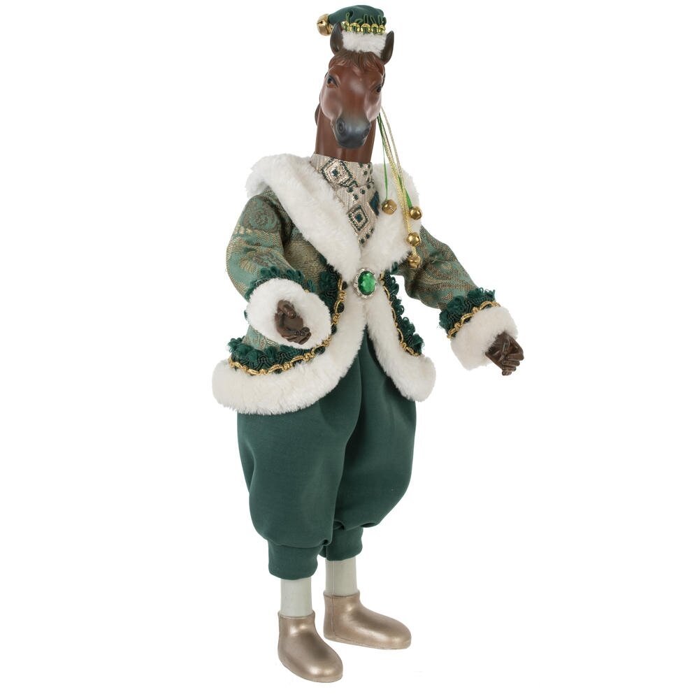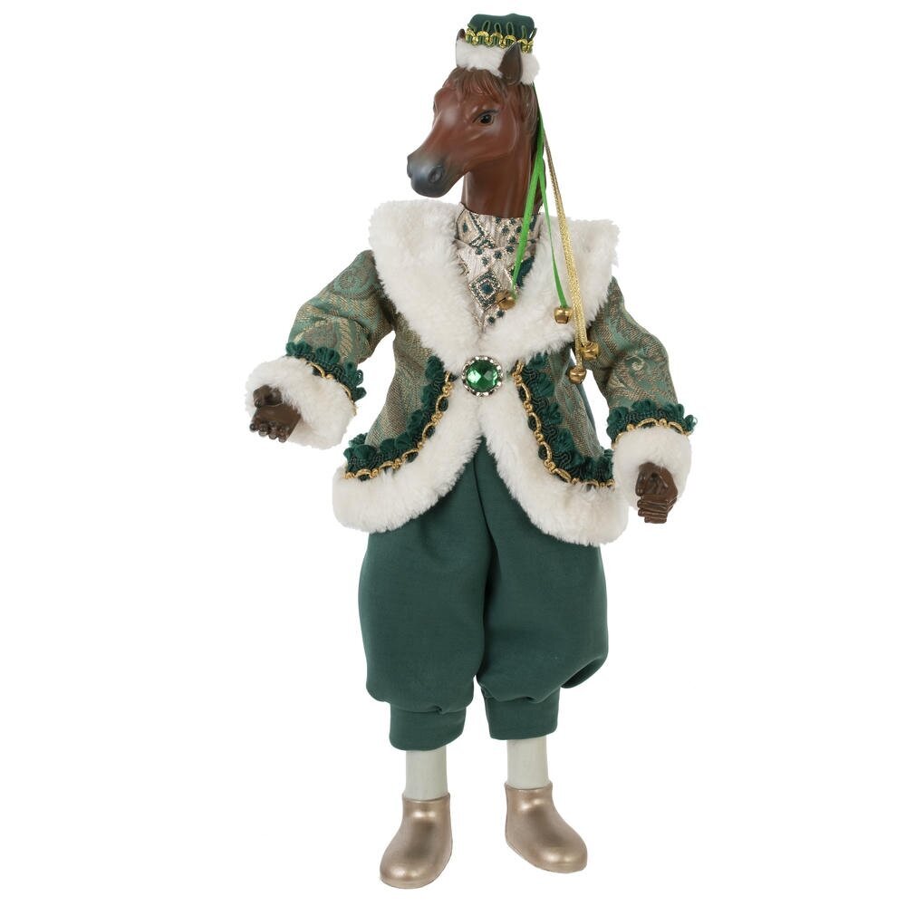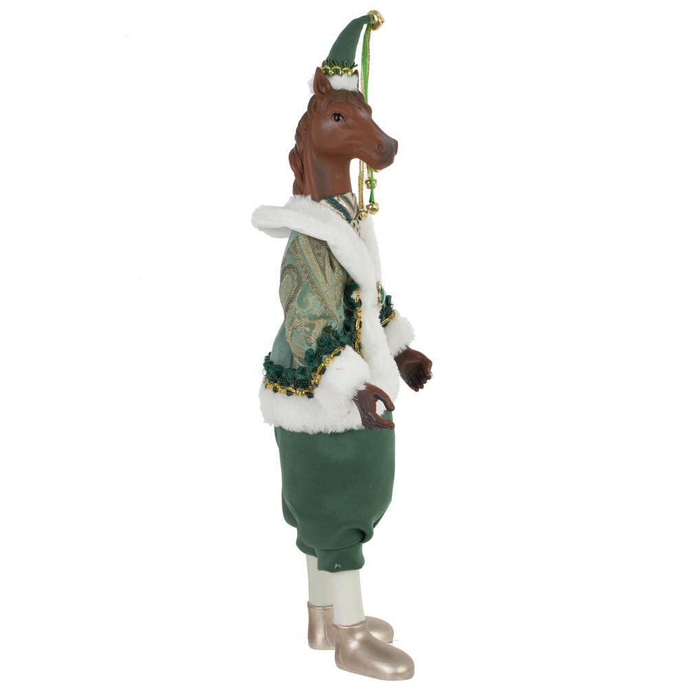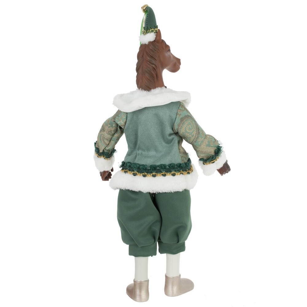 Набивная игрушка «Лошадь» — эффектная интерьерная фигурка, выполненная из сочетания полимерных и текстильных материалов. Мягкое набивное тело одето в нарядный костюм изумрудного оттенка: свободные шаровары, жакет с белым «меховым» кантом и узорчатые полупрозрачные рукава, украшенные золотистой тесьмой. На поясе и груди — декоративная брошь с «камнем», на голове мини-шапочка с лентами и подвесками. Лошадиная мордочка детализирована, ботинки аккуратно сформованы. Игрушка хорошо держит форму, приятна на ощупь и станет ярким акцентом коллекции или праздничного декора, а также необычным подарком.
