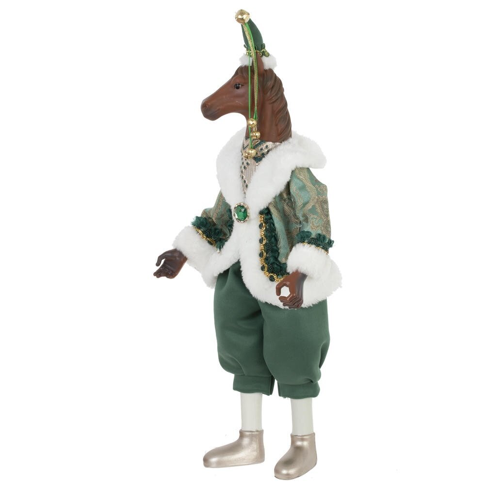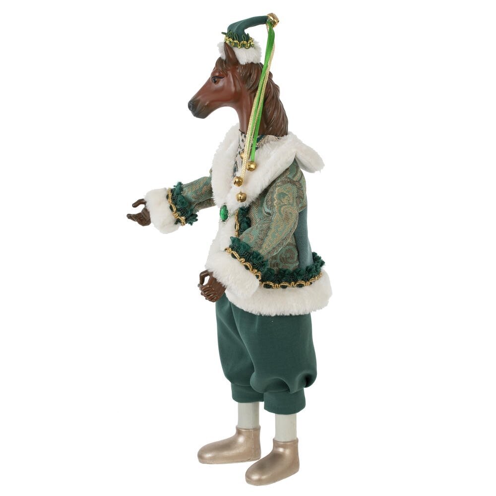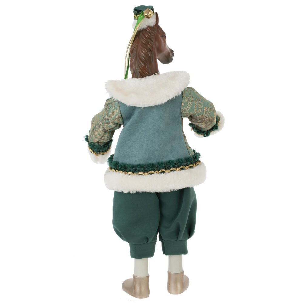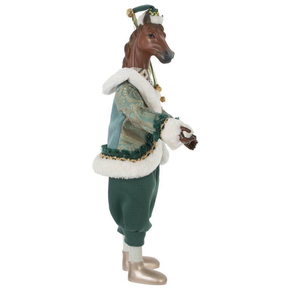 Набивная игрушка «Лошадь» — эффектная интерьерная фигурка, выполненная из сочетания полимерных и текстильных материалов. Мягкое набивное тело одето в нарядный костюм изумрудного оттенка: свободные шаровары, жакет с белым «меховым» кантом и узорчатые полупрозрачные рукава, украшенные золотистой тесьмой. На поясе и груди — декоративная брошь с «камнем», на голове мини-шапочка с лентами и подвесками. Лошадиная мордочка детализирована, ботинки аккуратно сформованы. Игрушка хорошо держит форму, приятна на ощупь и станет ярким акцентом коллекции или праздничного декора, а также необычным подарком.