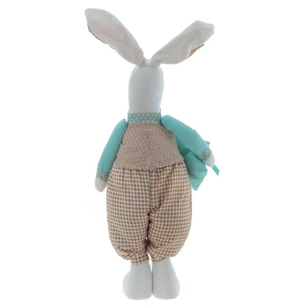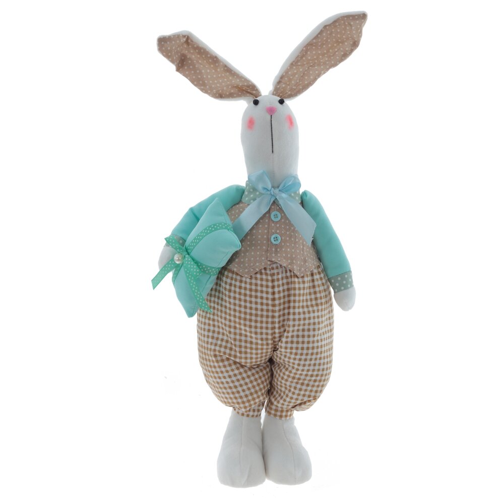 Набивная мягкая игрушка «Пасхальный зайчик» – очаровательный декор для весеннего интерьера и праздничного подарка детям и взрослым. Игрушка выполнена в нежной пастельной гамме с мятными и бежевыми оттенками и представлена в двух вариантах: зайка в платьице с фартуком и декоративным сердечком, а также зайчик в жилетке и клетчатых штанишках с бантом. Удлинённые ушки, аккуратная вышитая мордочка и румяные щёчки придают изделиям трогательный, «ручной» вид. Мягкий наполнитель делает зайцев приятными на ощупь. Такой пасхальный сувенир станет милым дополнением к любому подарку.