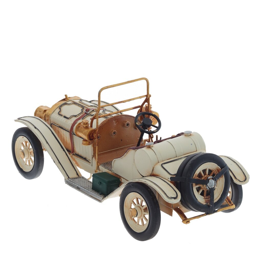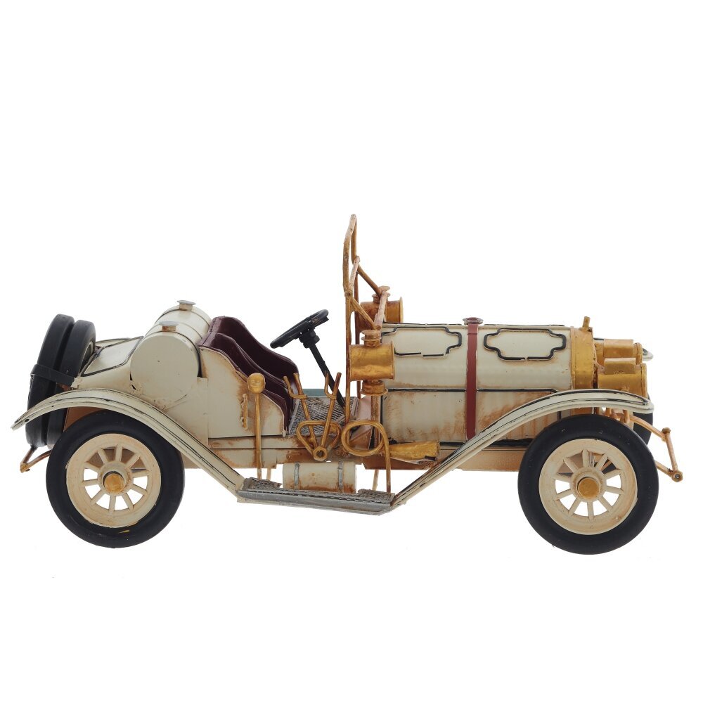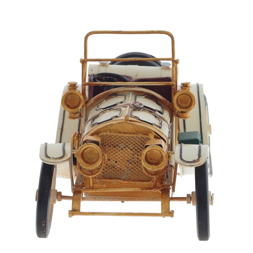 Декоративное изделие «Автомобиль» – изящная металлическая миниатюра в ретро-стиле, созданная для ценителей винтажных акцентов в интерьере. Модель детально проработана: открытый салон с двумя сиденьями, спицы на колесах, рулевое колесо, багажный отсек и имитация крепежей на кузове. Слегка состаренное покрытие с эффектом потертостей придаёт изделию шарм антикварной вещи, а сочетание светлого металла с золотистыми элементами делает его заметным интерьерным акцентом. Такой автомобиль отлично впишется в кабинет, гостиную или комнату подростка, добавив пространству характер и индивидуальность. Идеален как оригинальный подарок автолюбителю, коллеге или другу, увлекающемуся историей техники и необычными предметами декора.
