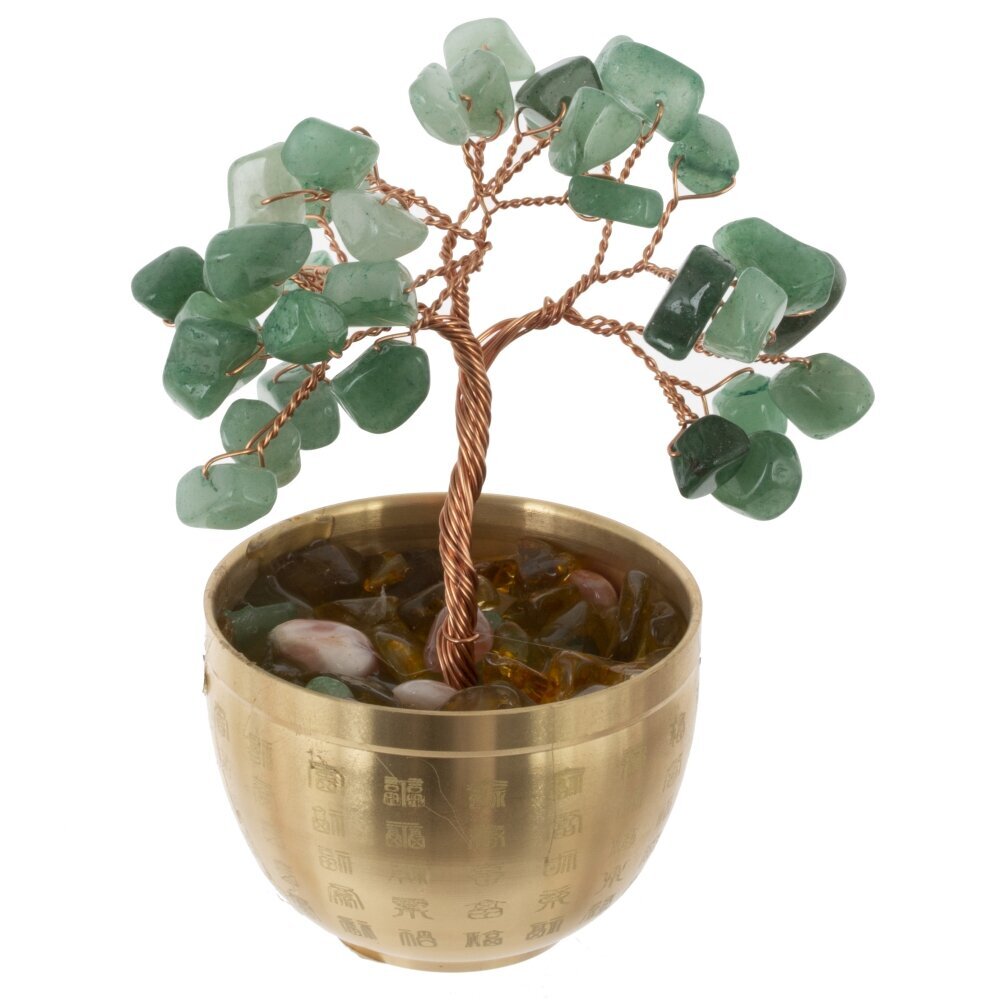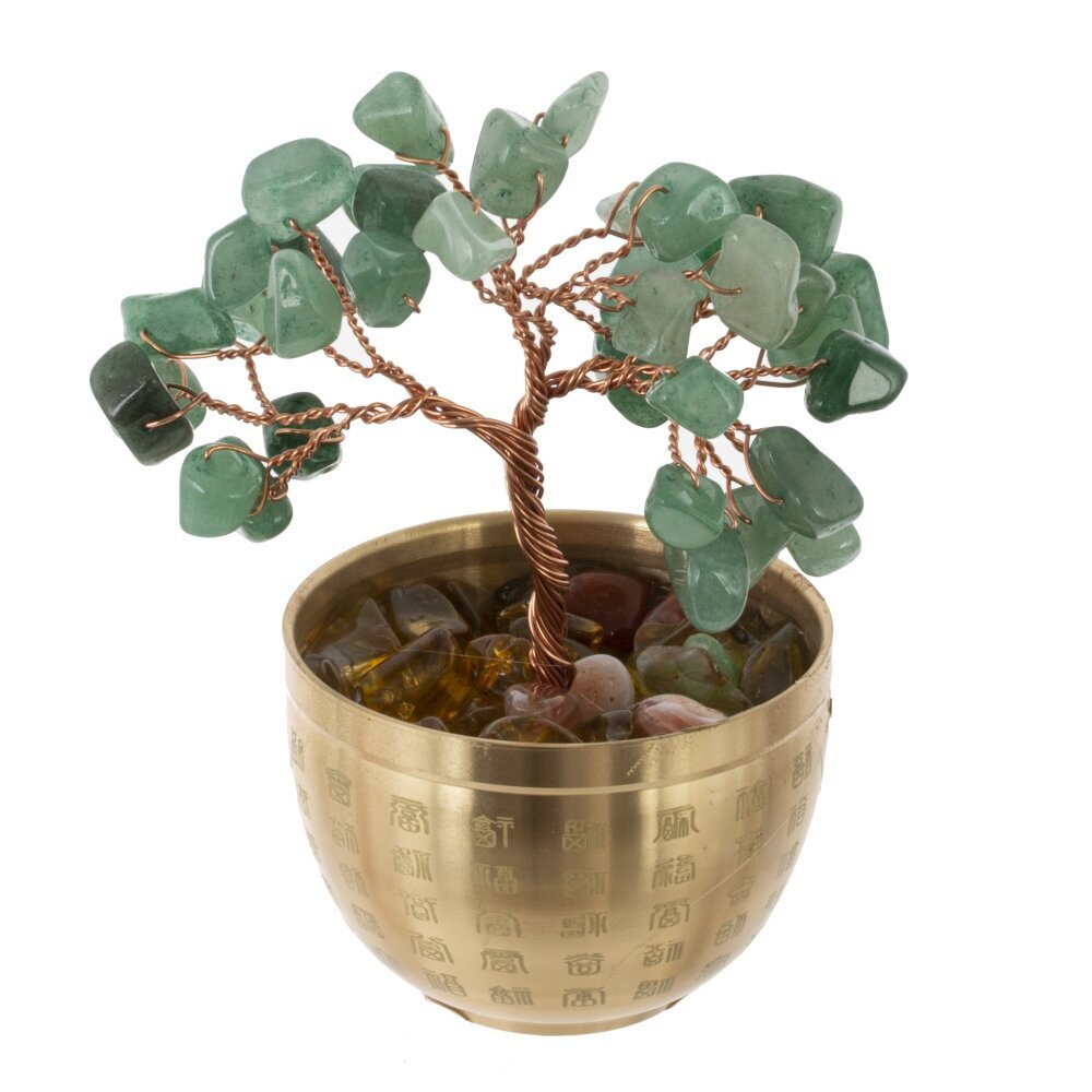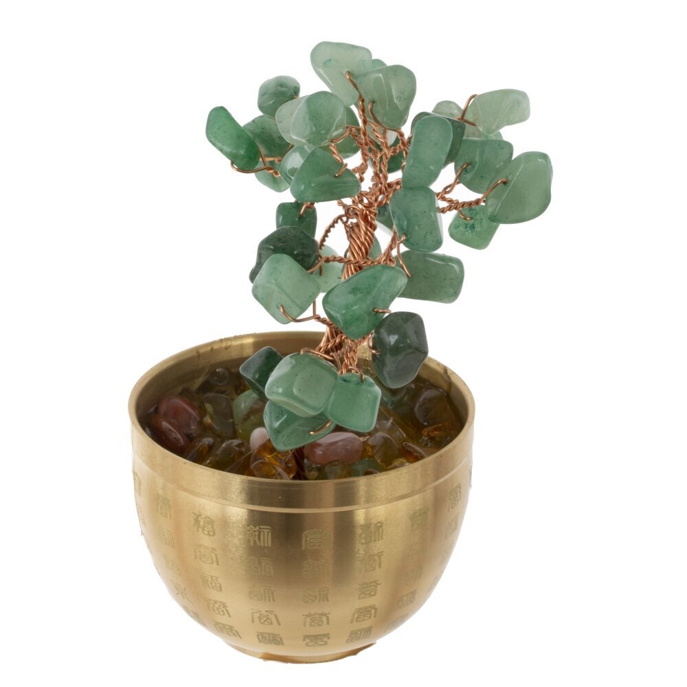 Декоративное изделие "Дерево", выполненное из натуральных материалов и металла. Ствол и ветви дерева искусно сплетены из тонкой проволоки, что придаёт изделию изящность и прочность. Листья дерева имитированы полированными зелёными натуральными минералами, которые создают эффект свежей зелени и натуральности. Основание дерева размещено в стильном металлическом горшке золотистого цвета, украшенном восточными иероглифами, что добавляет изделию особый шарм и загадочность. Вокруг ствола на поверхности видны декоративные камни различных оттенков, подчеркивающие натуральность композиции. Такое дерево станет отличным украшением интерьера, символизируя гармонию, процветание и природную красоту. Оно прекрасно впишется в офис, гостиную или спальню, а также может стать оригинальным подарком для ценителей необычных и символичных аксессуаров.