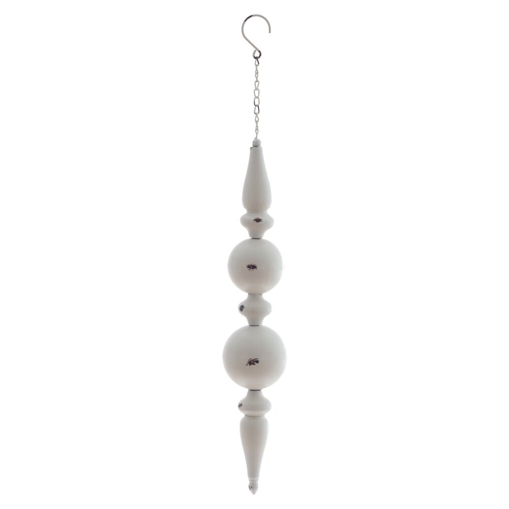 Новогоднее украшение из металла – декоративное подвесное украшение с симметричным дизайном, состоящее из сфер разного диаметра, складывающихся вертикально. Украшение подвешено на металлической цепочке с крючком сверху. Выглядит элегантно и подойдет для создания праздничной атмосферы в вашем интерьере.