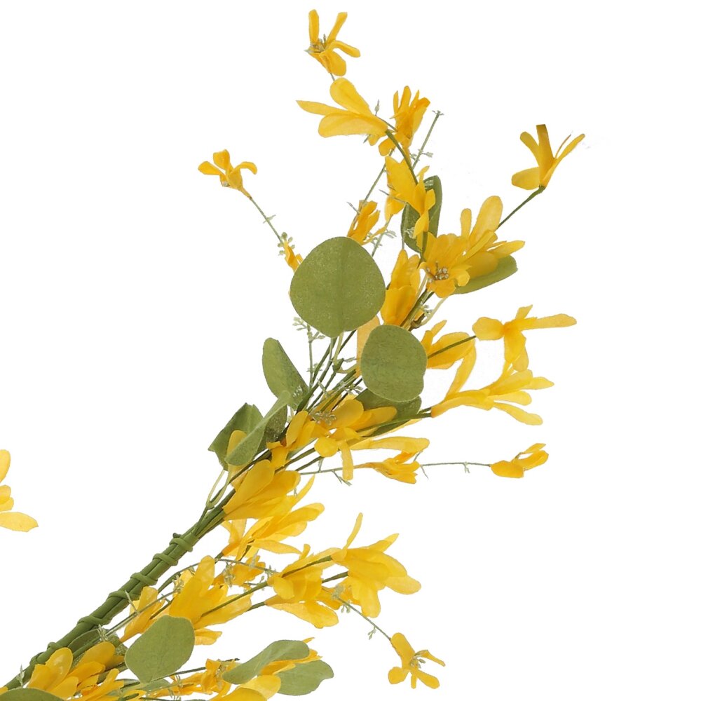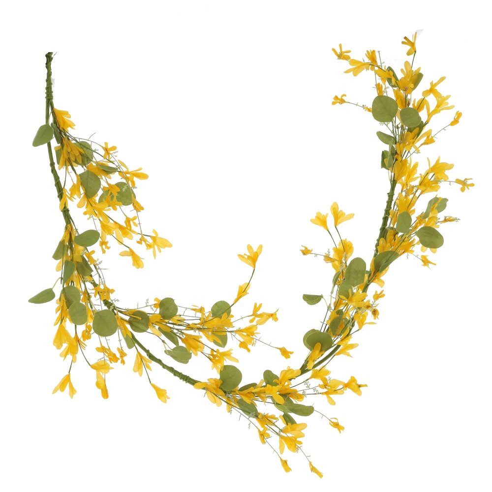 Эта изысканная пасхальная гирлянда станет прекрасным украшением для дома, создавая атмосферу весеннего уюта и праздника. Ее длина позволяет разместить ее на дверях, стенах, камине или праздничном столе. Гирлянда выполнена из качественных полимерных материалов, что делает ее долговечной и устойчивой к внешним воздействиям. Основа украшения включает металлическую проволоку, обеспечивающую гибкость и удобство при фиксации. Гирлянда оформлена веточками с нежными цветами и листвой в пастельных оттенках, создавая эффект натуральной растительности. В ее дизайне сочетаются нежно-желтые цветы, а также зелёные элементы различного оттенка, придающие композиции свежесть и легкость. Такое украшение идеально впишется в интерьер в стиле рустик, прованс или классический декор и подчеркнет весеннее обновление в доме.