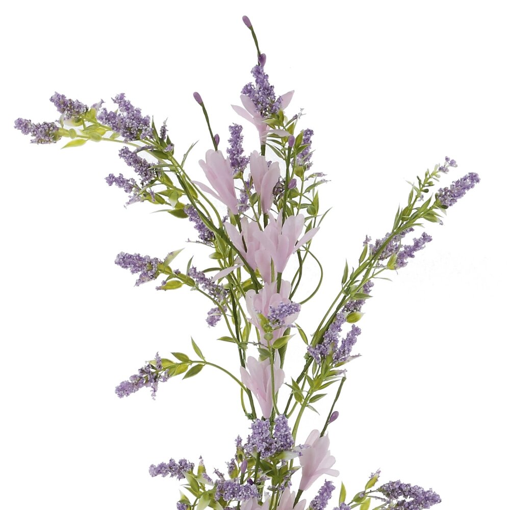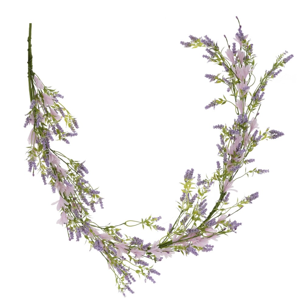 Эта изысканная пасхальная гирлянда станет прекрасным украшением для дома, создавая атмосферу весеннего уюта и праздника. Ее длина позволяет разместить ее на дверях, стенах, камине или праздничном столе. Гирлянда выполнена из качественных полимерных материалов, что делает ее долговечной и устойчивой к внешним воздействиям. Основа украшения включает металлическую проволоку, обеспечивающую гибкость и удобство при фиксации. Гирлянда оформлена веточками с нежными цветами и листвой в пастельных оттенках, создавая эффект натуральной растительности. В ее дизайне сочетаются сиреневые, белые и нежно-розовые цветы, а также зелёные элементы различного оттенка, придающие композиции свежесть и легкость. Такое украшение идеально впишется в интерьер в стиле рустик, прованс или классический декор и подчеркнет весеннее обновление в доме.