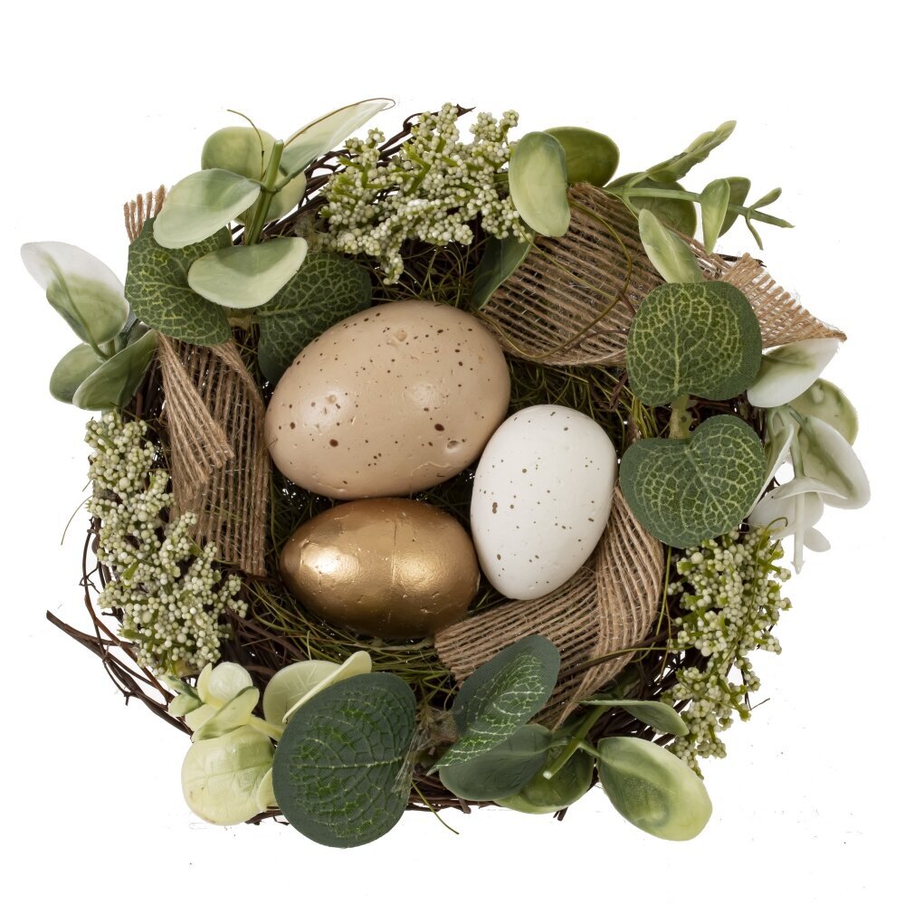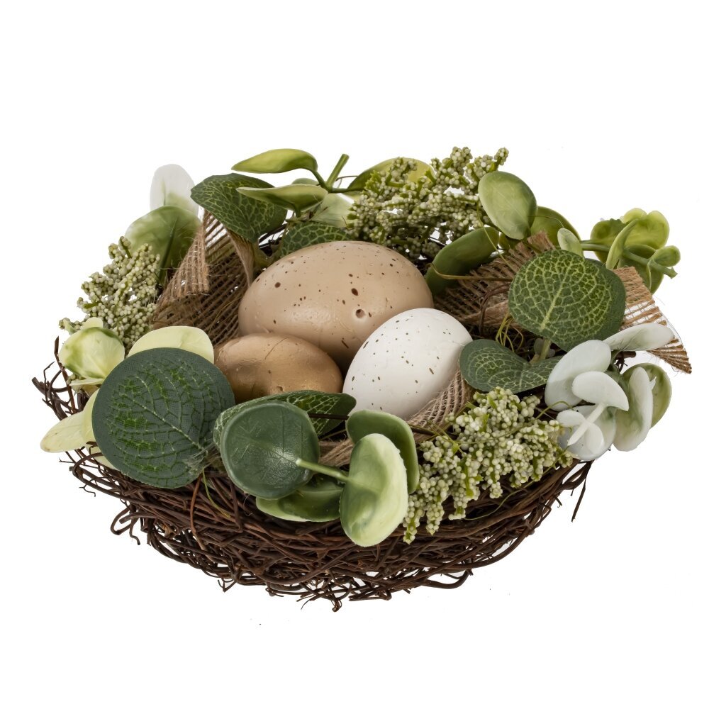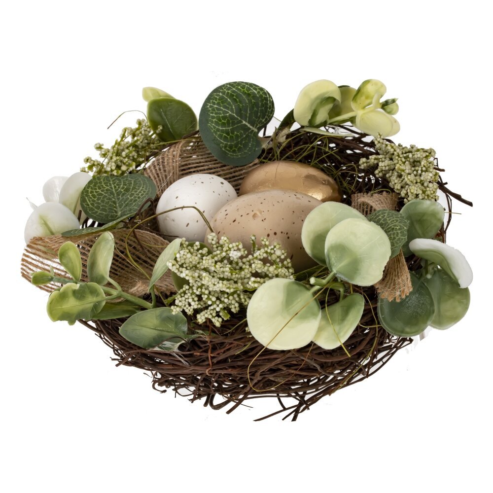 Декоративное изделие "Гнездо пасхальное" станет отличным украшением вашего дома в преддверии праздника Пасхи. Размеры изделия составляют 15 см в длину, 14,5 см в ширину и 8 см в высоту, что позволяет ему гармонично вписаться в любую интерьерную композицию. Гнездо, изготовленное из натуральных материалов, создает атмосферу уюта и тепла. Искусственные зеленые веточки и цветы добавляют свежести и создают ощущение весеннего пробуждения. Декоративные яйца бежевого и золотого цветов символизируют обновление и богатство жизни, что делает это изделие не только визуально привлекательным, но и наполненным глубоким смыслом. Такой элемент декора отлично подойдет для оформления стола, каминной полки. "Гнездо пасхальное" прекрасно дополняет как традиционный, так и современный стиль интерьера, а также станет замечательным подарком для ваших близких, даря им атмосферу благополучия и счастья на праздники. Удивите своих родных и друзей, украсив дом этим изысканным изделием, которое будет радовать глаз и поднимать настроение.