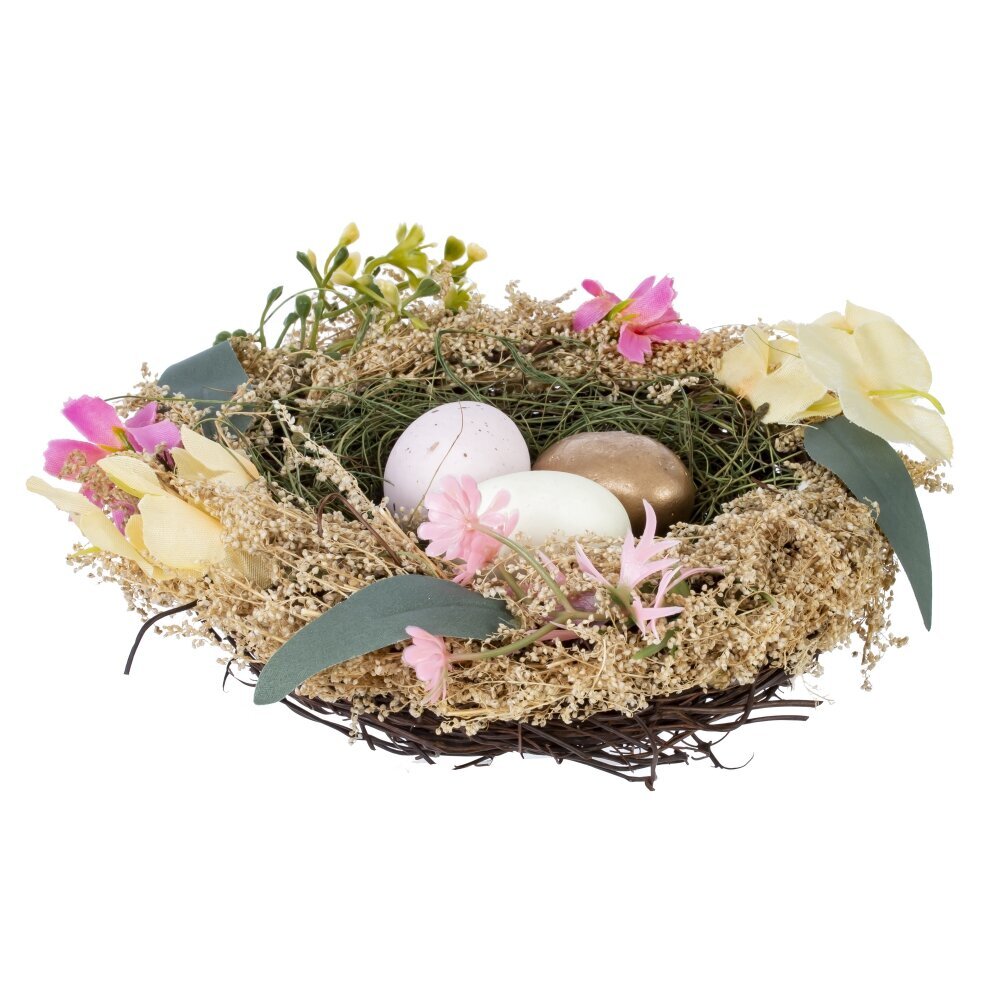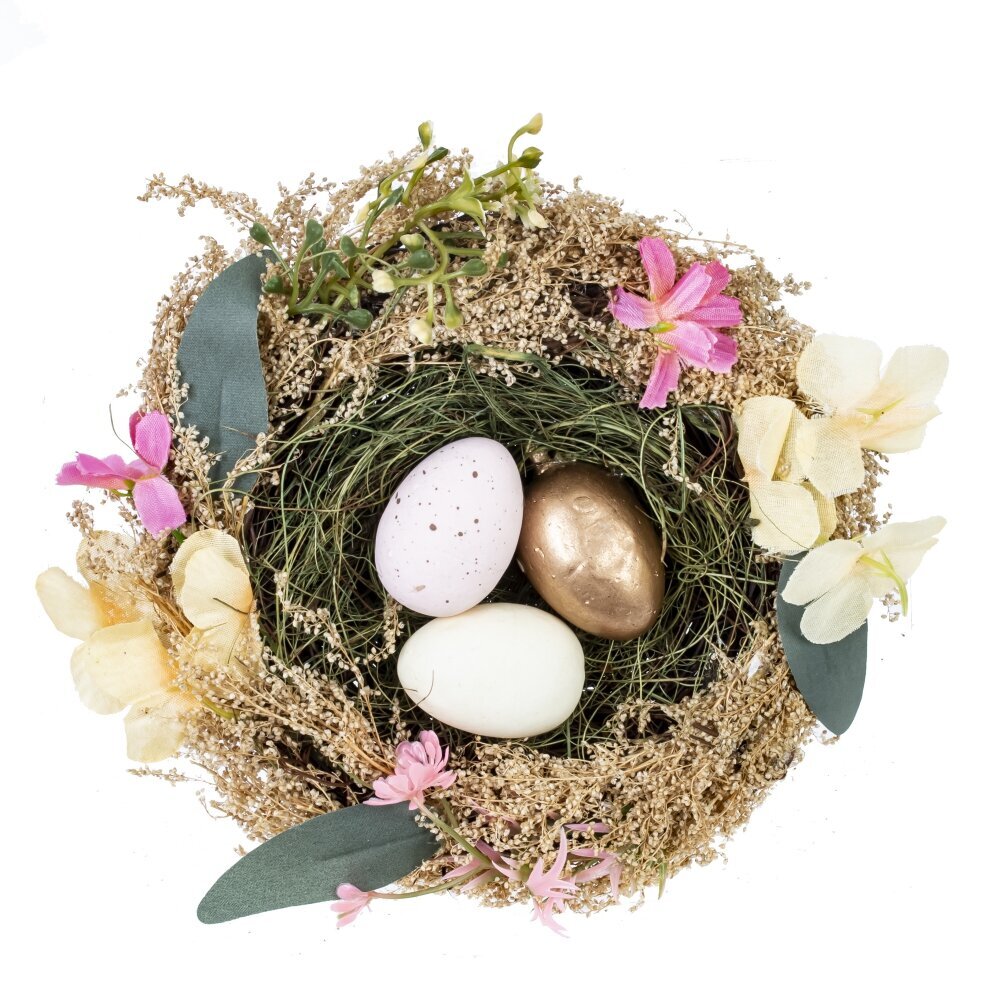 Декоративное изделие «Гнездо пасхальное» — изящный акцент для весеннего украшения дома, праздничного стола или витрины. Основа выполнена из натуральных материалов, имитирующих сухую траву и прутья, внутри расположено мягкое зелёное «сено». В центре гнезда — три пасхальных яйца из полимерных материалов: белое, нежно-розовое с крапинками и эффектное золотистое. Композиция дополнена искусственными листочками и цветами пастельных оттенков, которые подчёркивают атмосферу обновления и уюта. Лёгкое и долговечное изделие не требует ухода и будет радовать вас не один сезон.