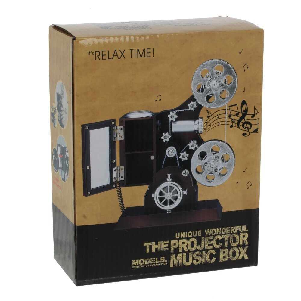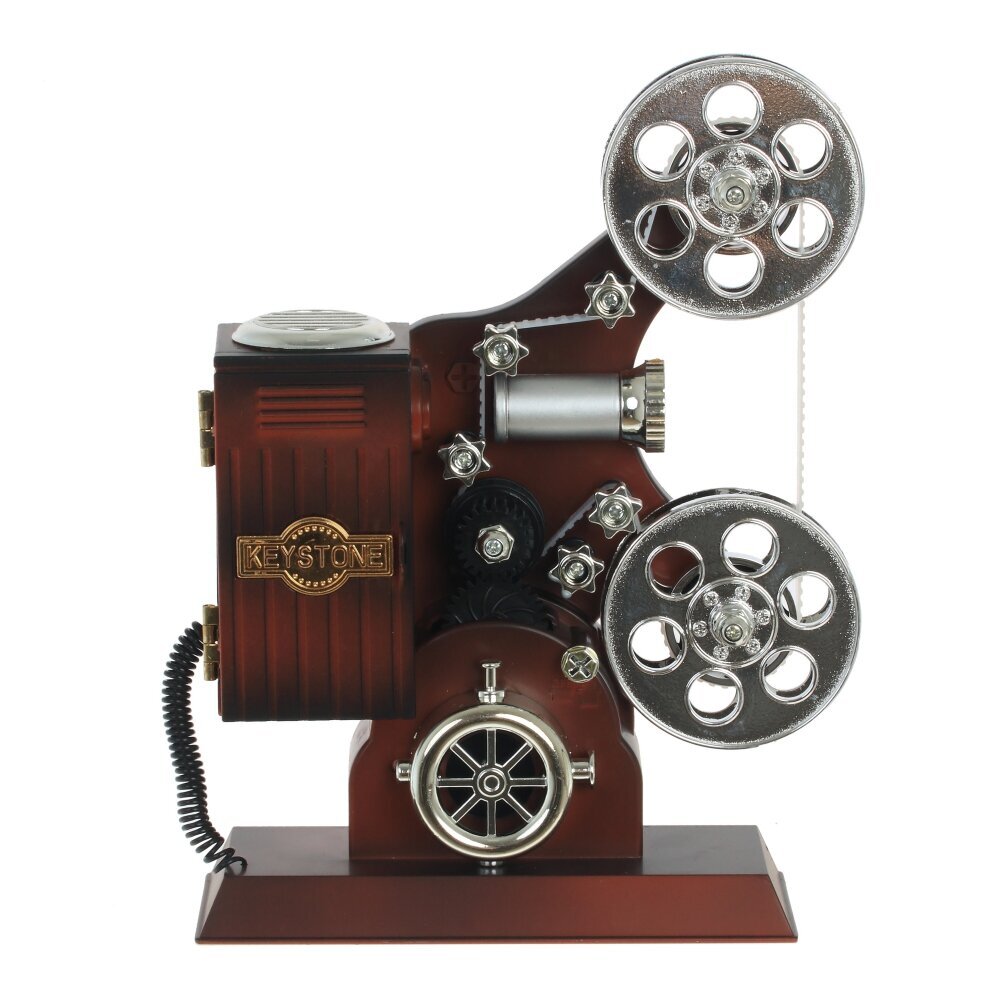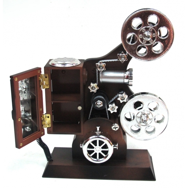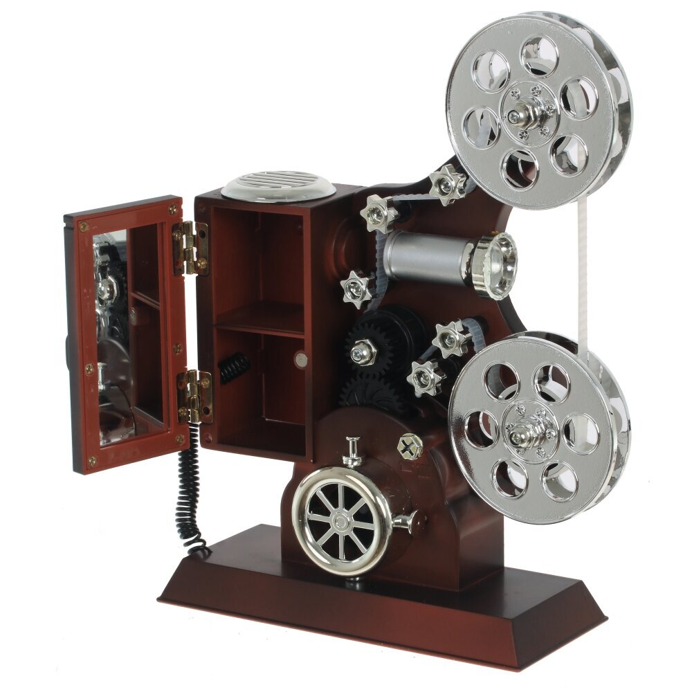 Декоративное музыкальное изделие в форме ретро-кинопроектора с заводным механизмом. Корпус стилизован под дерево, имеет катушки и шестерни, на лицевой части — крупное рифлёное колесо. Сбоку предусмотрена дверца на металлических петлях с небольшими полочками для мелочей. Детали тщательно проработаны: зубчатые передачи, ременные ролики, вентиляционные решётки. При заводе ключом запускается музыкальная шкатулка: звучит мелодия, а катушки плавно вращаются, создавая эффект работы старого аппарата. Устойчивое основание позволяет разместить модель на столе, комоде или витрине. Такой аксессуар станет ярким акцентом интерьера, подарком для киноманов и ценителей винтажной техники, добавляя уют и ностальгию без необходимости батареек.