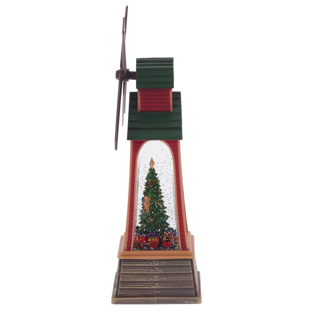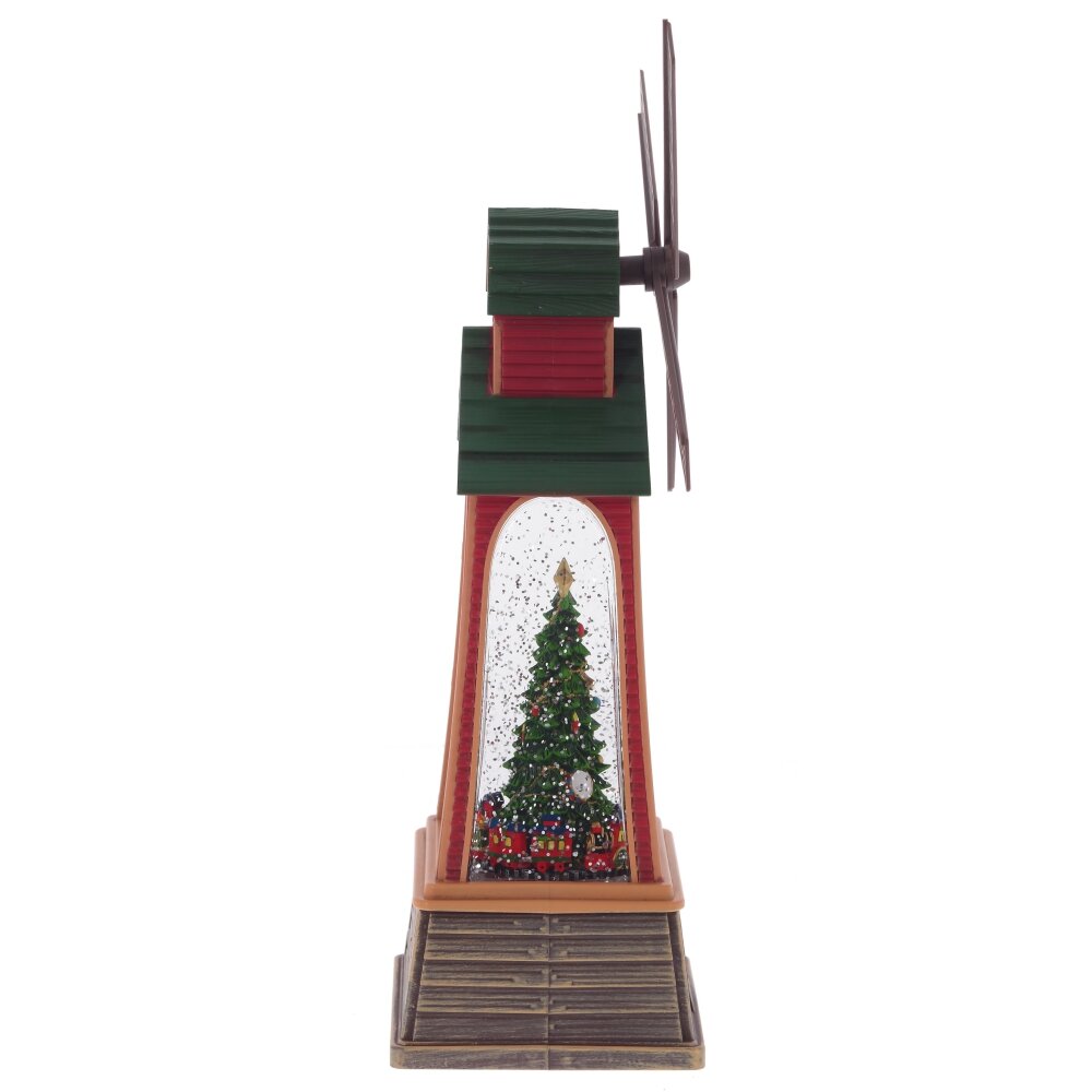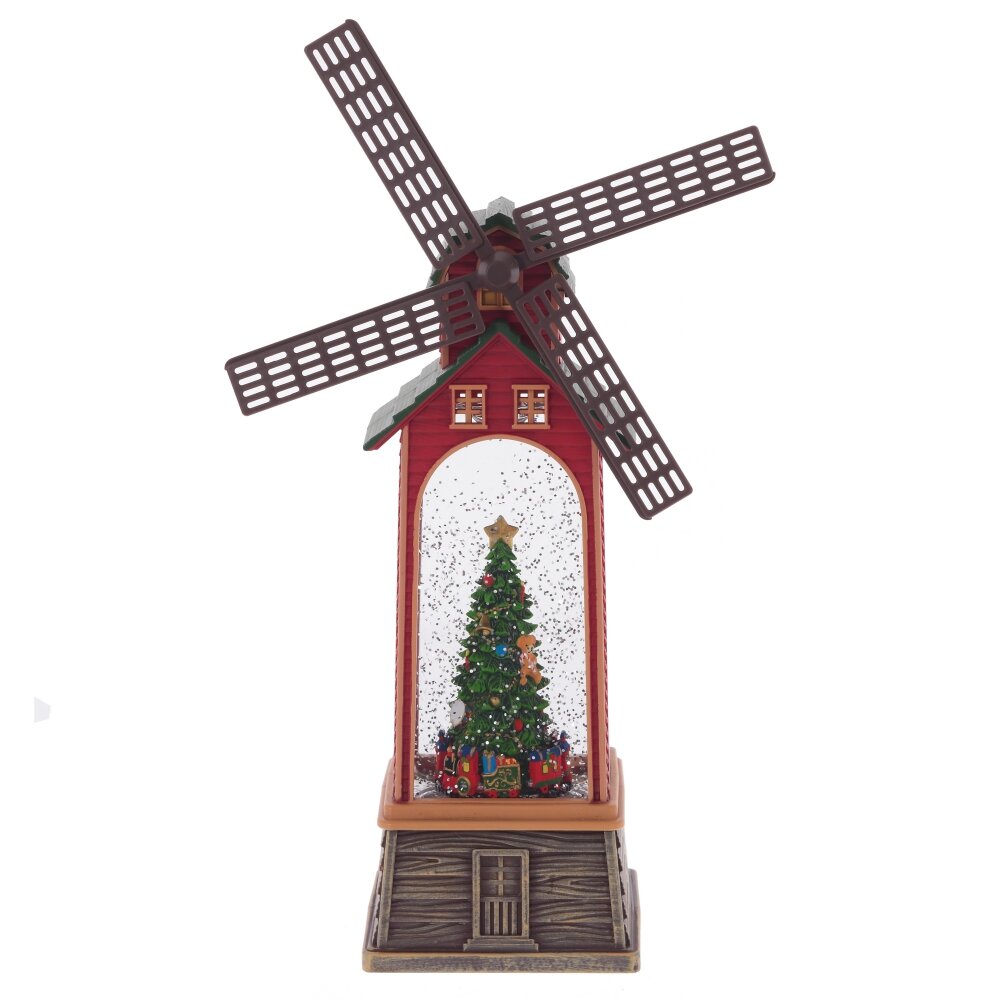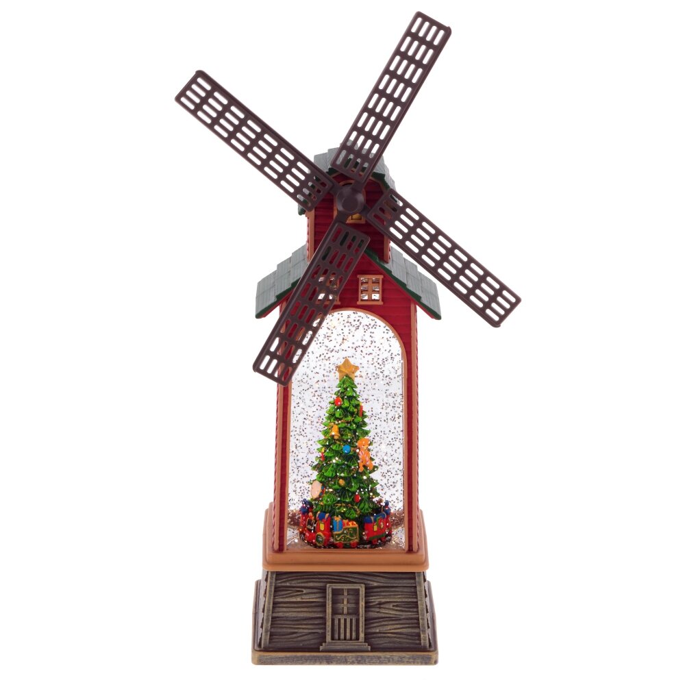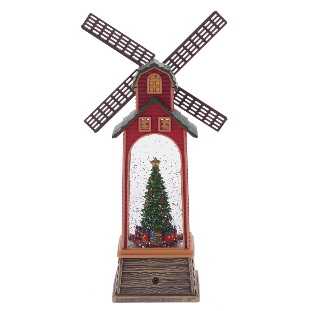 Фигурка декоративная "Мельница" - уникальное новогоднее украшение в виде ветряной мельницы, наполненной жидкостью с блестками. В центре композиции расположена наряженная ель с паровозиком у ее основания. На дне изделия предусмотрен рычаг, который запускает 8 различных новогодних и рождественских мелодий, активирует подсветку и имитирует вьюгу, одновременно приводя в движение крылья мельницы.