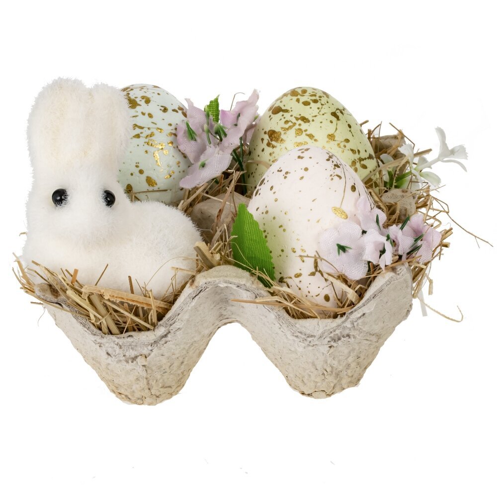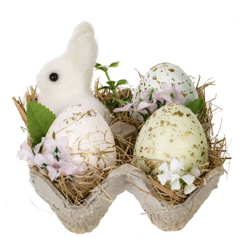 Декоративное изделие "Пасхальная композиция" станет прекрасным украшением дома или праздничного стола. Композиция выполнена из полимерных и натуральных материалов, сочетая искусственные яйца с золотыми вкраплениями, фигурку пушистого белого кролика и декоративные элементы, такие как солома, искусственные цветы и зелень. Декор помещен в стильную картонную подставку, имитирующую упаковку для яиц, что придает композиции естественный и уютный вид. Такой пасхальный декор создаст весеннее настроение и подчеркнет атмосферу светлого праздника. Он прекрасно подойдет как элемент сервировки праздничного стола или как подарок близким.