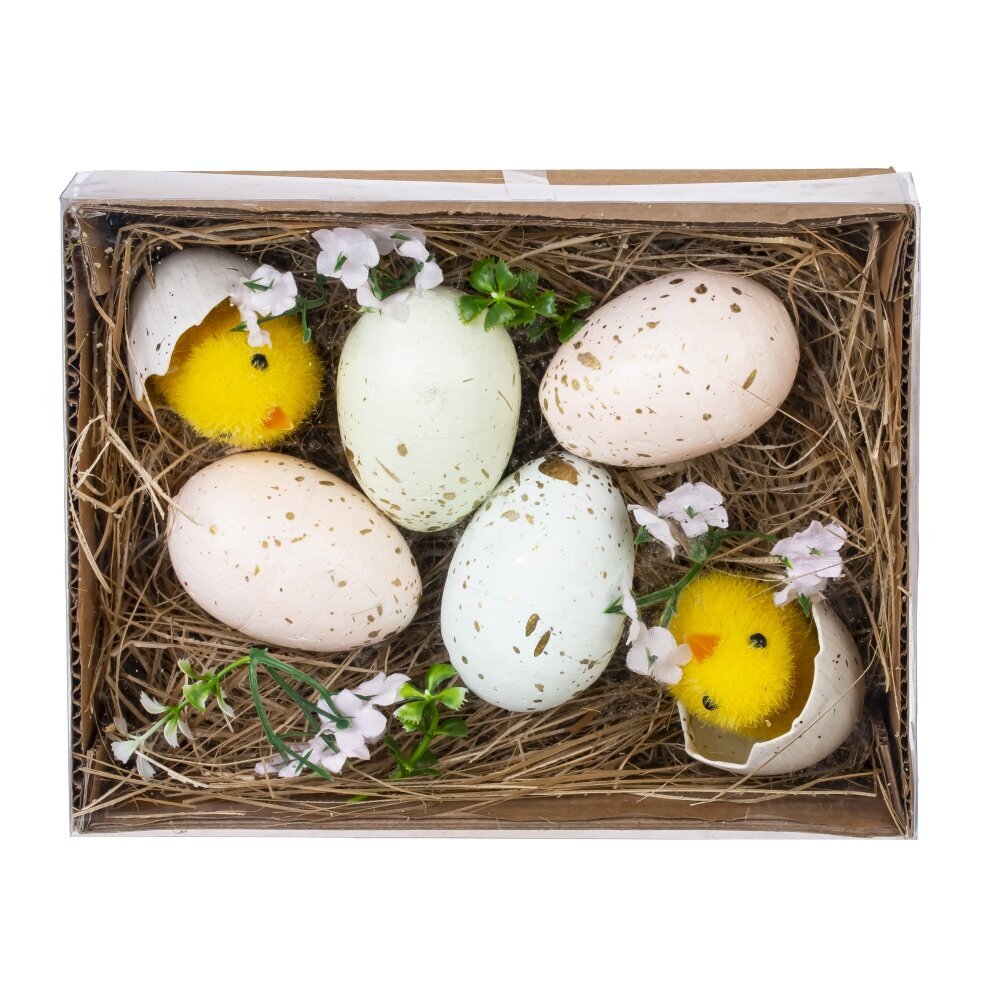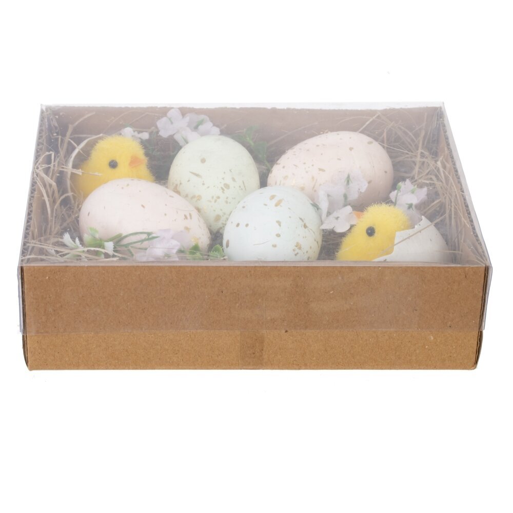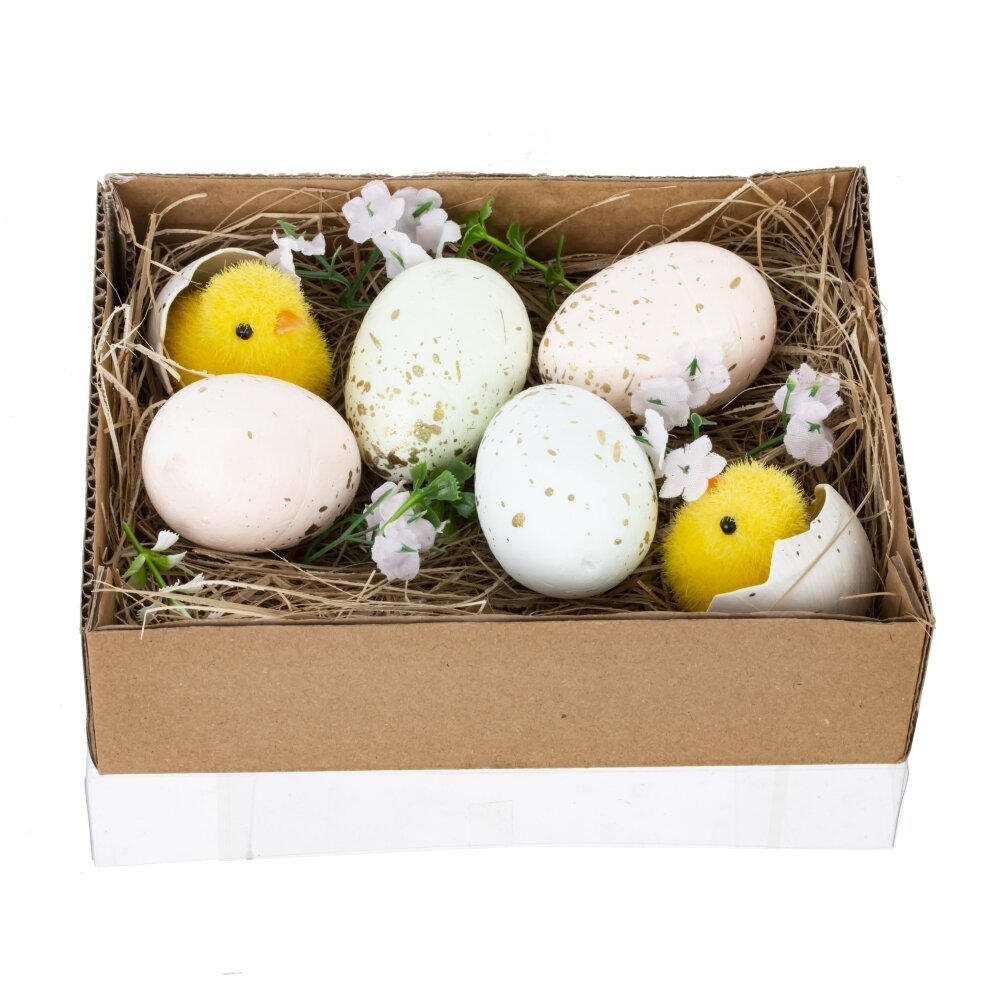 Изделие декоративное «Пасхальное» – стильный пасхальный набор для оформления праздничного стола и весеннего интерьера. В картонной коробке на подложке из натурального сухого наполнителя расположены декоративные яйца пастельных оттенков с краплением, а также милые жёлтые цыплята и нежные цветы. Сочетание полимерных материалов и натуральных элементов создаёт эффект настоящего птичьего гнезда и наполняет дом атмосферой светлого весеннего праздника. Композицию удобно ставить на подоконник, комод, полку или использовать как готовый пасхальный подарок родным, коллегам и друзьям.