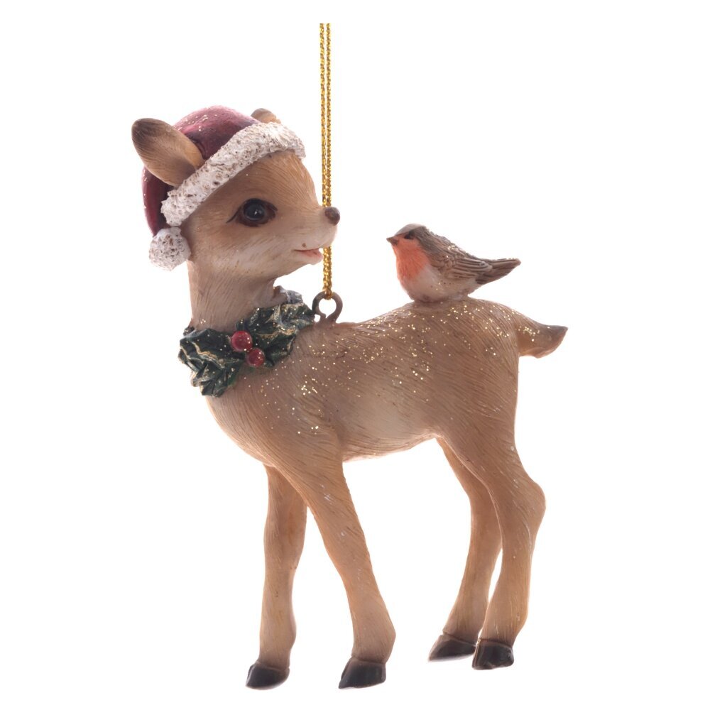 Декоративное подвесное украшение из полистоуна в виде олененка привлекает внимание своим изысканным исполнением и вниманием к деталям. Олененок, одетый в милую шапочку, нежным взглядом смотрит на маленькую птичку, устроившуюся у него на спине. Пастельные тона и изящная форма создают атмосферу уюта и гармонии, наполняя ваше пространство новогодним волшебством. Эта фигурка станет ярким акцентом на елке, добавляя нотку сказки и тепла в праздничный декор.