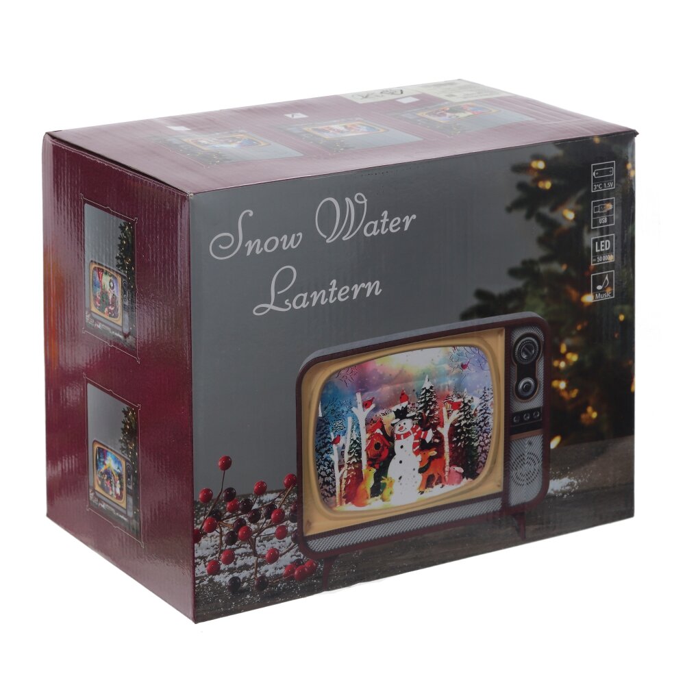 Декоративное изделие "Телевизор" в форме ретро-телевизора – это уникальный новогодний элемент декора, который обязательно добавит волшебства в ваш праздник. Внутри телевизора находится жидкость с серебряным глиттером, создающая мерцающий эффект, а также фигурки изображающие сцену Рождества, которые выполнены с невероятным вниманием к деталям. Три активные кнопки на панели позволяют включать подсветку, наслаждаться музыкой и наблюдать за эффектом вьюги, создавая атмосферу зимнего волшебства. Регулятор громкости дает возможность настроить уровень звука по вашему желанию.