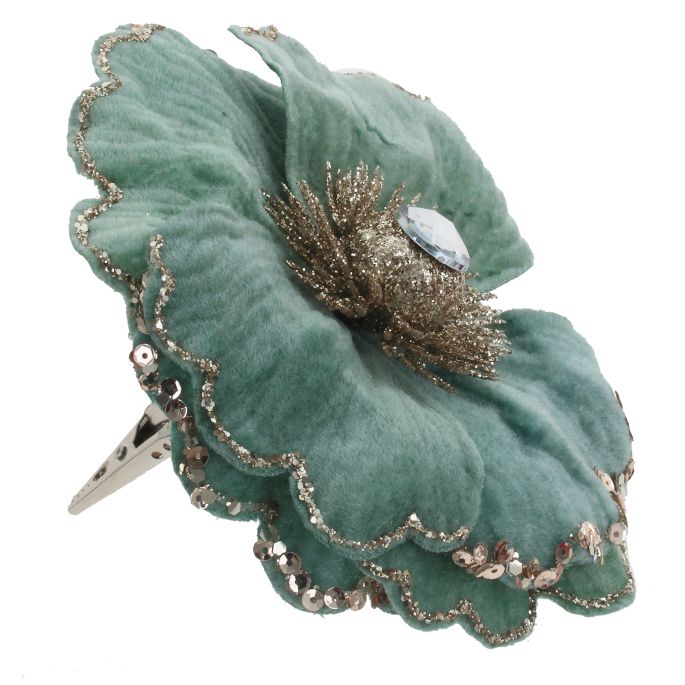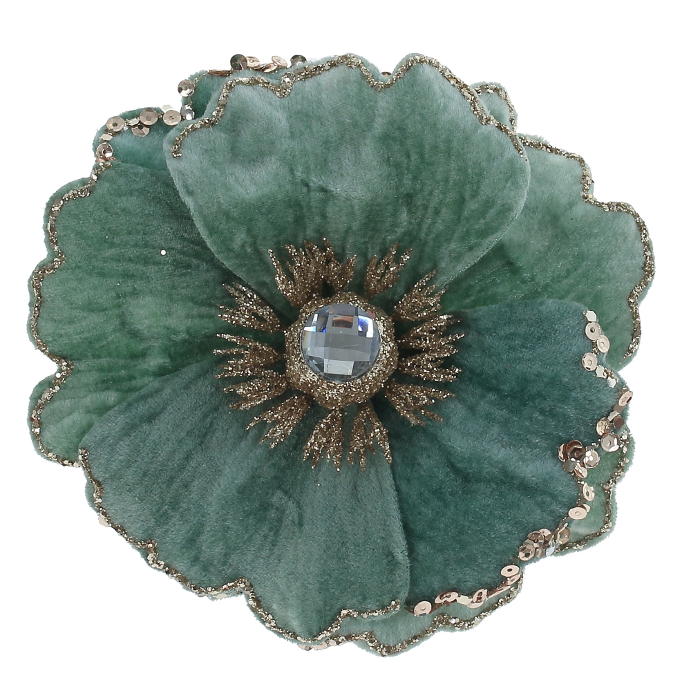 Объемный цветок с бархатными лепестками , с декором из блесток и красивой сердцевинкой. Прекрасное украшение для новогодней елки и флористических композиций.