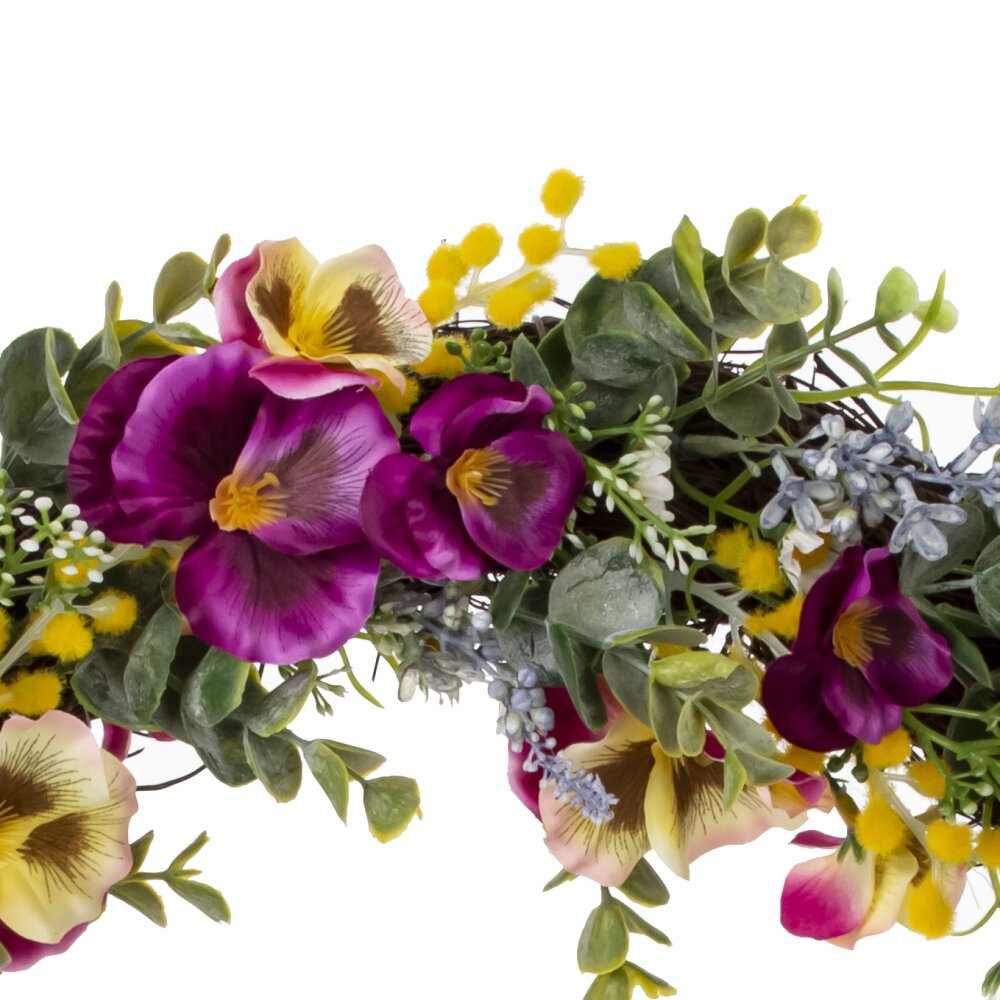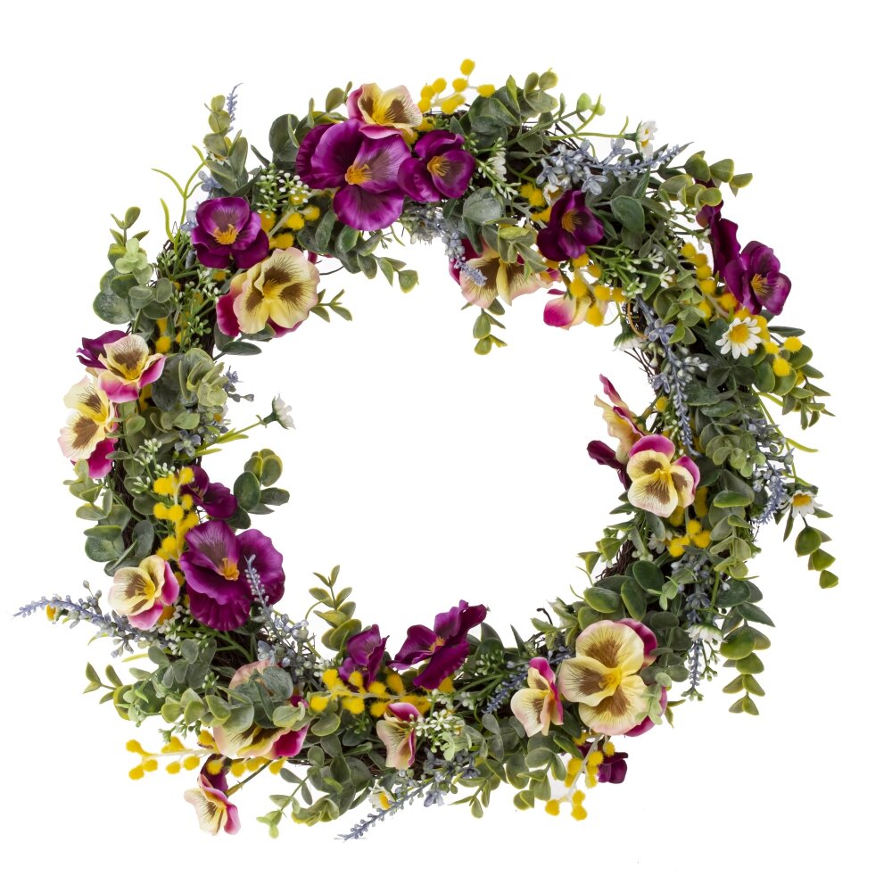 Декоративный венок диаметром 41 см станет стильным акцентом в вашем доме. Изготовленный из качественных материалов, венок впечатляет своим реалистичным внешним видом. Эта композиция сплетена из искусственных веток эвкалипта, которые придают венку свежесть и зелень, создавая эффект живого растения. Яркие цветы фиалки, ромашки и лаванды добавляют в композицию нотки романтики и уюта. Разнообразие текстур и оттенков делает венок универсальным декором, который идеально вписывается в различные стили интерьера: от классического до современного. Кроме того, венок можно использовать как самостоятельный элемент декора, или же сочетать с другими украшениями. Он прекрасно подойдет для оформления входной двери, стен или даже стола, создавая атмосферу тепла и радушия. С таким венком ваш дом наполнится жизнью и яркими эмоциями, а его реалистичный вид будет радовать вас и ваших гостей на протяжении всего года. Его можно оставлять в интерьере круглый год, что делает его практичным и стильным элементом декора для каждого сезона. Декоративный венок – это отличный способ добавить яркие акценты в ваше пространство и подчеркнуть индивидуальность вашего стиля!