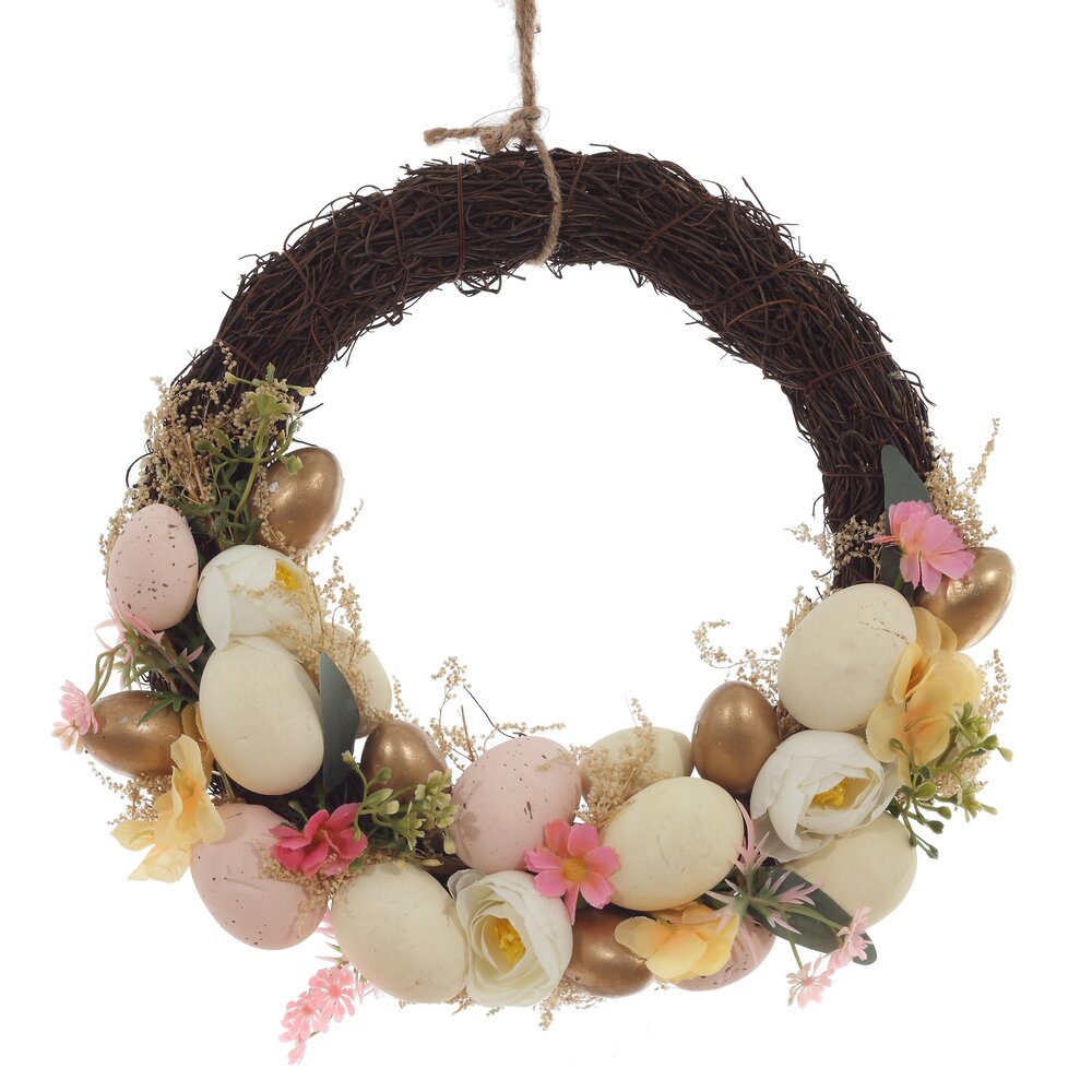 Декоративное изделие «Венок пасхальный» — стильный акцент для весеннего интерьера и праздничного оформления к Пасхе. Основа выполнена из натуральных веточек, которые придают композиции фактурность и ощущение природной свежести. Венок украшен легкими полимерными яйцами пастельных и золотистых оттенков, дополняющими друг друга и создающими атмосферу торжества.Цветы и зелень из полимерных и натуральных материалов гармонично вписаны в дизайн, выглядят как живые и не требуют ухода. Венок можно подвесить на дверь, стену, над камином или использовать в качестве центрального украшения праздничного стола. Прочная петелька обеспечивает удобное крепление, а устойчивые материалы сохраняют форму и яркость красок из года в год. Идеальное украшение для тех, кто хочет создать уют и праздничное настроение к Пасхе.